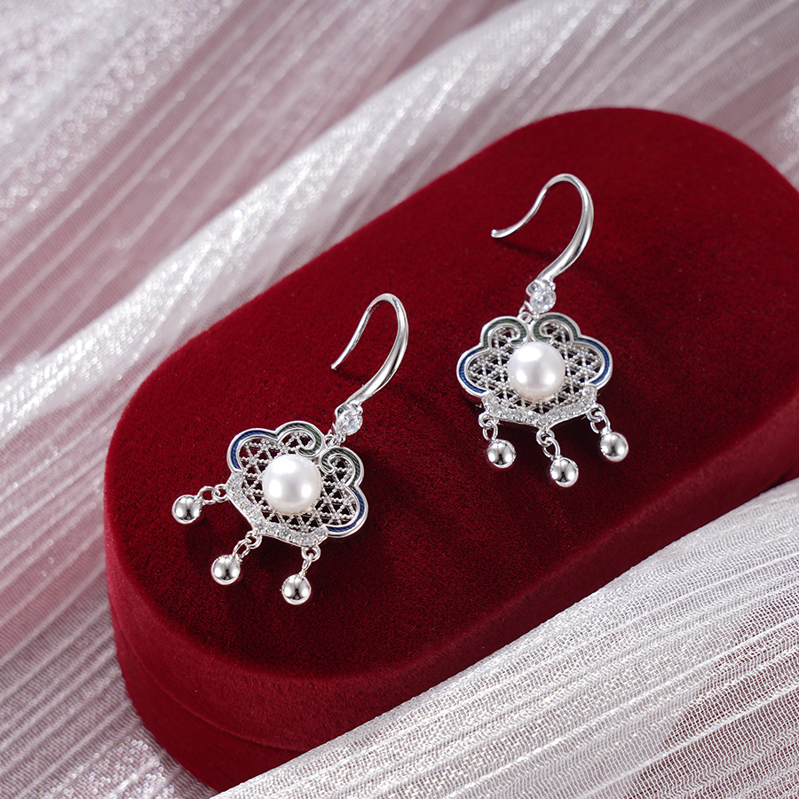 【寓意】:耳饰以如意锁为灵感设计,中心镶嵌珍珠,与流苏银珠巧妙呼应,营造出如梦如幻之感。搭配新中式裙装,典雅优美,袅娜明艳。