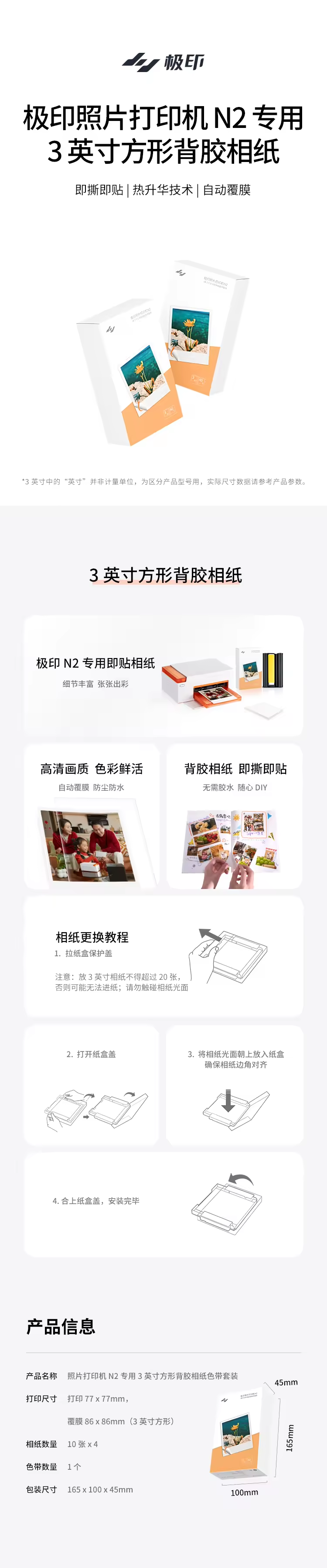 JIYIN 极印 照片打印机 N2 耗材 3 寸 方型彩色相纸套装 40 张装