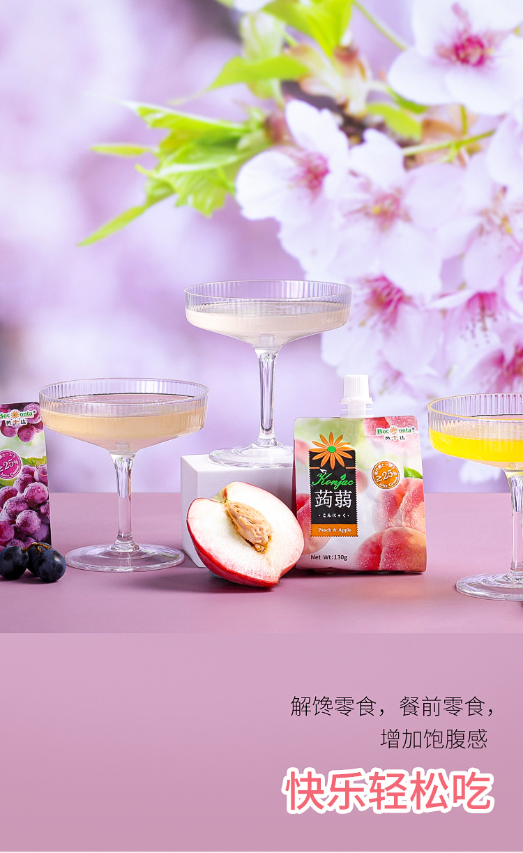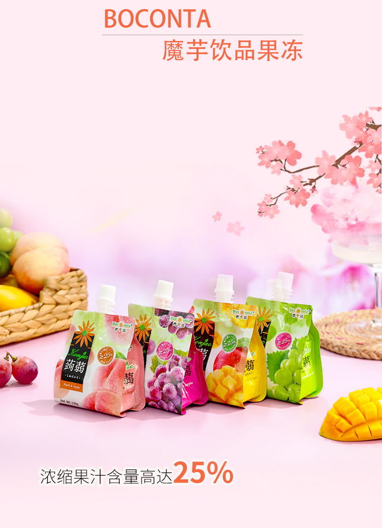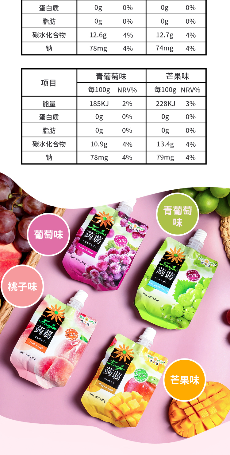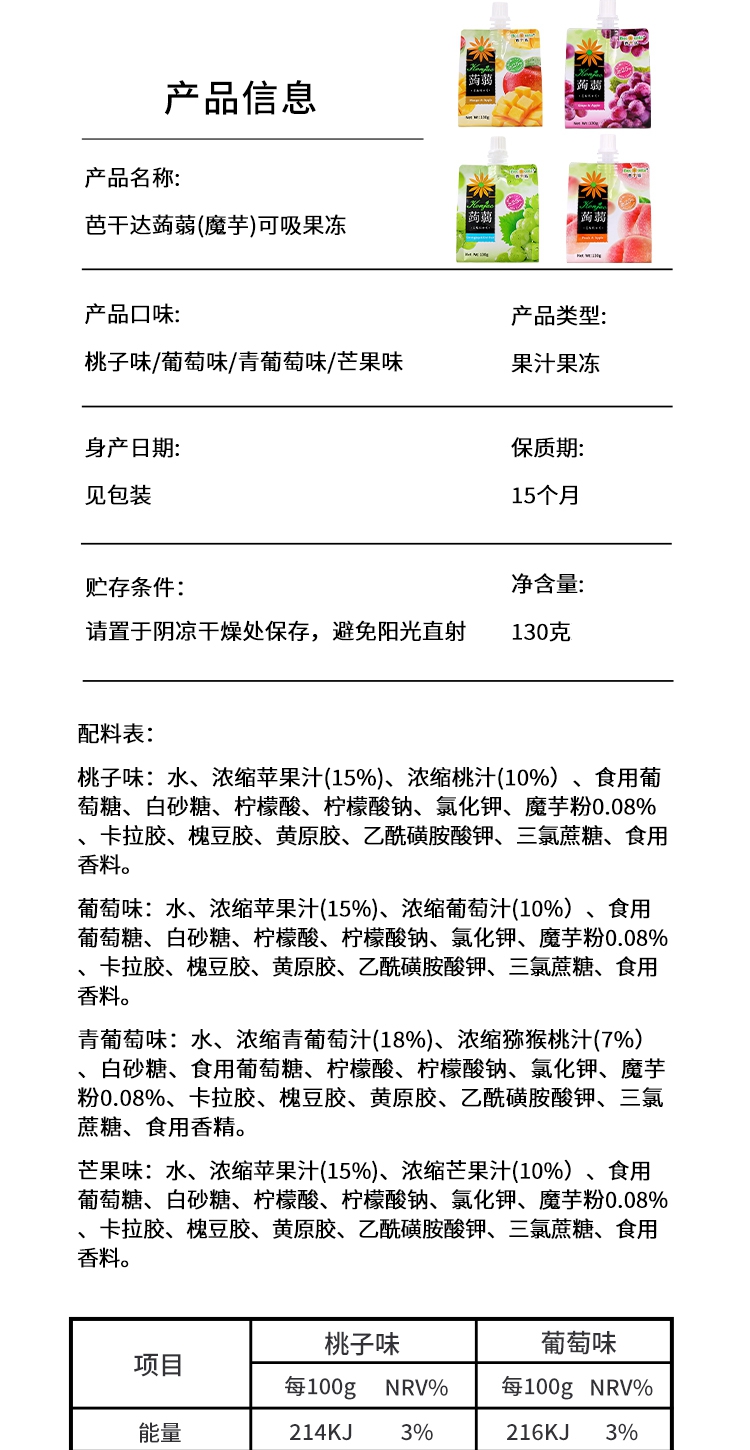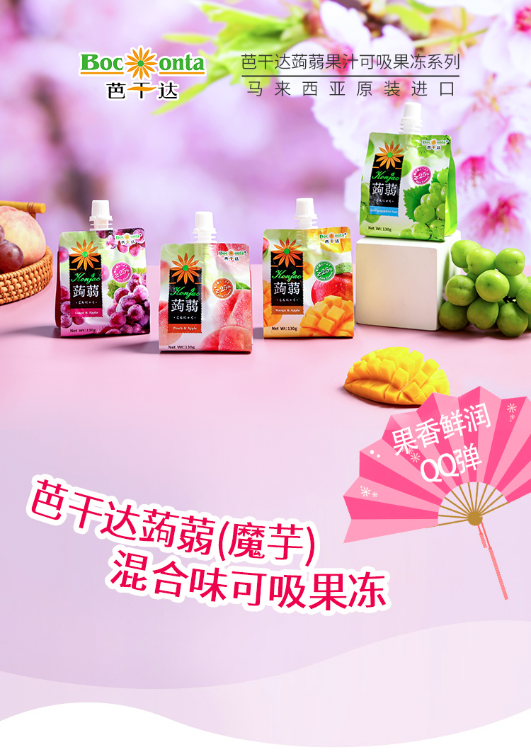 芭干达蒟蒻(魔芋)芒果苹果汁/葡萄苹果果汁/桃子苹果果汁可吸果冻130g 便于携带的软包装爽滑Q弹 059104/059103/059102