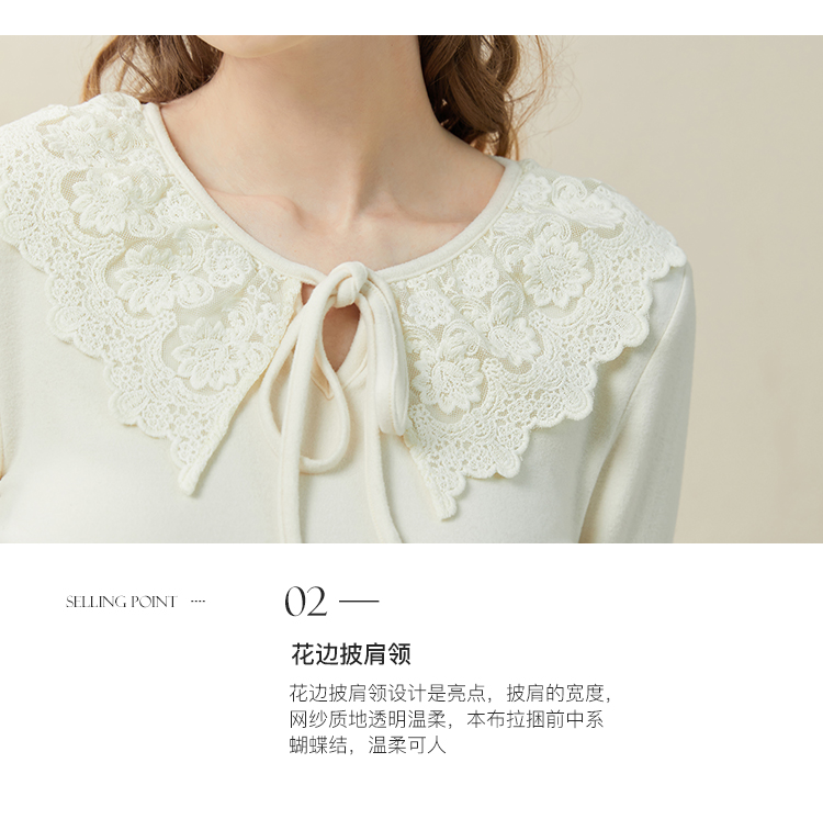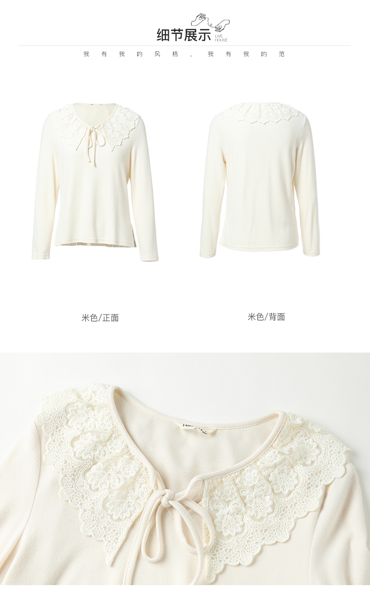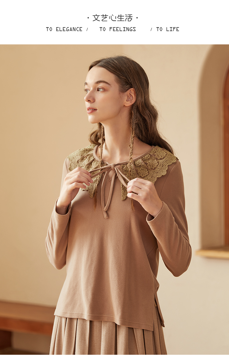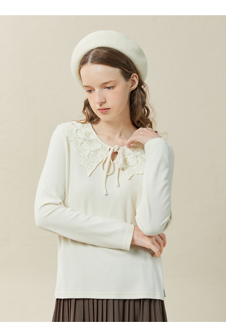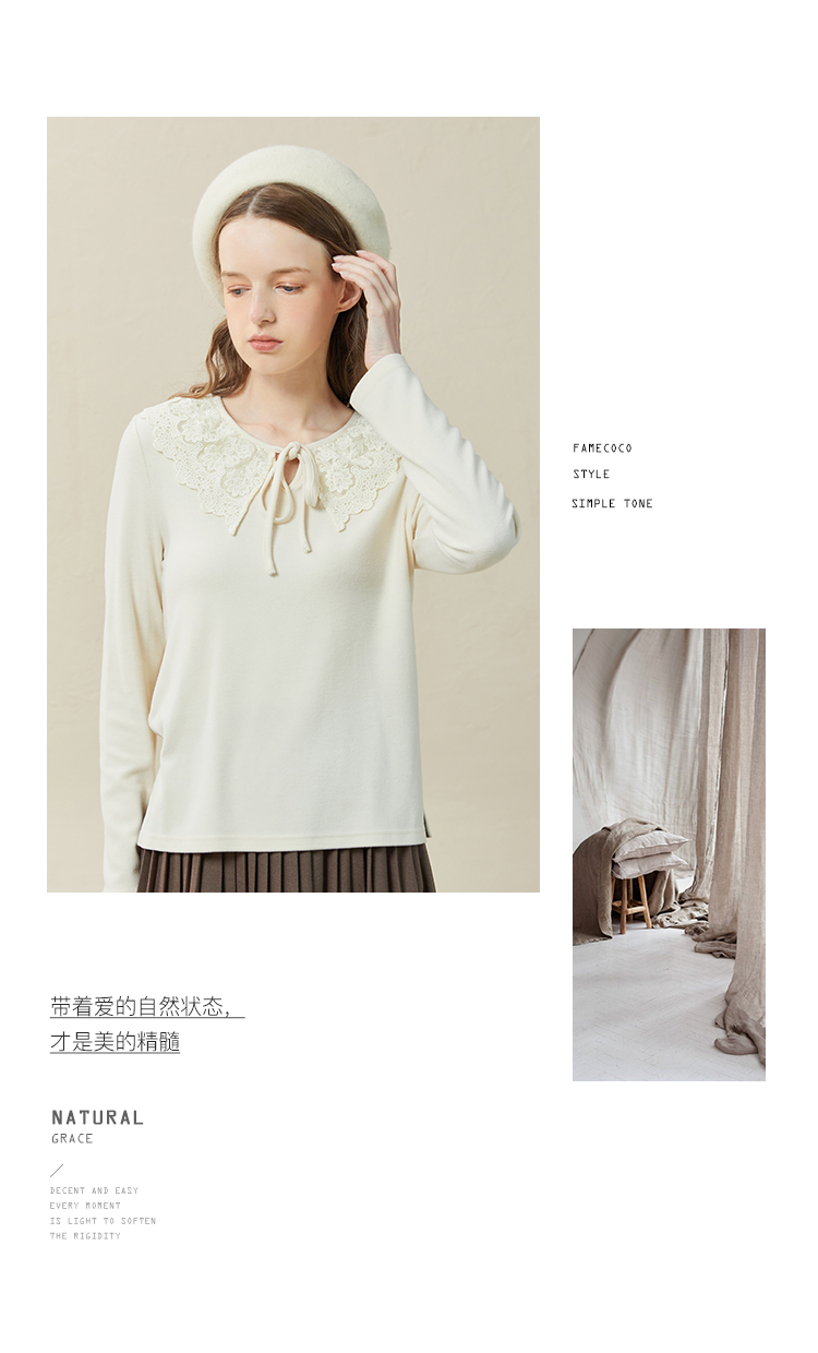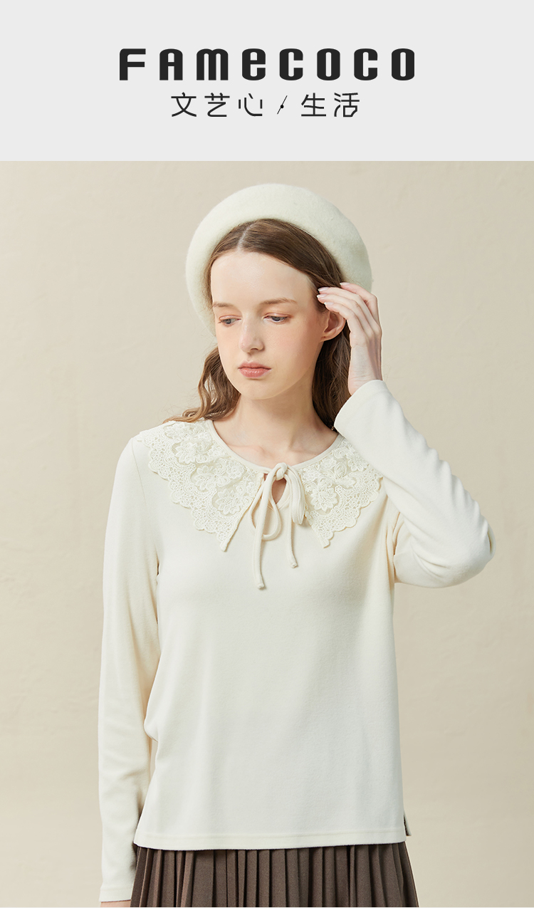 Famecoco范可儿蝴蝶结打底衫女秋冬款花边领高弹磨毛针织t恤F228BB011