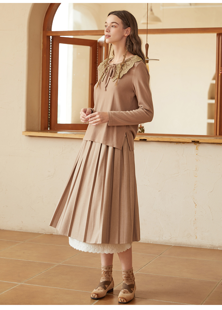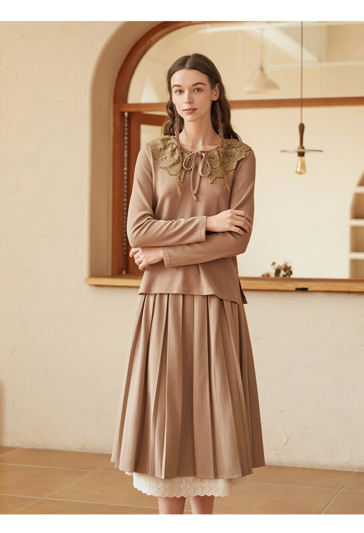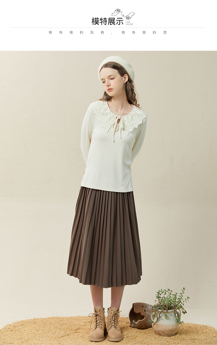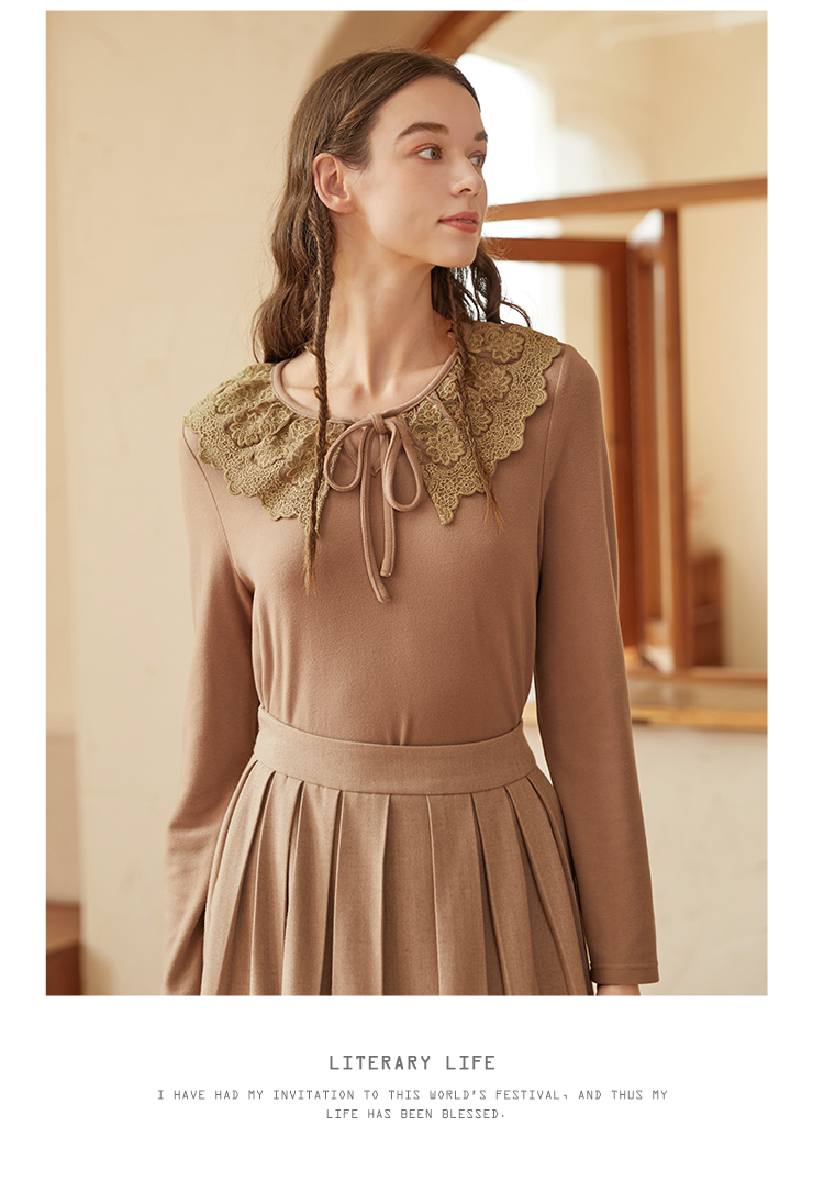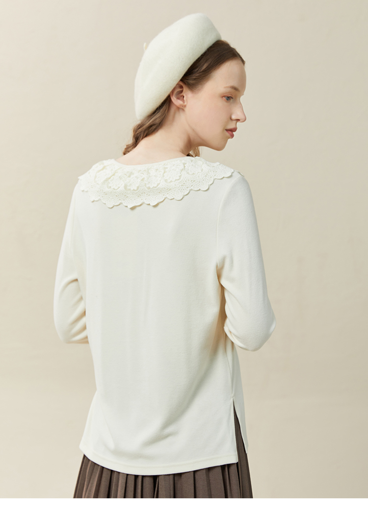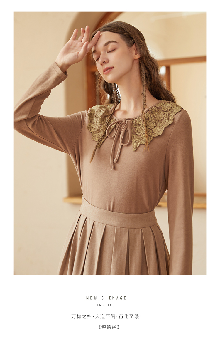 Famecoco范可儿蝴蝶结打底衫女秋冬款花边领高弹磨毛针织t恤F228BB011