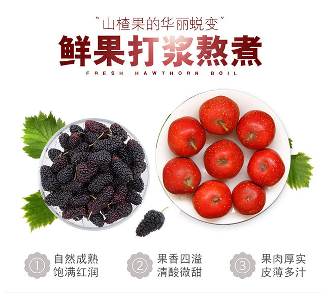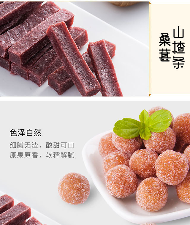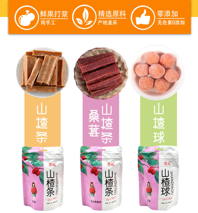 我们的山楂条软硬适中,初入口的酸爽清新提神,唤醒味蕾,之后丝丝甘甜萦绕舌尖,开胃生津,唇齿留香、三个口味任君选择。