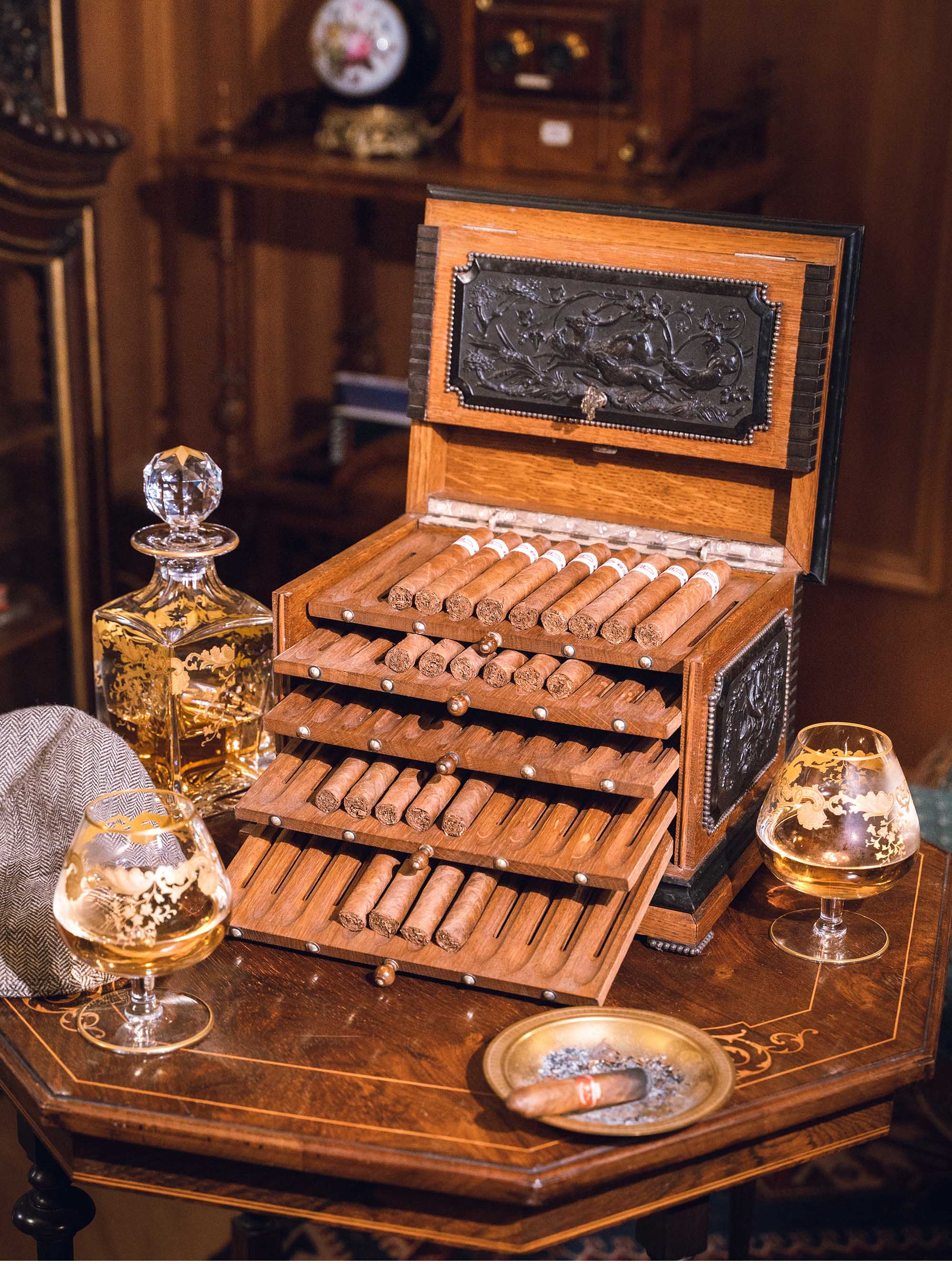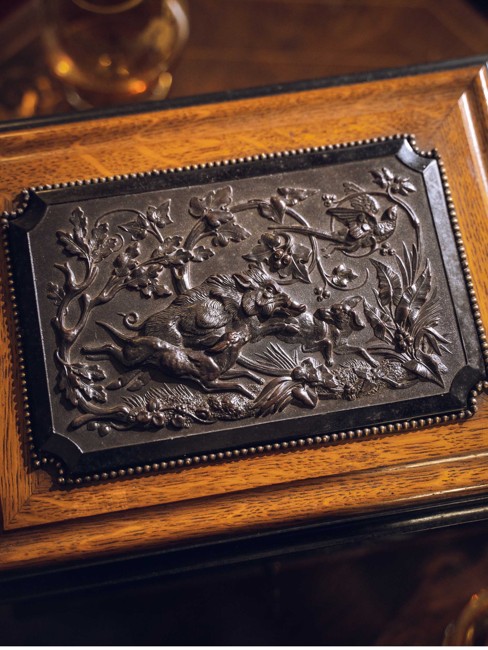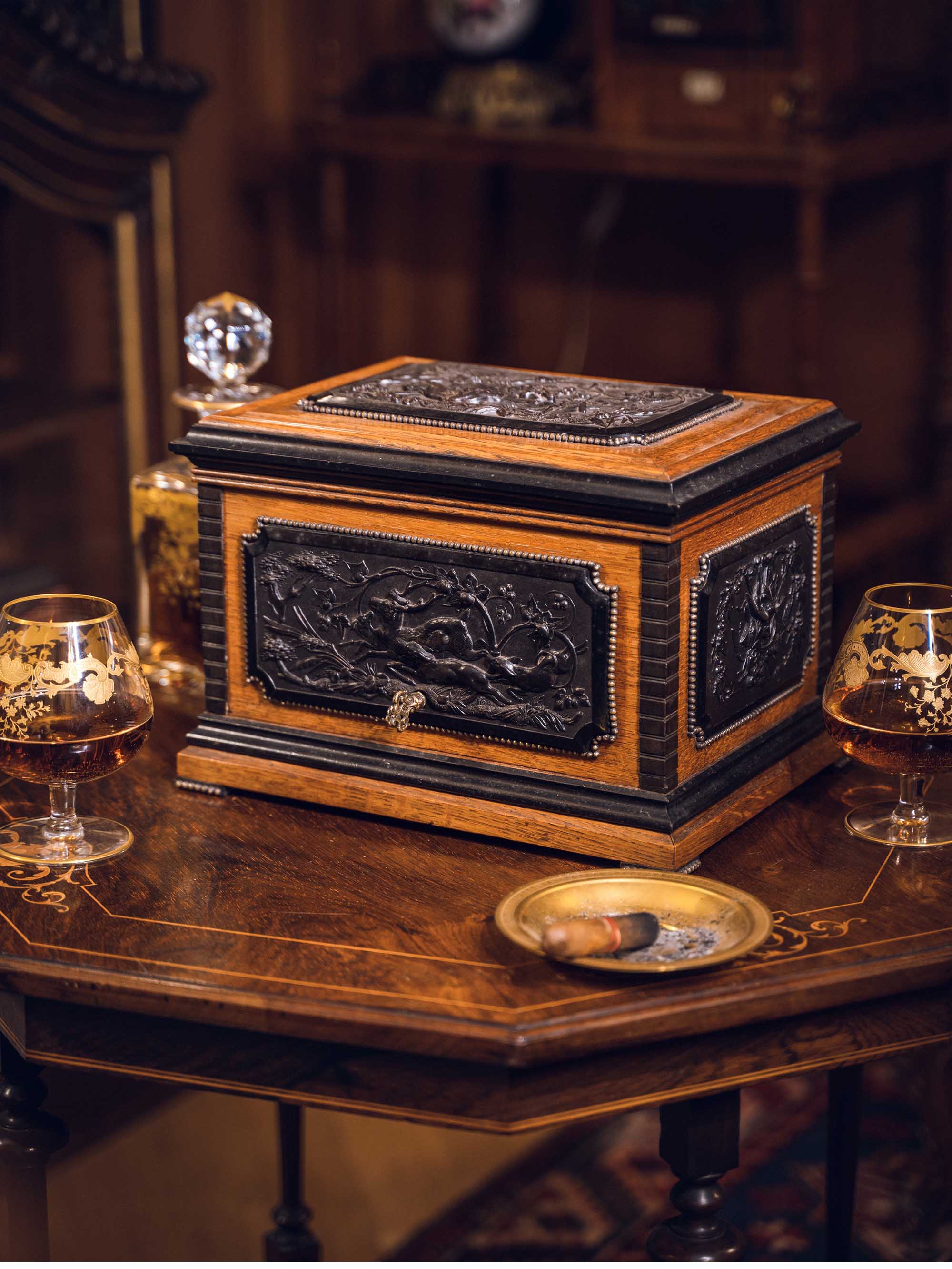 19世纪欧洲出品林中兽鸟主题铸铁精雕镶嵌多层硬木雪茄盒