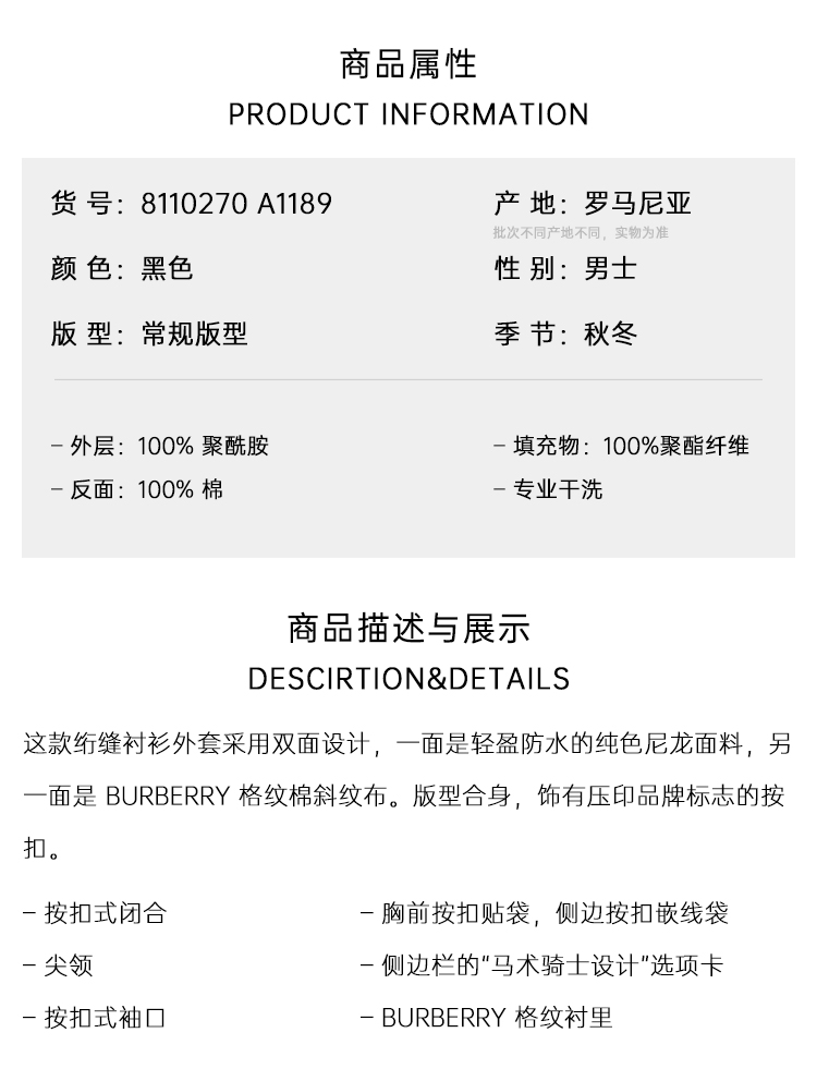 BURBERRY 巴宝莉 男士双面绗缝尼棉服 黑色 8110270 A1189