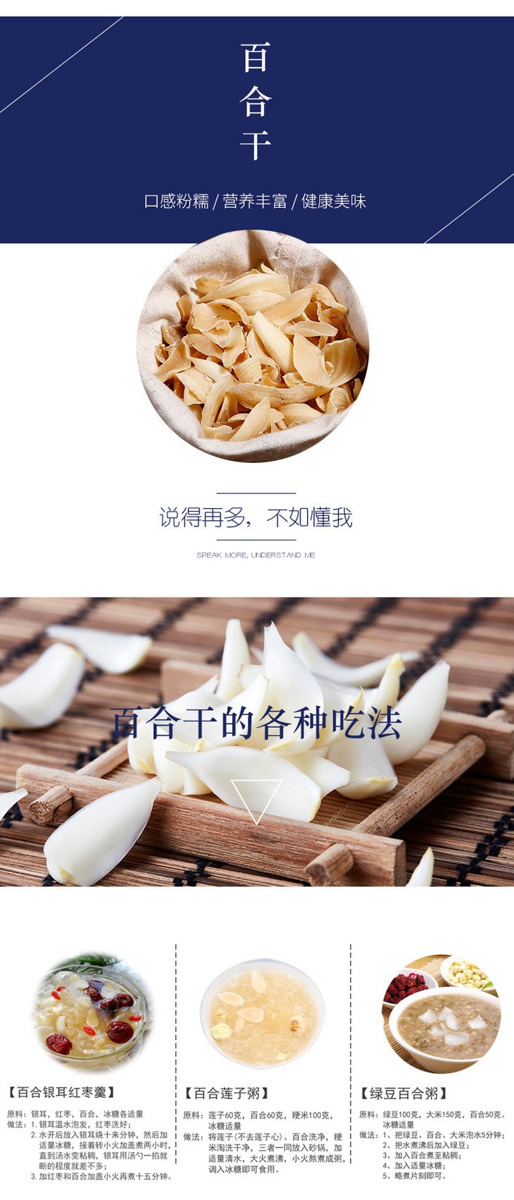 3.烹饪前,请提前把百合干泡发,呈现鲜百合原状。煲汤、煮粥时,建议在最后20-30分钟放入泡发的百合干,炖煮时间过久容易融化、不成型。
