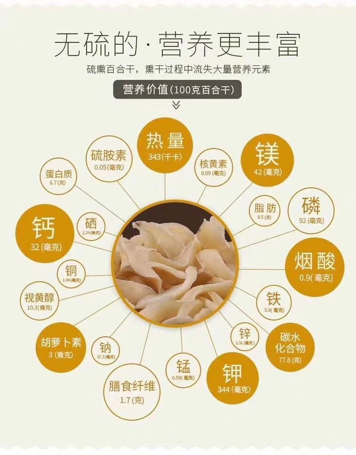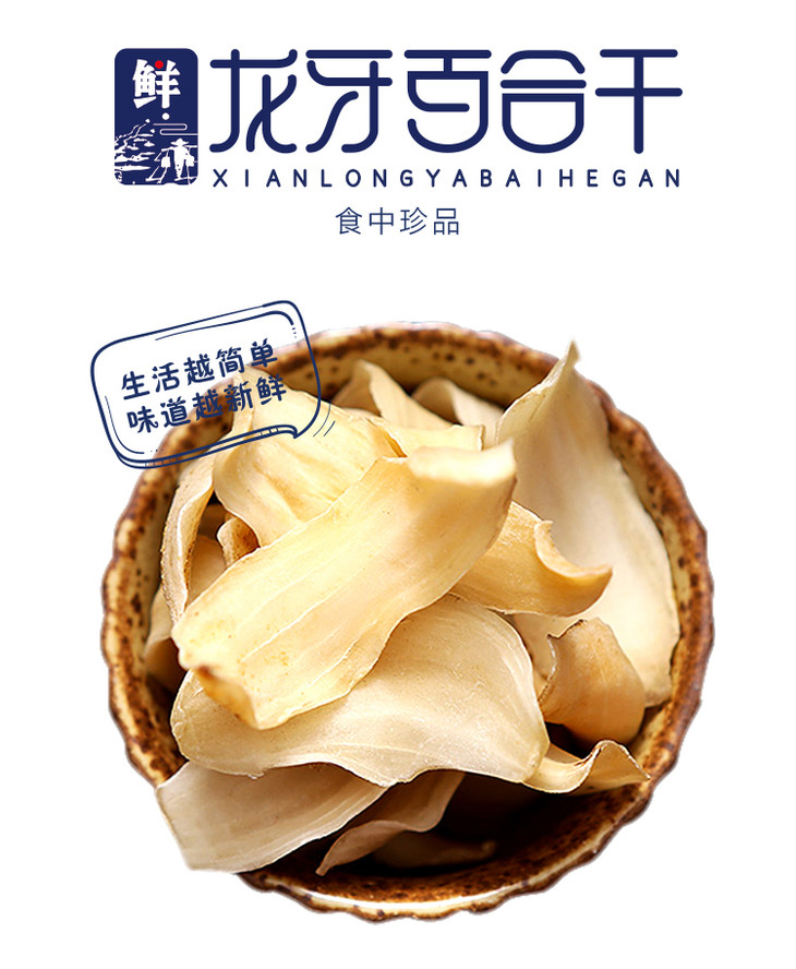 1.正宗龙牙百合干,全程不熏硫、不漂白。我们坚持自然干燥,采用半烘干结合阳光晒干的方式,日光照射加深了色泽,百合干外观偏黄属于正常现象。