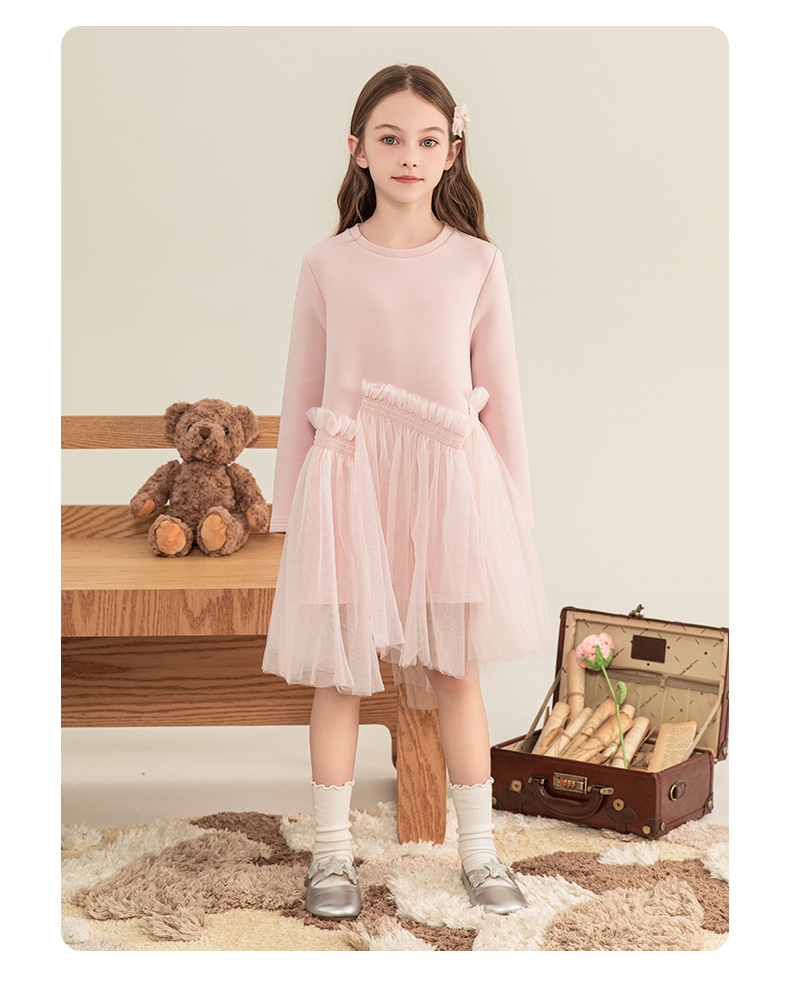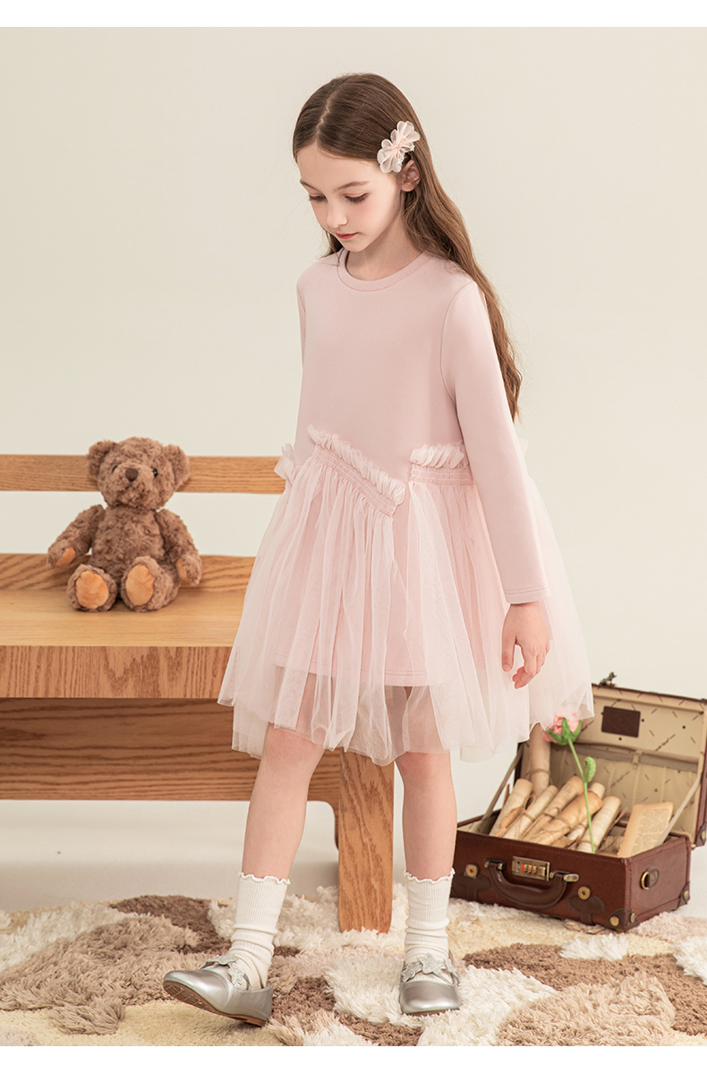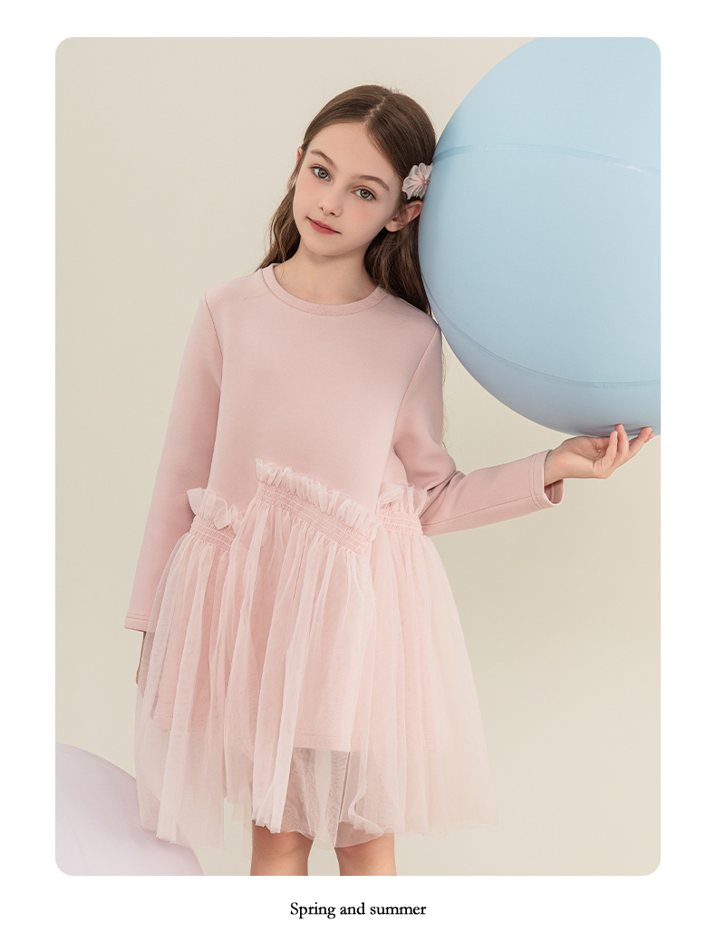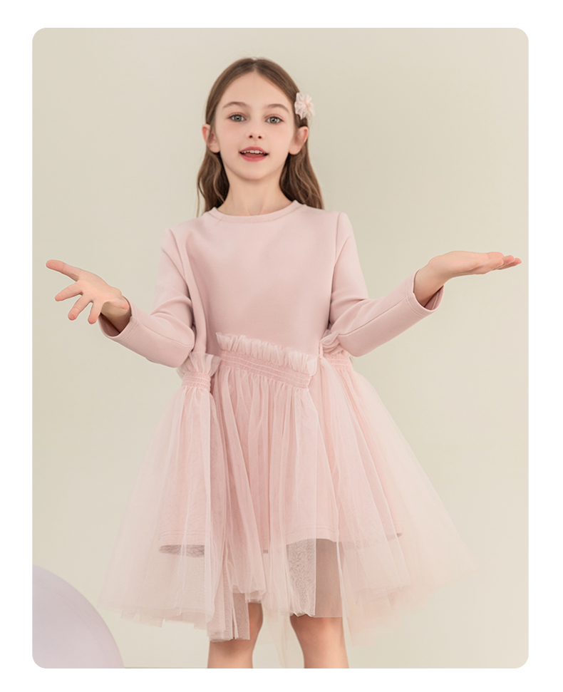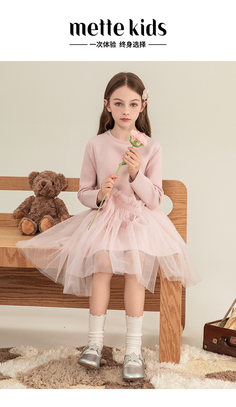 mettekids女童连衣裙2023秋季新款儿童公主裙中大童粉色甜美裙子