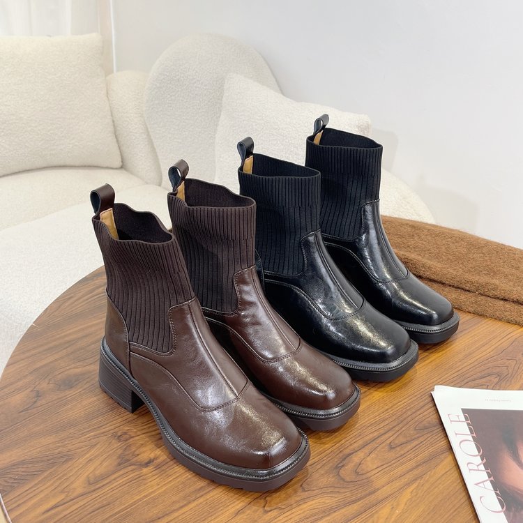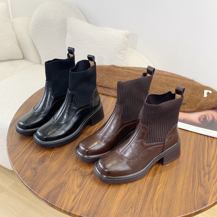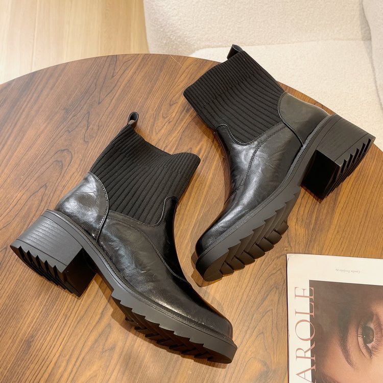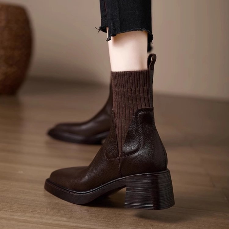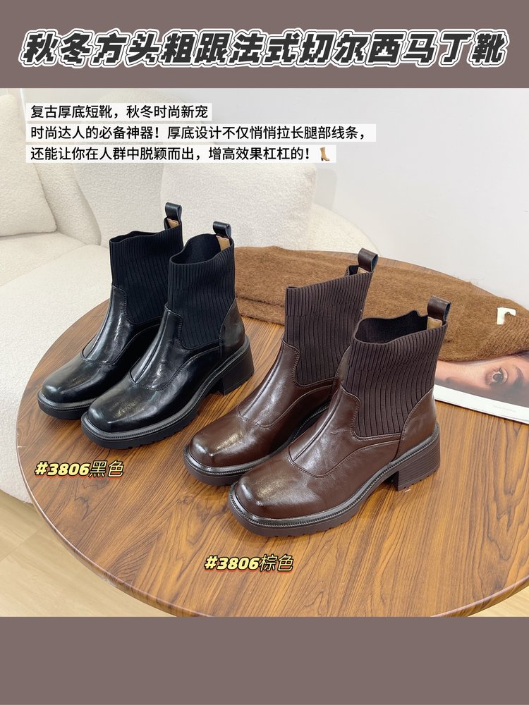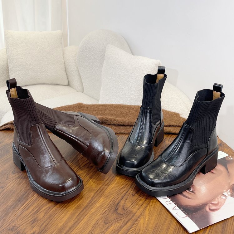 【秋冬真皮粗高跟切尔西马丁靴】复古厚底短靴,秋冬时尚新宠!法式方头设计,脚口弹力袜靴!穿脱便捷,百搭不挑人!【KH-J】