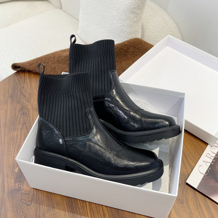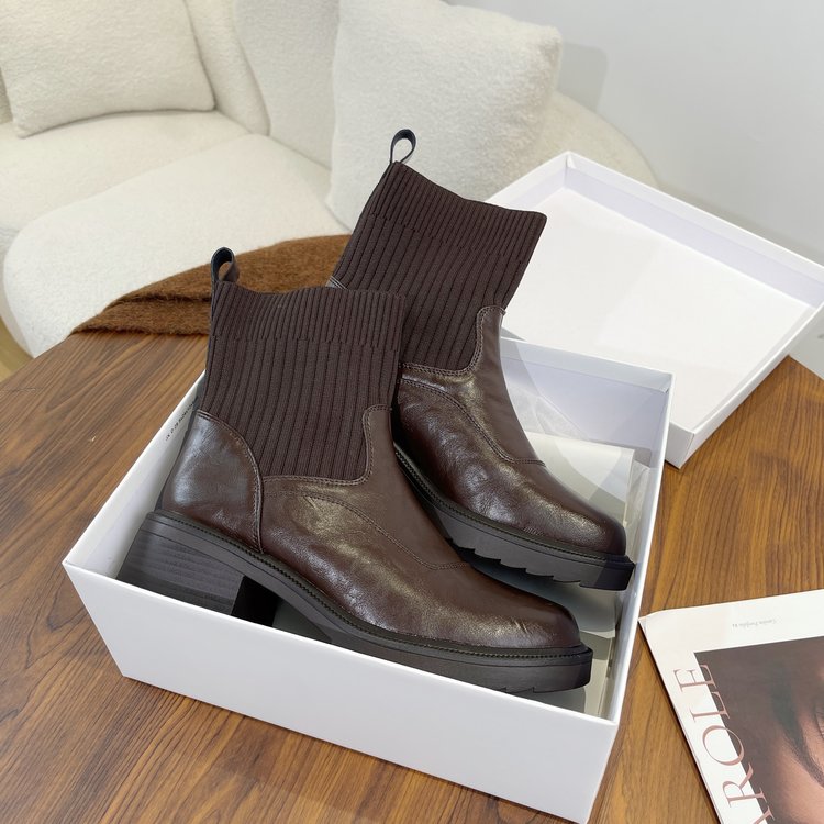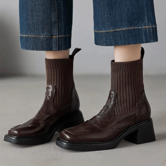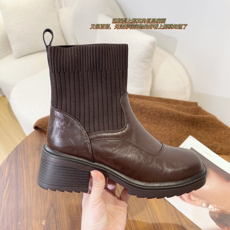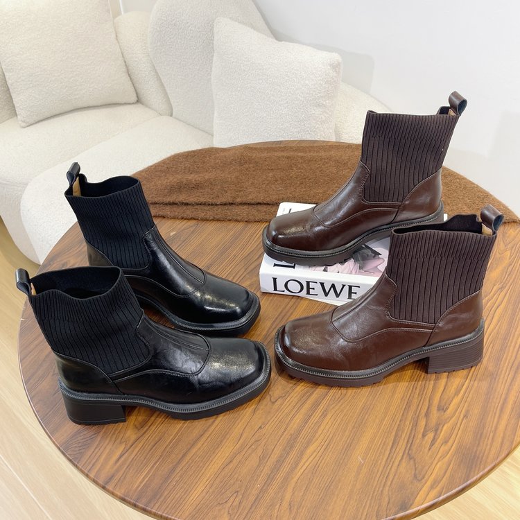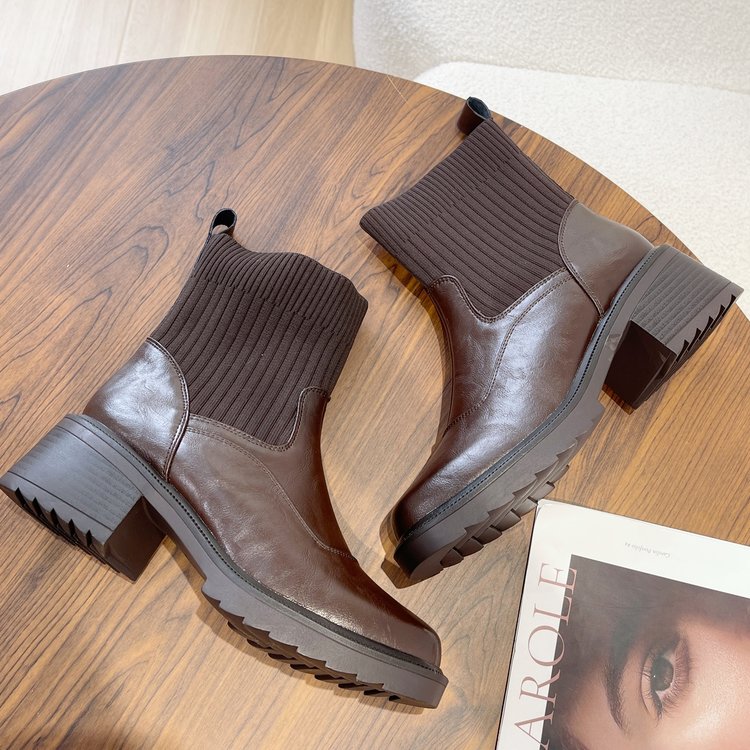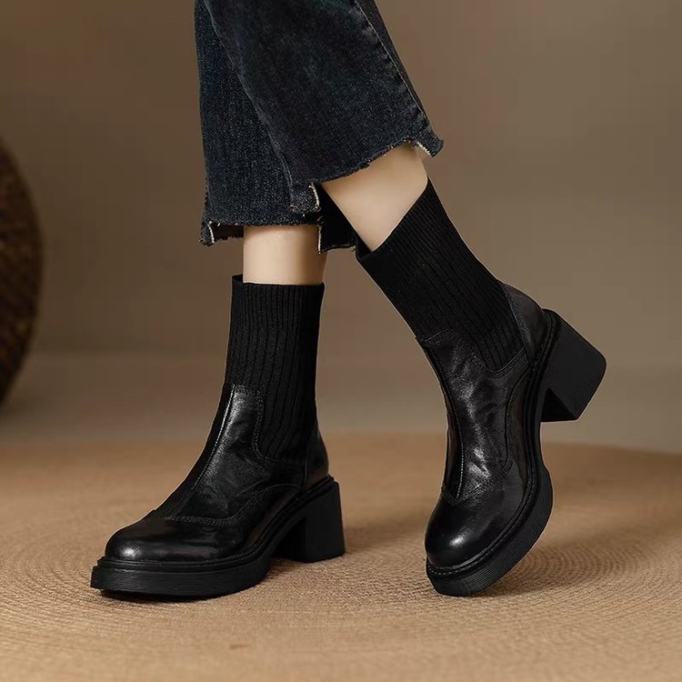 【秋冬真皮粗高跟切尔西马丁靴】复古厚底短靴,秋冬时尚新宠!法式方头设计,脚口弹力袜靴!穿脱便捷,百搭不挑人!【KH-J】