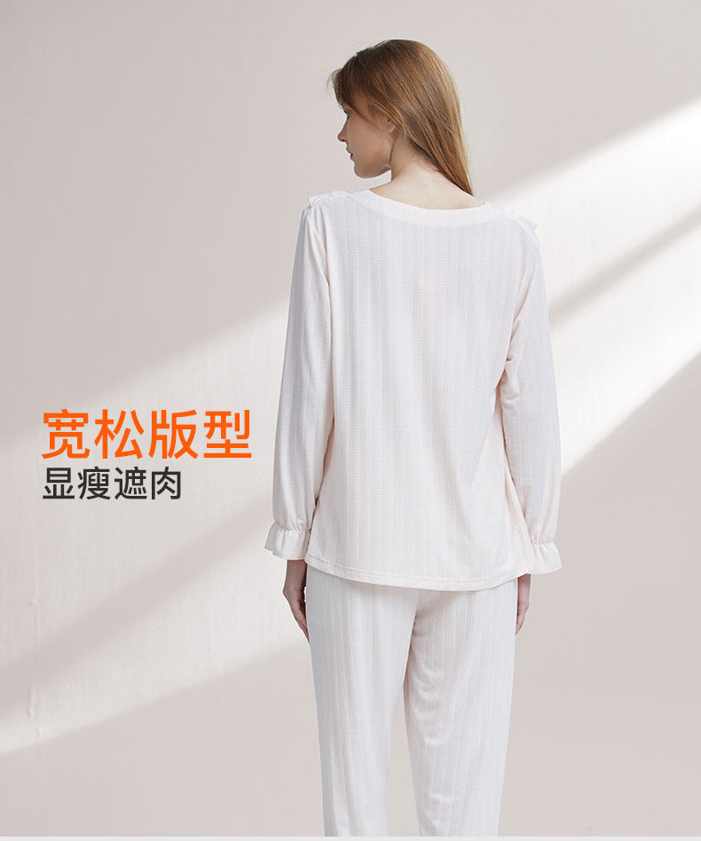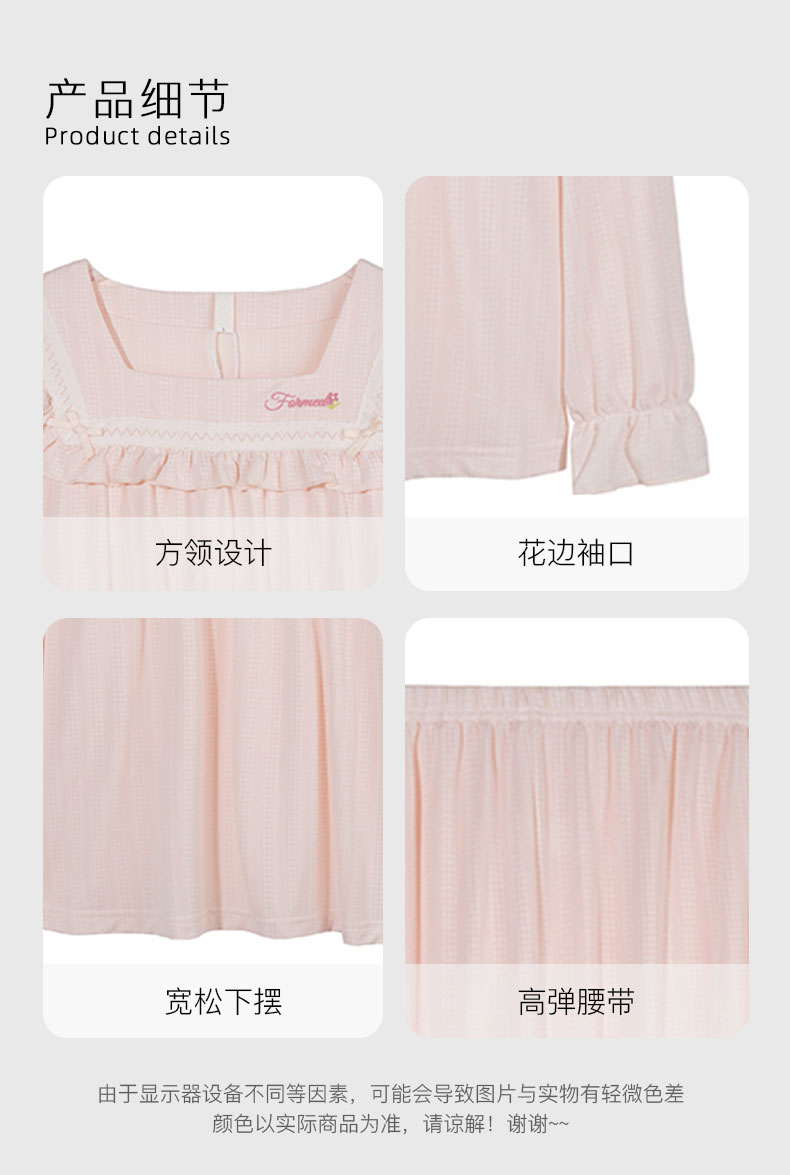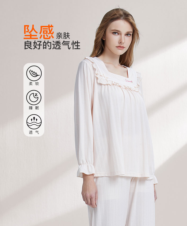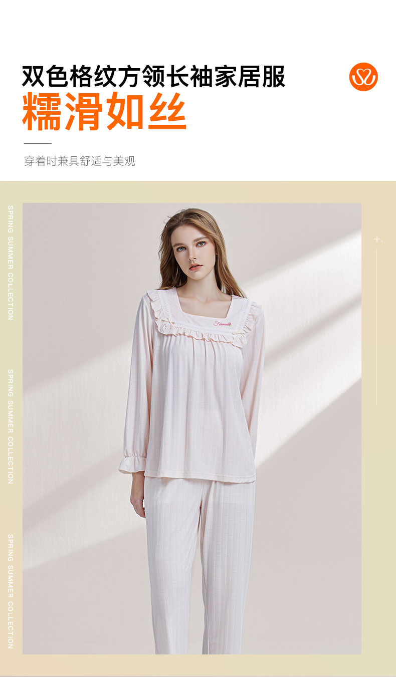 【7.5折限时特惠】【秀黛】女方领针织长袖套装细腻糯滑坠感亲肤双色格纹提花领口花边浅豆绿春夏女睡衣家居服W1551004T【门店同款】