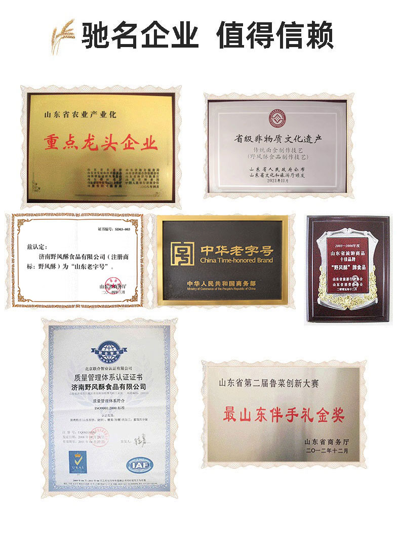 - 济南野风酥食品有限公司是一家从事绿色无公害农产品深加工,生产山东特产食品的企业。职工总人数586人,其中高中级技术人员56人。2007年济南野风酥食品有限公司被山东省人民政府授予省级农业产业化经营重点龙头企业。我公司生产的糖酥煎饼等系列产品曾连续获农业部、山东省优质产品奖,被人民大会堂定为国宴用品。“九顶塔”牌商标获得“省优”“部优”商标称号。全国著名的营养学家于若木曾来厂视察并亲笔题词,姜春云、苏毅然等国家、省级领导先后来厂视察。“野风酥”被中国食品协会评为“优秀民族食品”,获得“中华名吃”称号。产品连续获得国家级食品展销会的畅销产品奖,成为山东省的特色食品,省、市旅游局的十佳旅游商品。“山东煎饼”和“山东烧饼” 被认证为绿色食品。