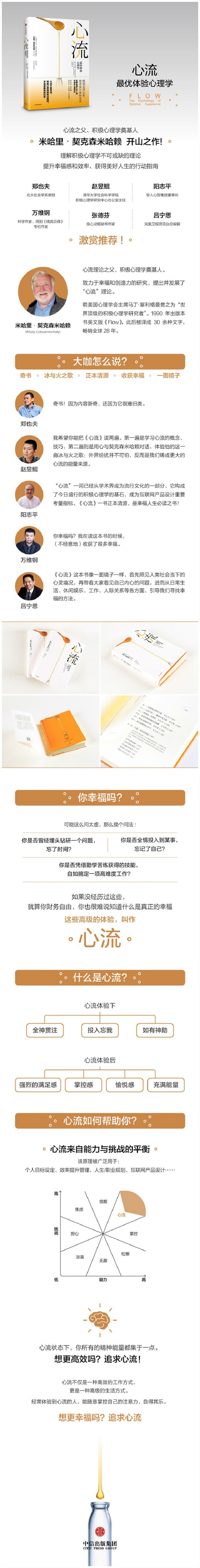 经过近五十年的发展,心流一词已经从学术界成为流行文化的一部分。它构成了今日盛行的积极心理学基石,成为互联网产品设计重要考量指标。契克森米哈赖的《心流》一书正本清源,以原创者身份回答了心流是什么,心流有什么意义,如何获得心流等。这本书也是幸福人生必读之书,当下的快乐是什么?幸福的真相是什么?人生的意义是什么?相信各位读者会开卷有益。