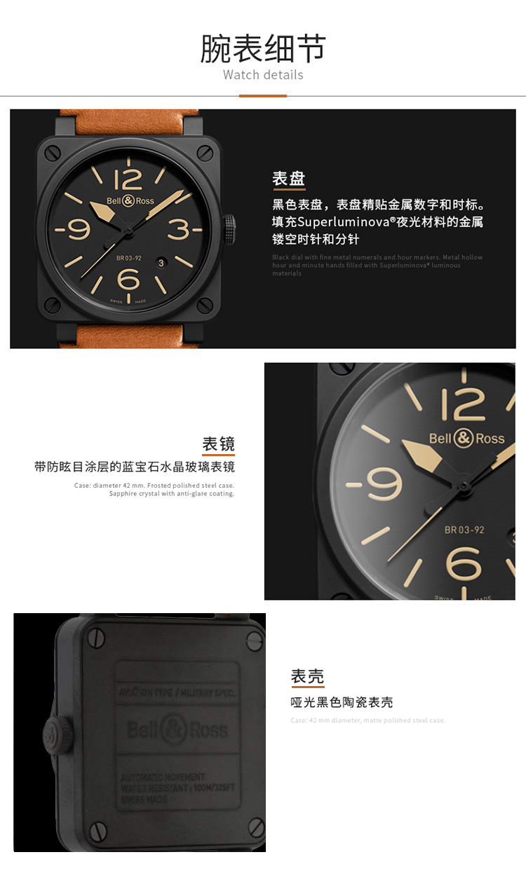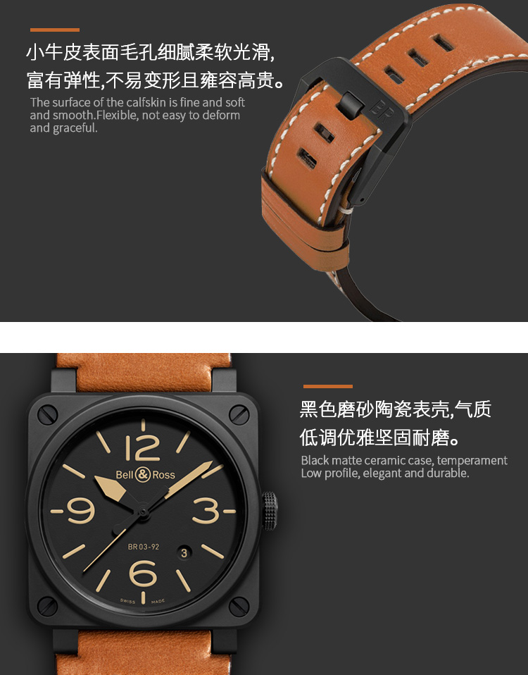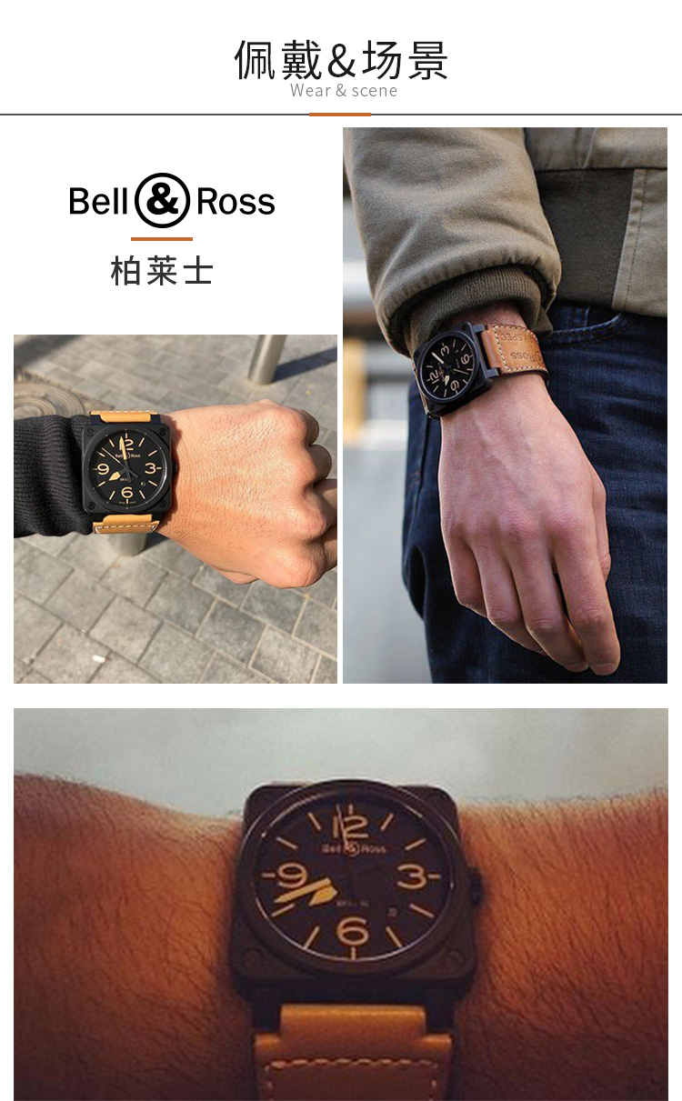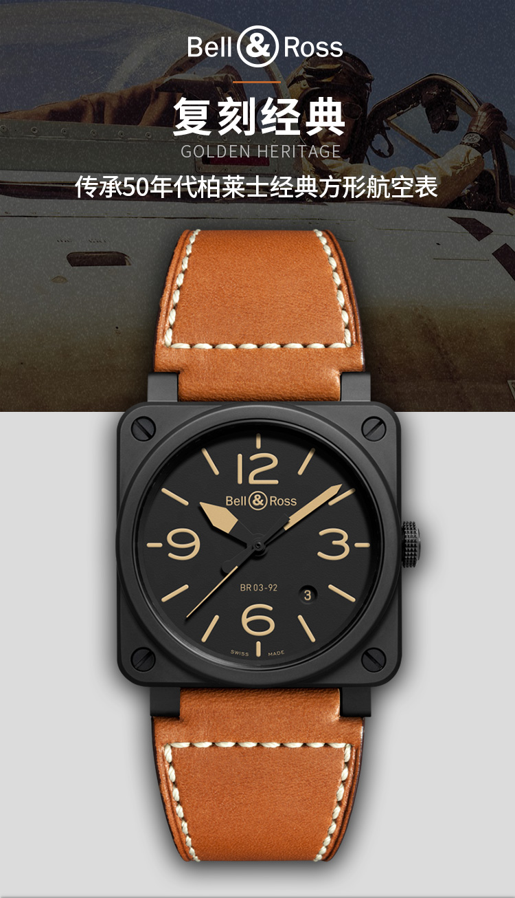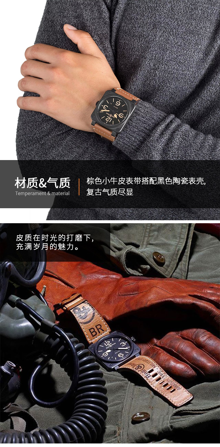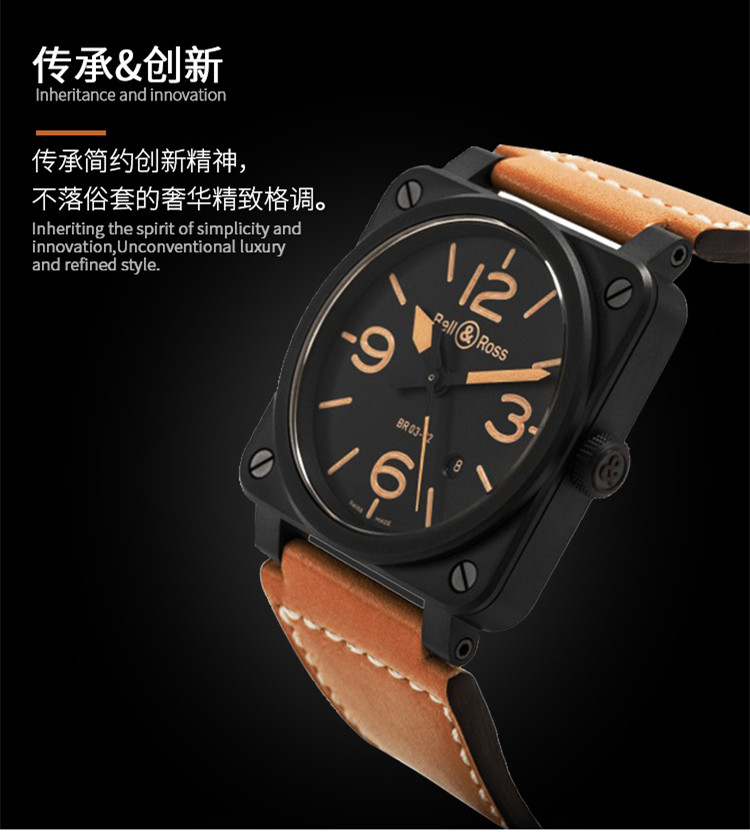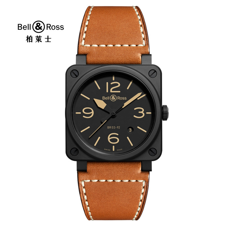 Bell & Ross 柏莱士经典方形表瑞士全自动机械手表陶瓷男士商务腕表 BR0392-HERITAGE-CE