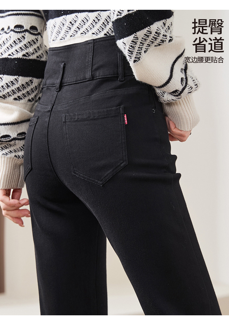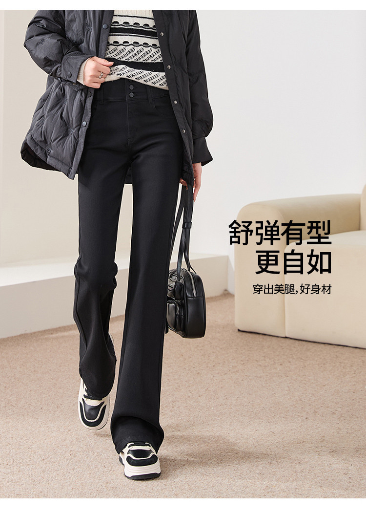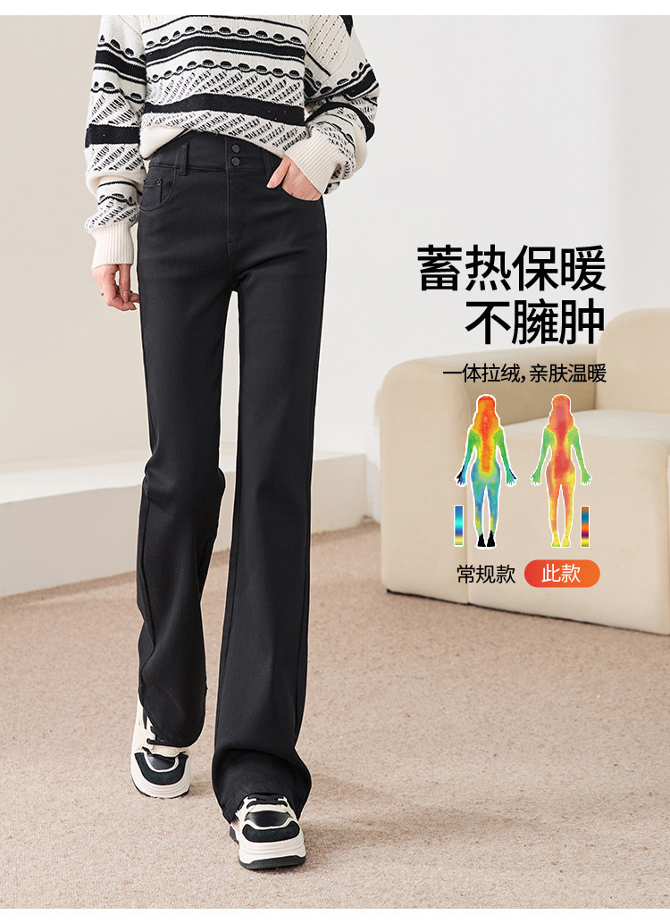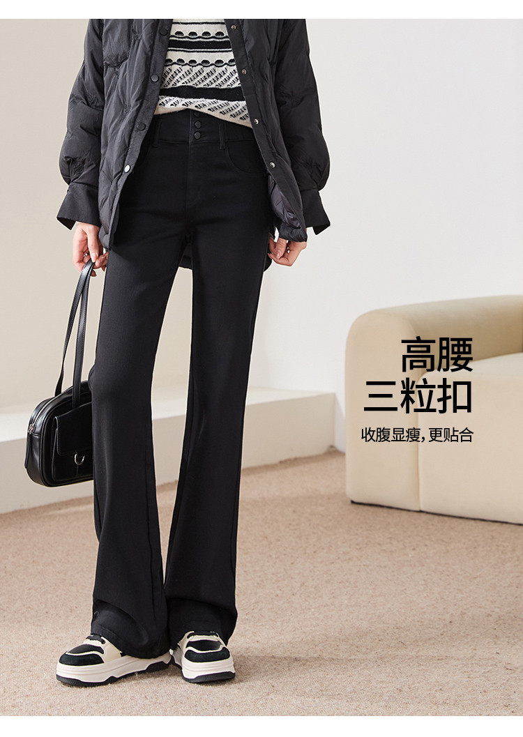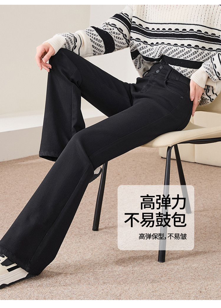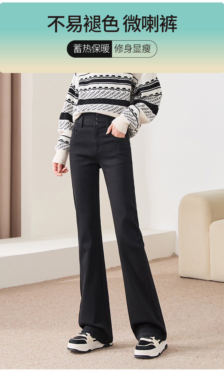 【高腰-加绒-微喇牛仔】逸阳冬不易褪色薄绒黑色高腰三粒扣牛仔裤4427B1