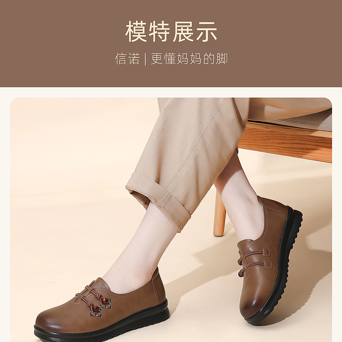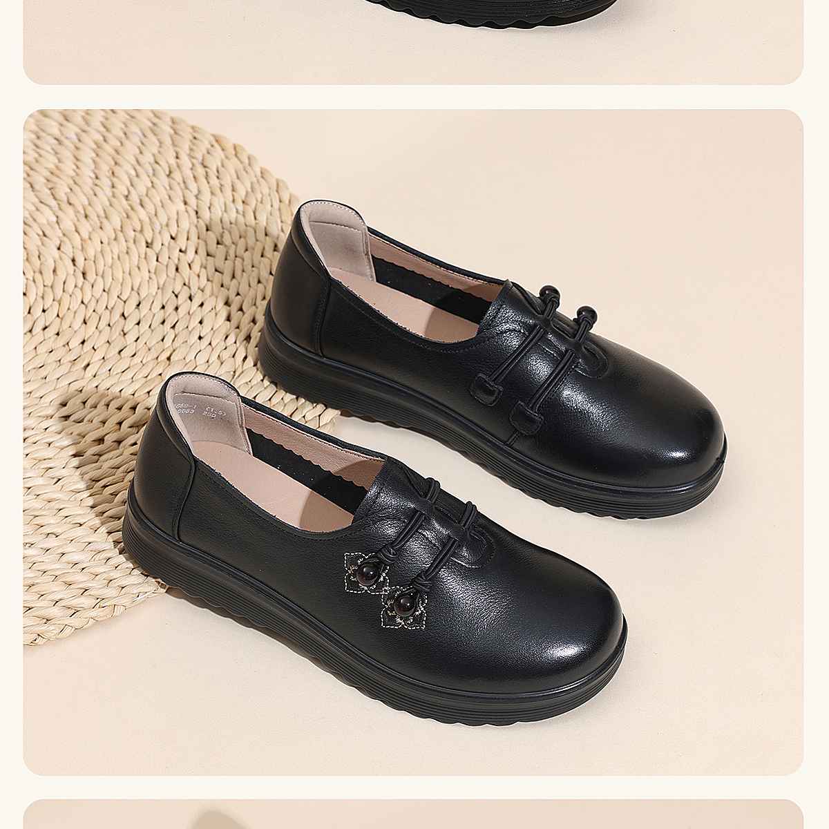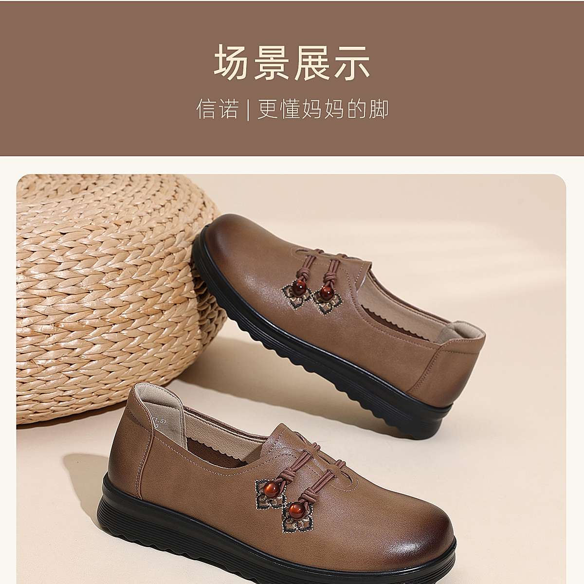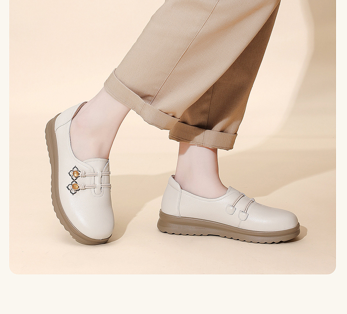 中老年妈妈鞋真皮平底休闲单鞋女舒适一脚蹬奶奶皮鞋2026春季新款6C8659-1