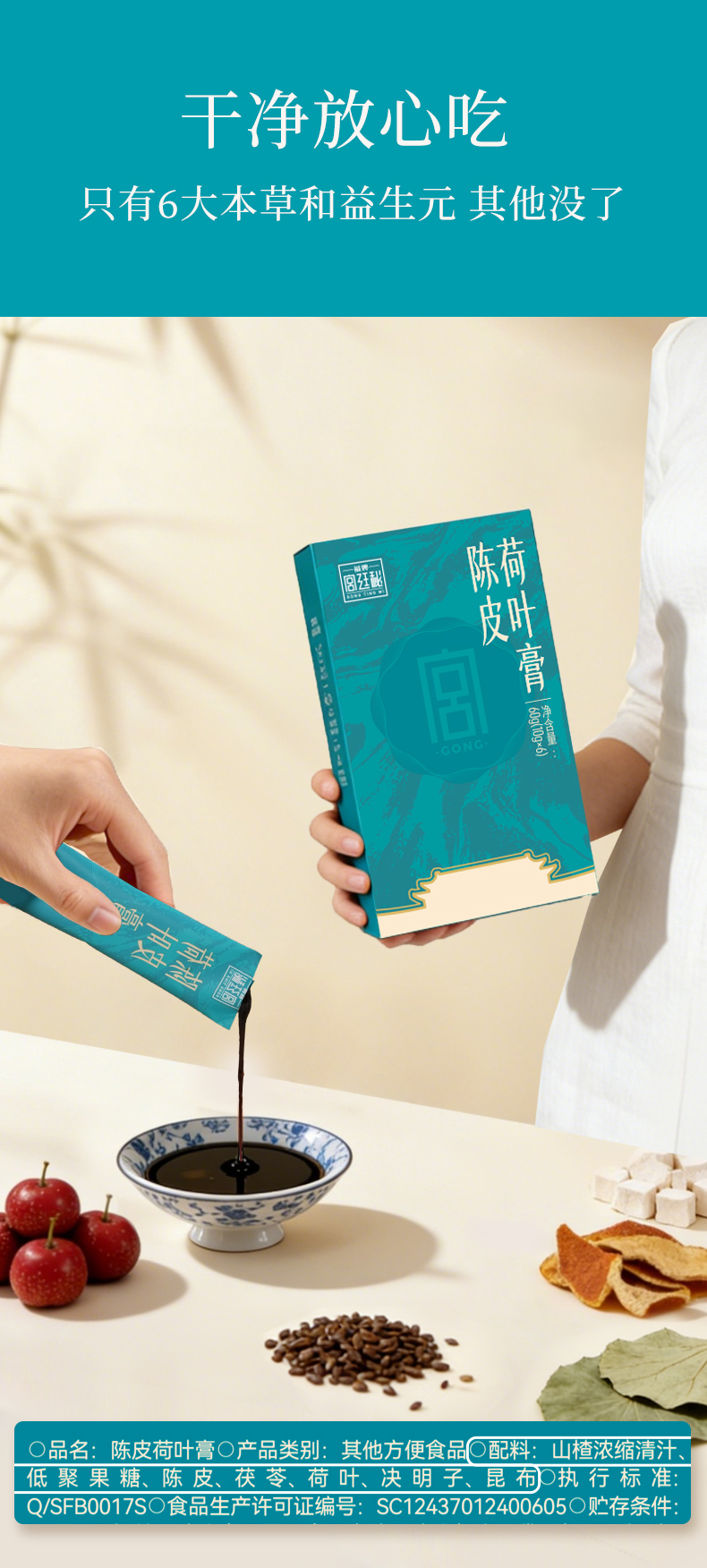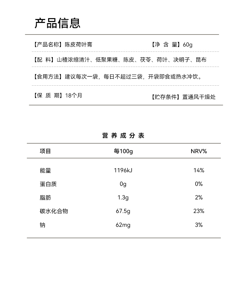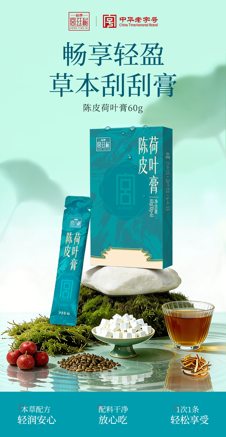 | 【品名】宫廷秘陈皮荷叶膏 【规格】60g/盒(10g*6条) 【保质期】18个月 【储存方法】请置于阴凉干燥处,避免阳光直射 【产地】山东济南 【发货地】山东济南 【发货快递】三通一达 【不发货区域】新疆,西藏,港澳台地区不发 【补邮费地区】海南+10元 【发货时效】48小时,节假日顺延 |