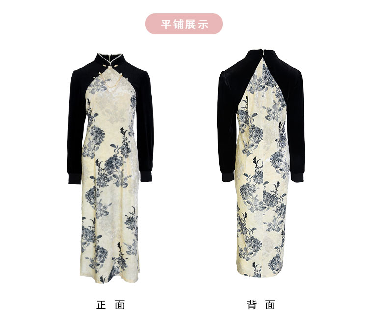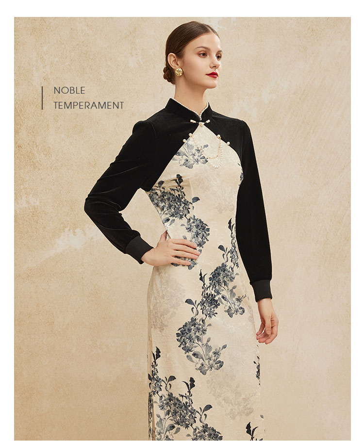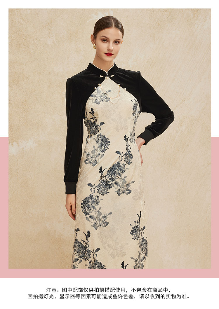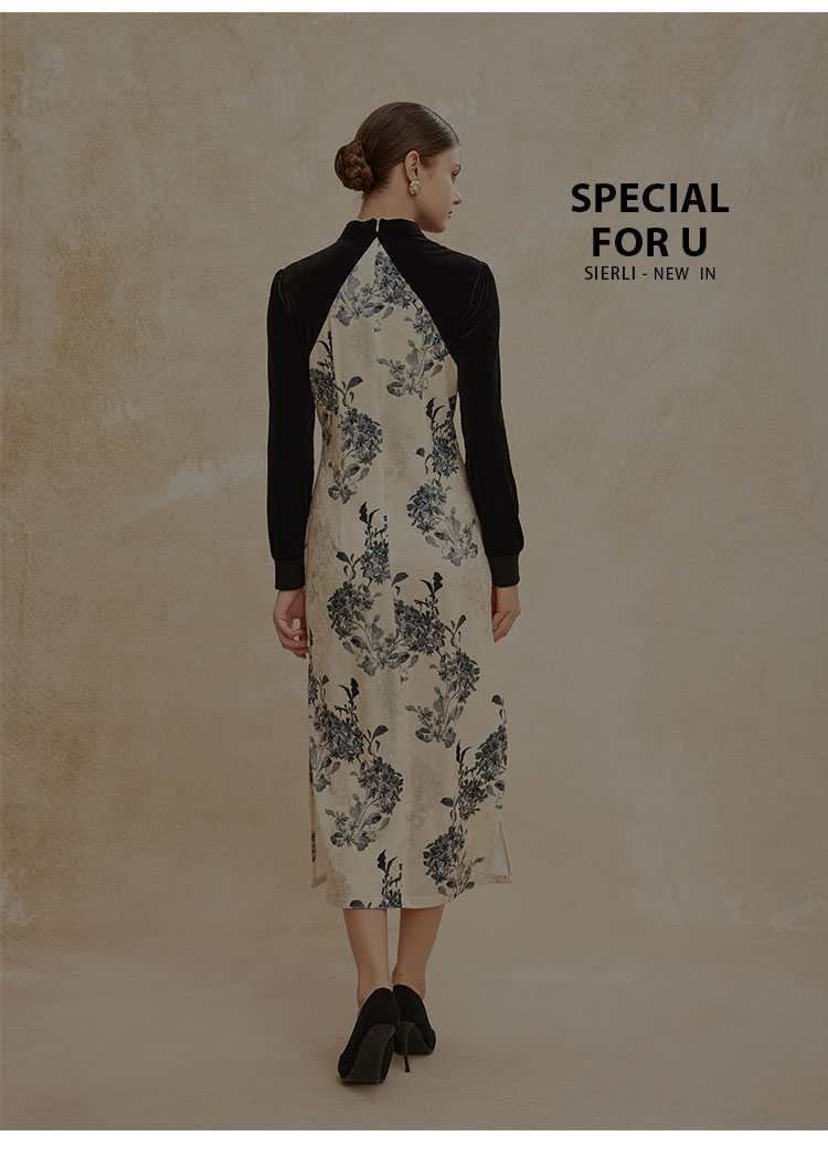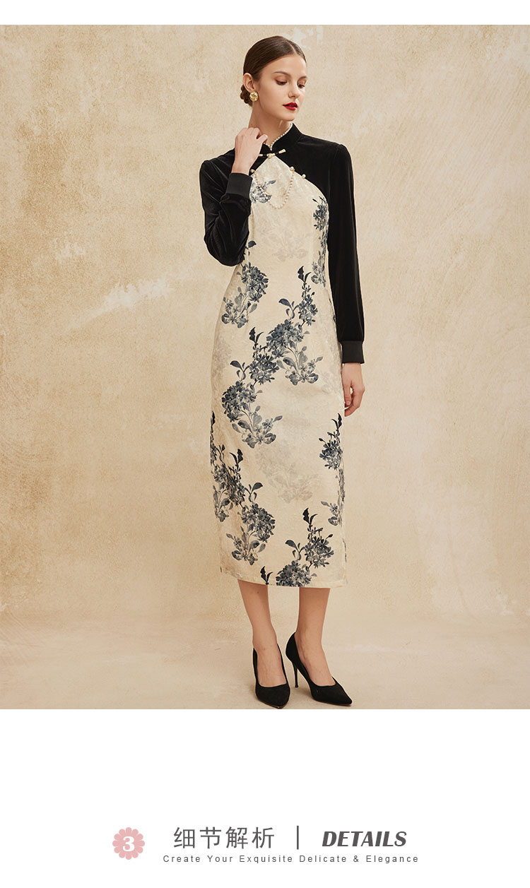 PH808斯尔丽24新款改良版镶嵌珍珠拼丝绒印花气质高雅长袖丝绒连衣裙