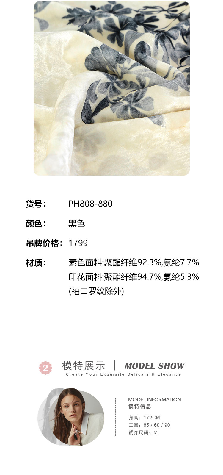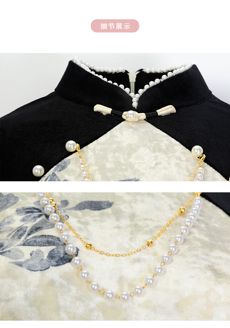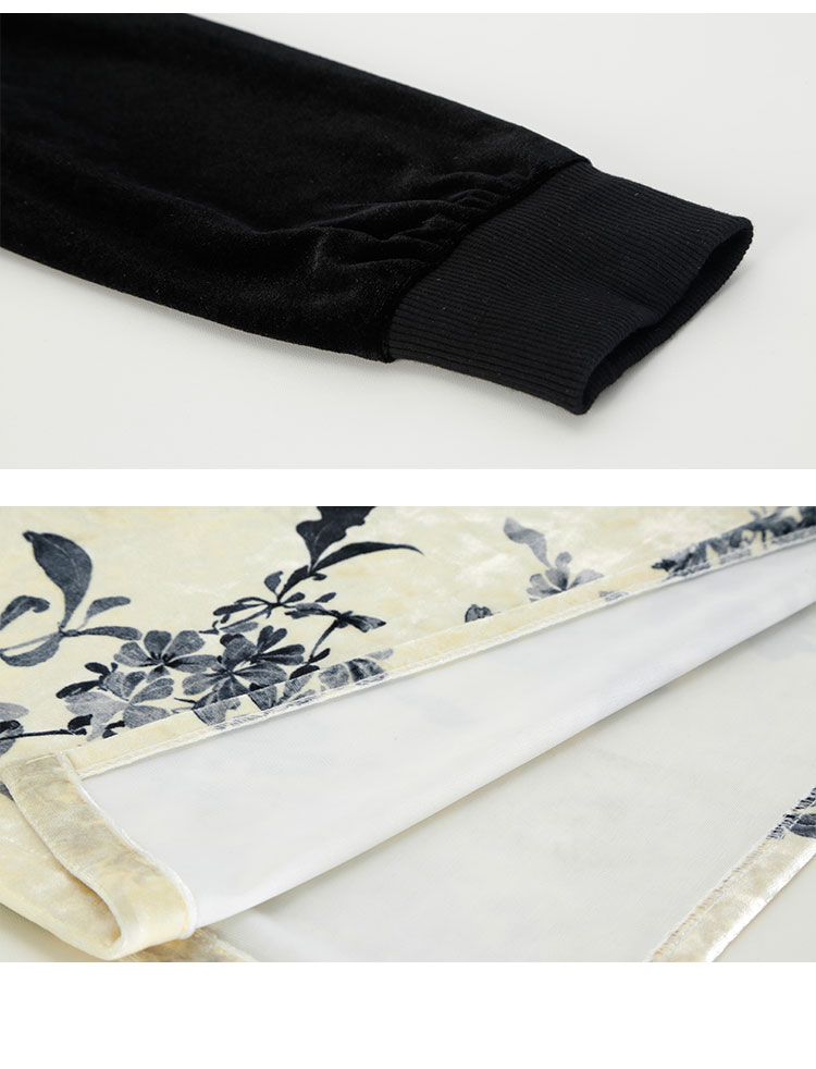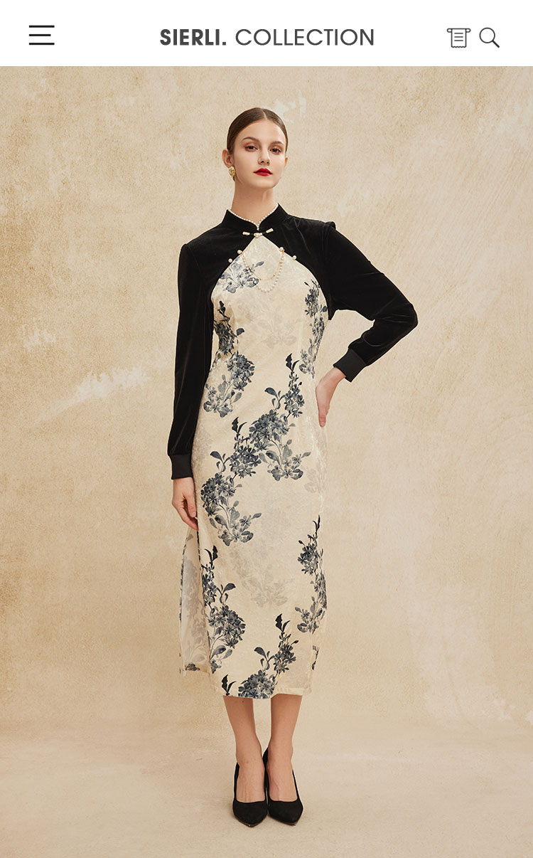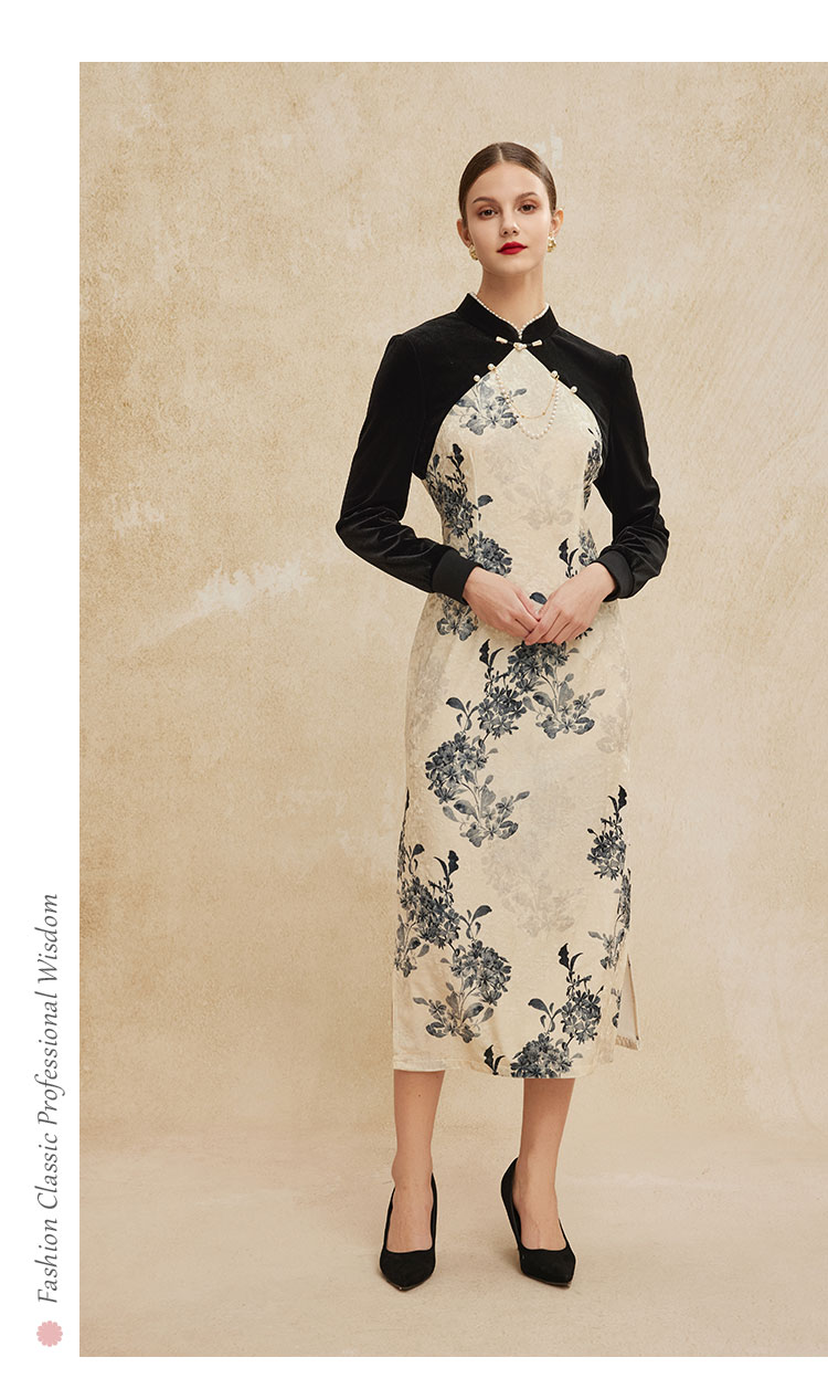 PH808斯尔丽24新款改良版镶嵌珍珠拼丝绒印花气质高雅长袖丝绒连衣裙