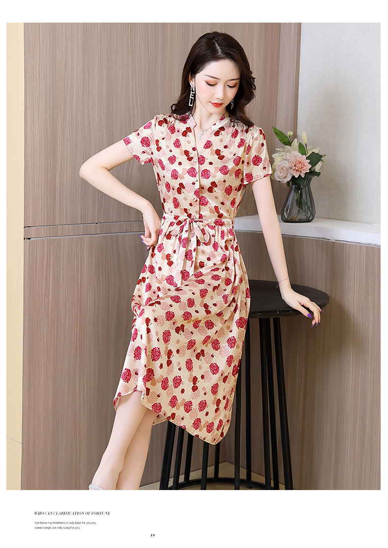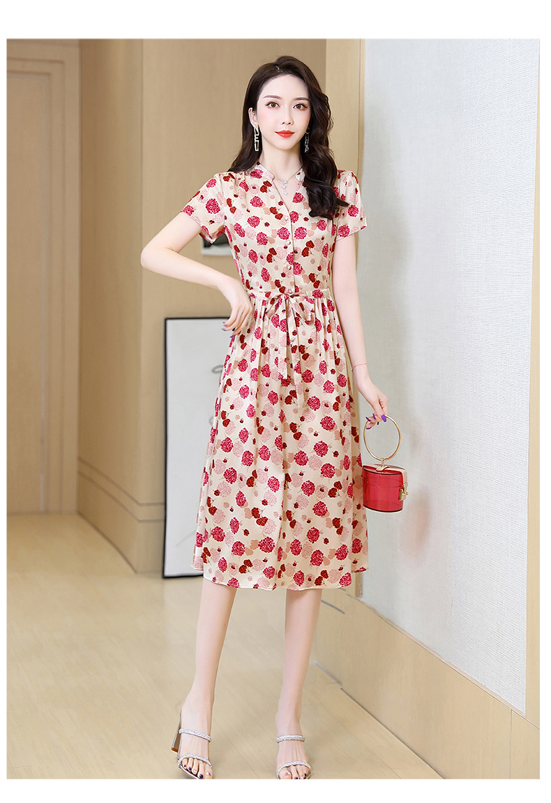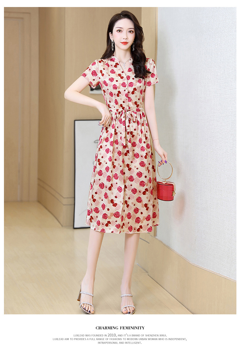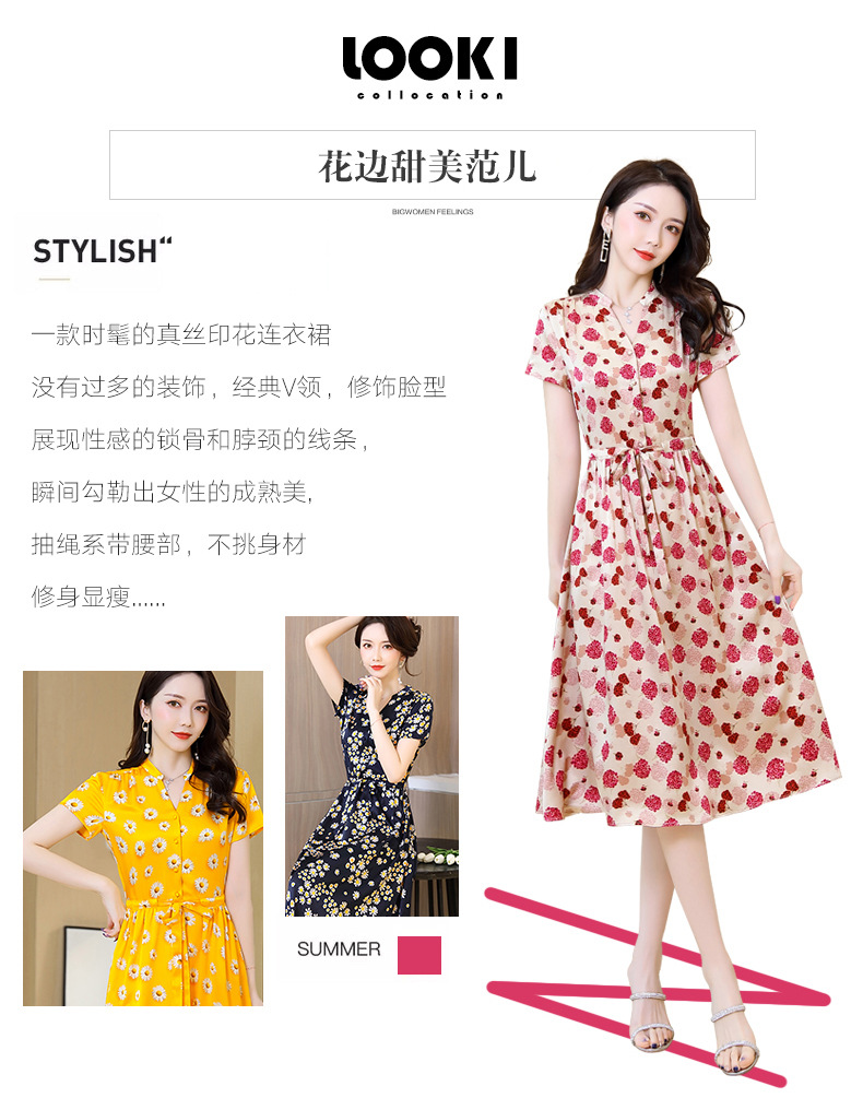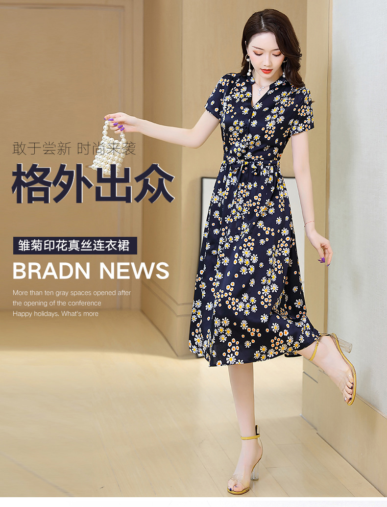 弹力缎真丝连衣裙桑蚕丝夏季年轻款碎花V领修身收腰中长裙子KQ-27281