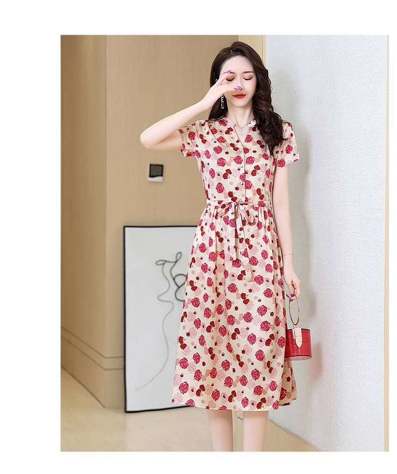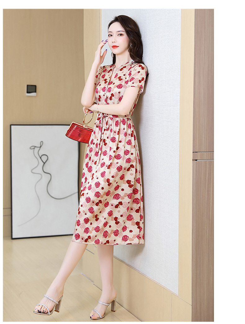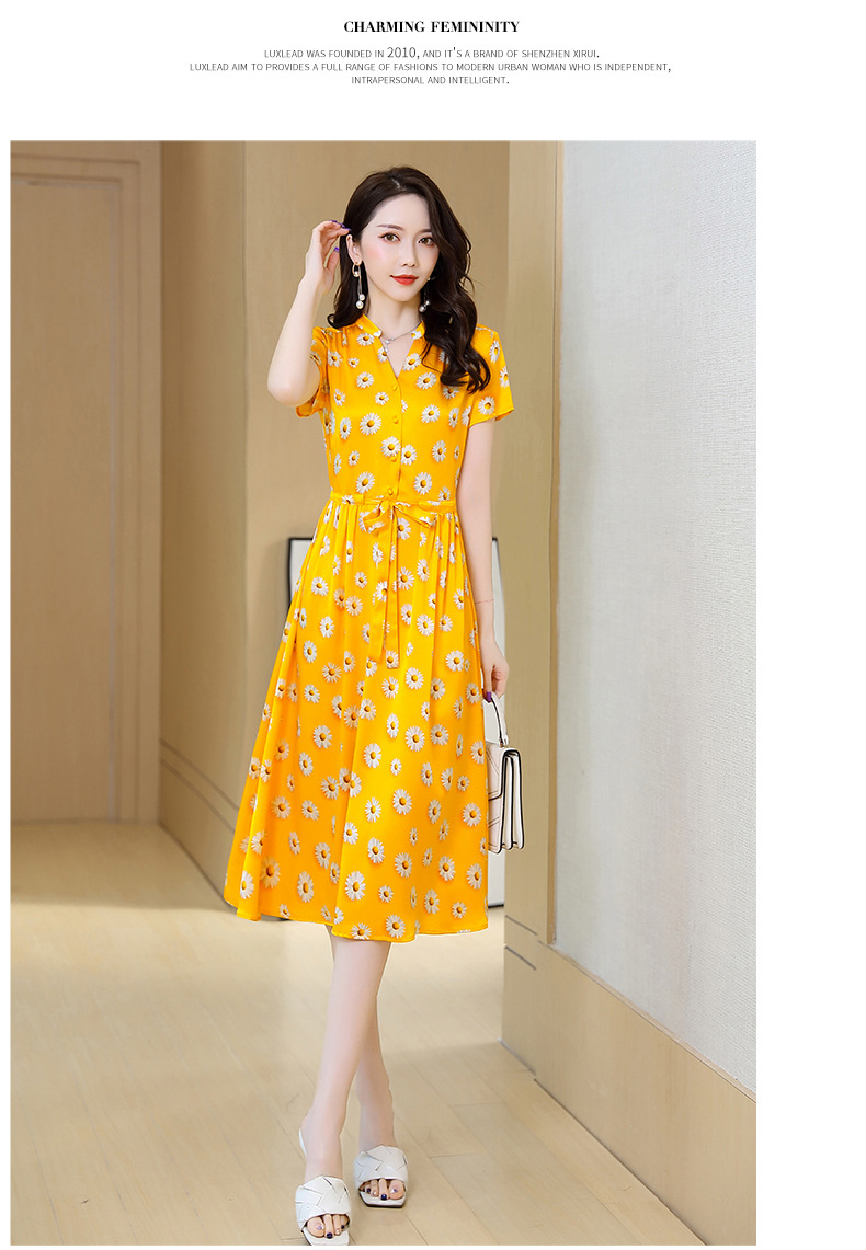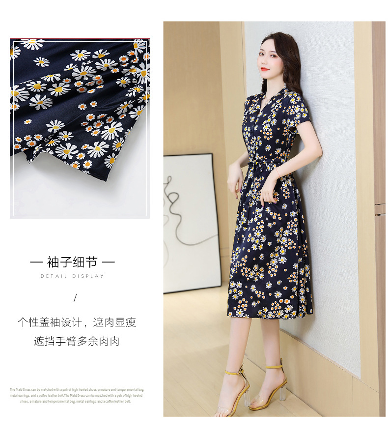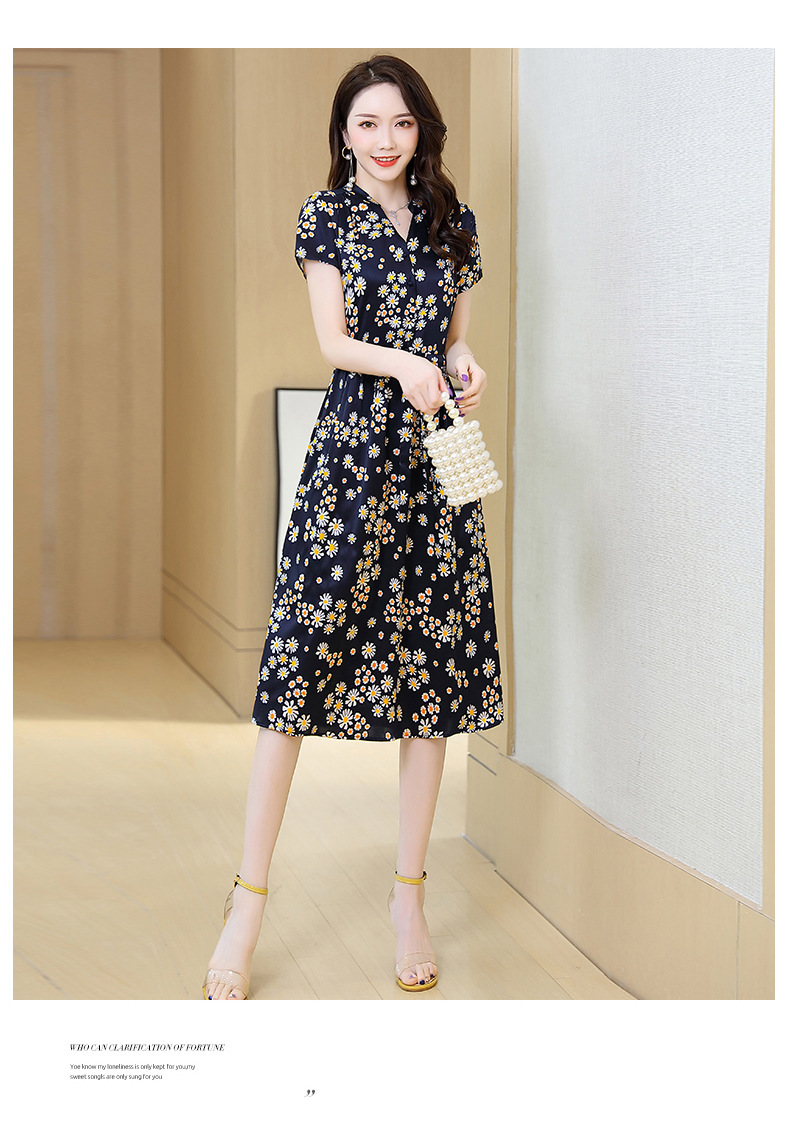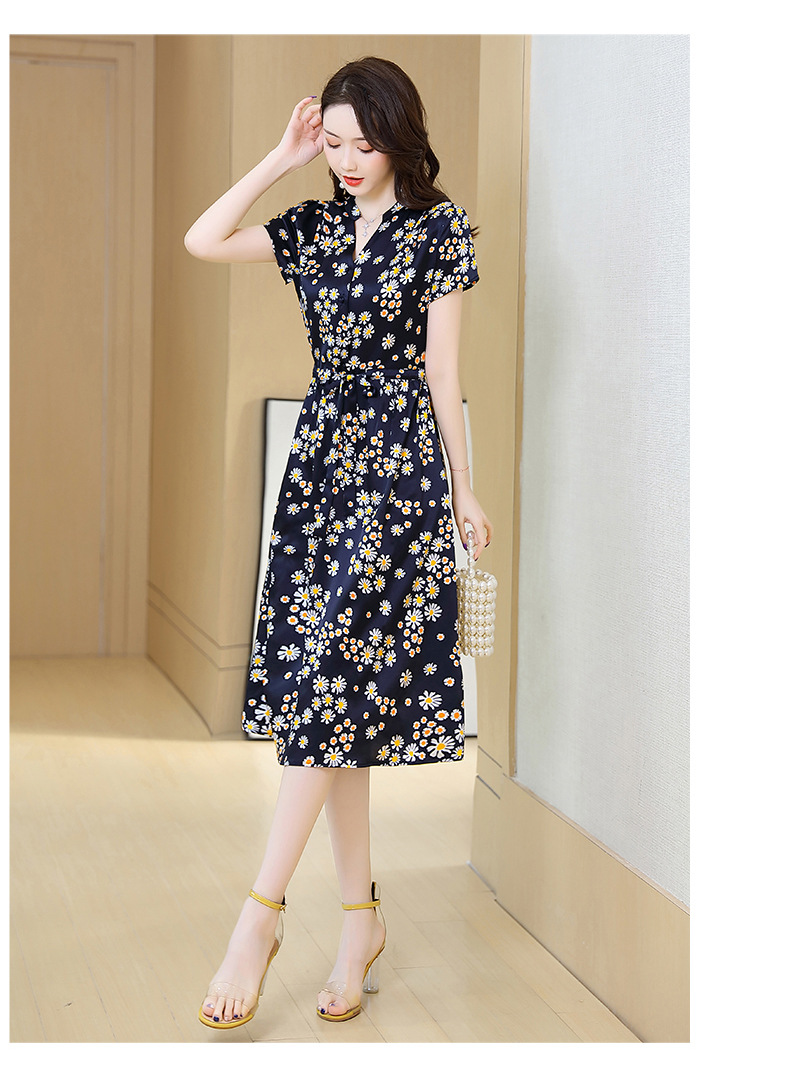 弹力缎真丝连衣裙桑蚕丝夏季年轻款碎花V领修身收腰中长裙子KQ-27281