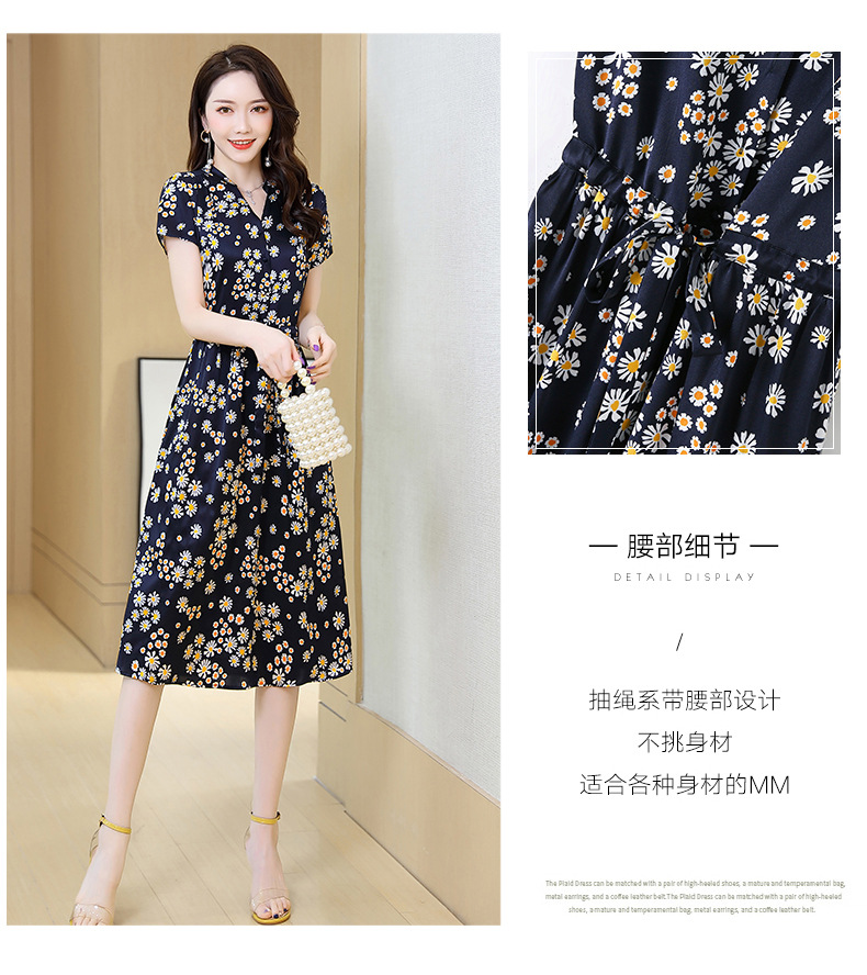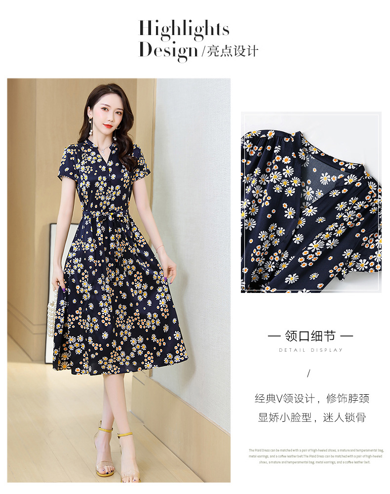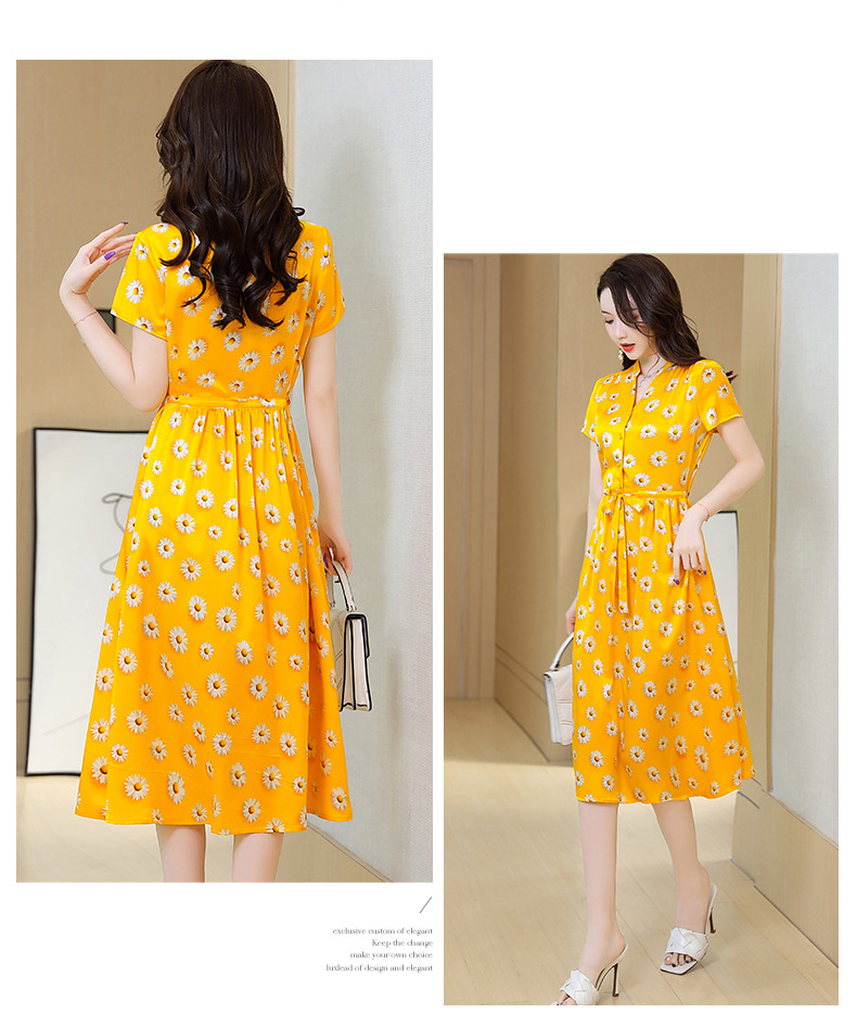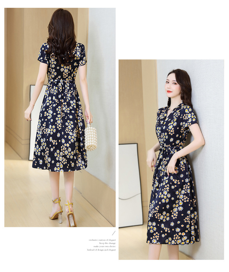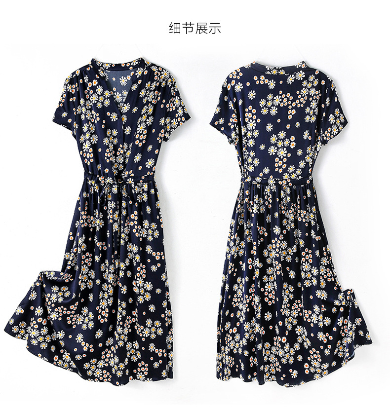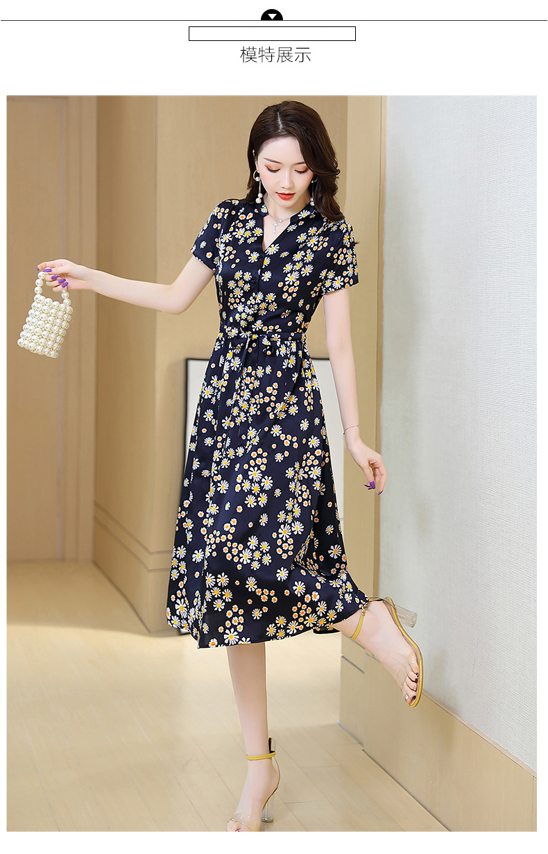 弹力缎真丝连衣裙桑蚕丝夏季年轻款碎花V领修身收腰中长裙子KQ-27281