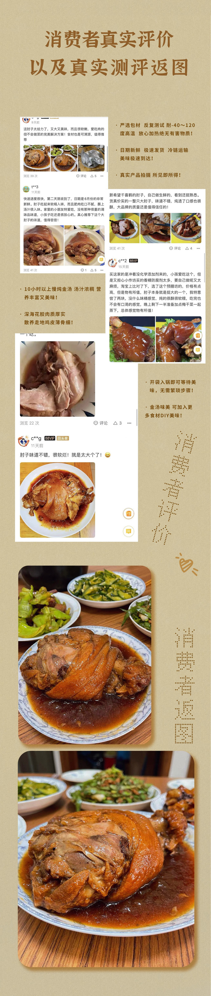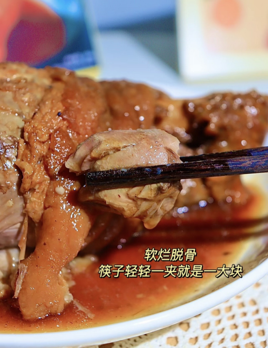 严选品质食材 文火慢炖放心吃! 整只不拆骨,经汆、煮、炸、蒸、扒等多道工序制成 肉质瘦而不柴,肉皮软糯可口,皮润肉嫩! 仿佛大厨亲临烹制,色香味俱全令人惊艳