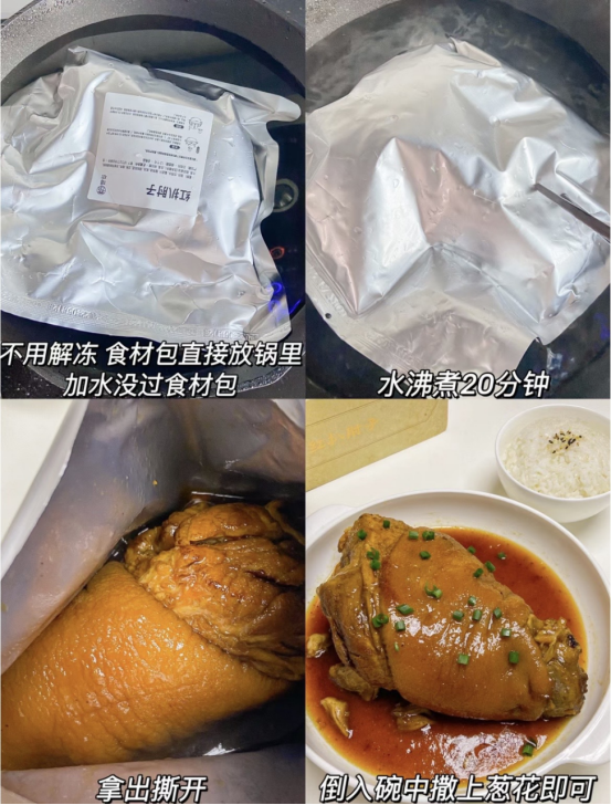 NO.3爱吃肉的露营博主 露营还在吃烧烤和速食吗 ,今天我们来点不一样的,找一个有山有水的地方,拿出准备好的红扒肘子,这次我们带的是预制猪肘,所以省去了各种繁琐的备菜流程,把它直接放到锅里加水没过,水开后煮十分钟倒入配上土豆、红萝卜、青椒、红椒 继续煮十分钟,就可以装盘啦! 太香了,这呼呼飘香的大肘子,软糯流油,看起来就好有食欲!! 这不是妈妈平时烧的味道吗 ~~ 完全不需加其他任何调料。 肘子基本上没有很腻肥肉,入口即化,可以单独吃,也可以把肘子切开以后用汤汁伴着米饭吃满口都是肉香,乘在小碗里,我们三姐妹感觉可以一次性吃十碗,这种快速简单的露营美食都去学起来,太方便了~