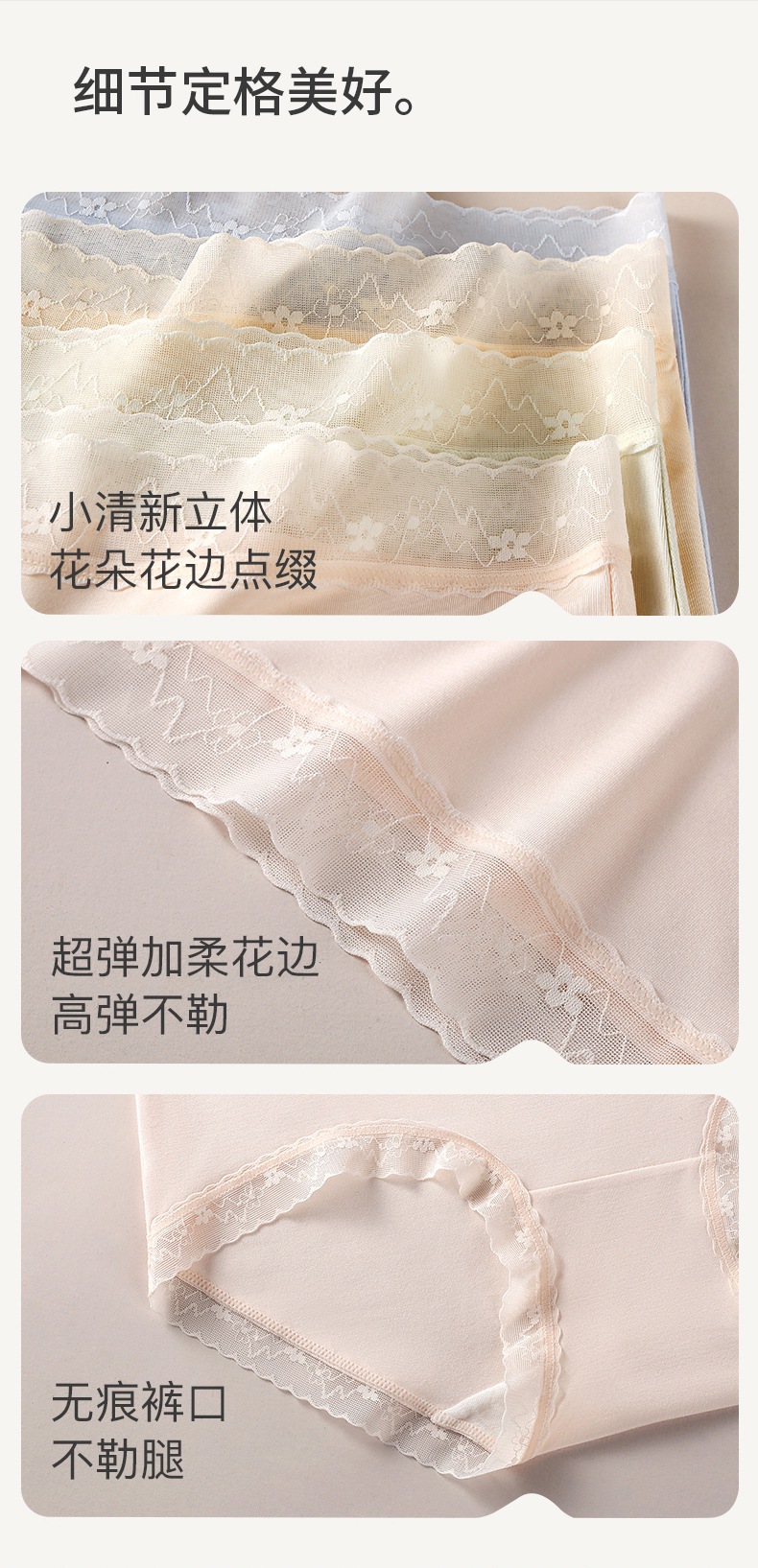 4、腰头和脚口:采用超弹加柔花边,富有弹性和回弹性,不勒腰头和脚口,不卷边,敏敏肌也非常友好!