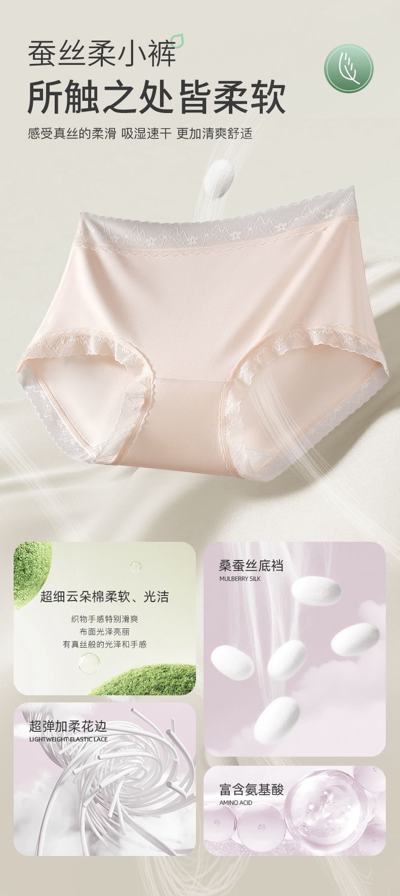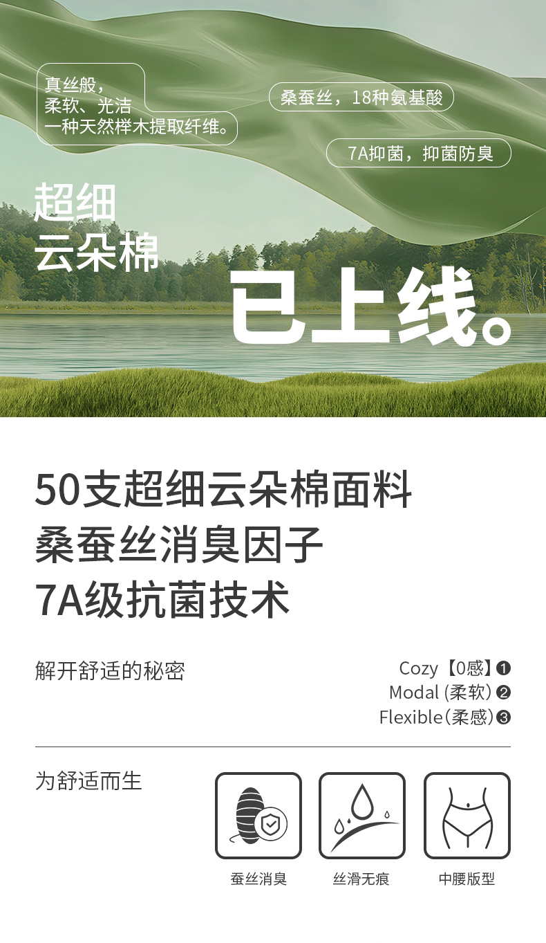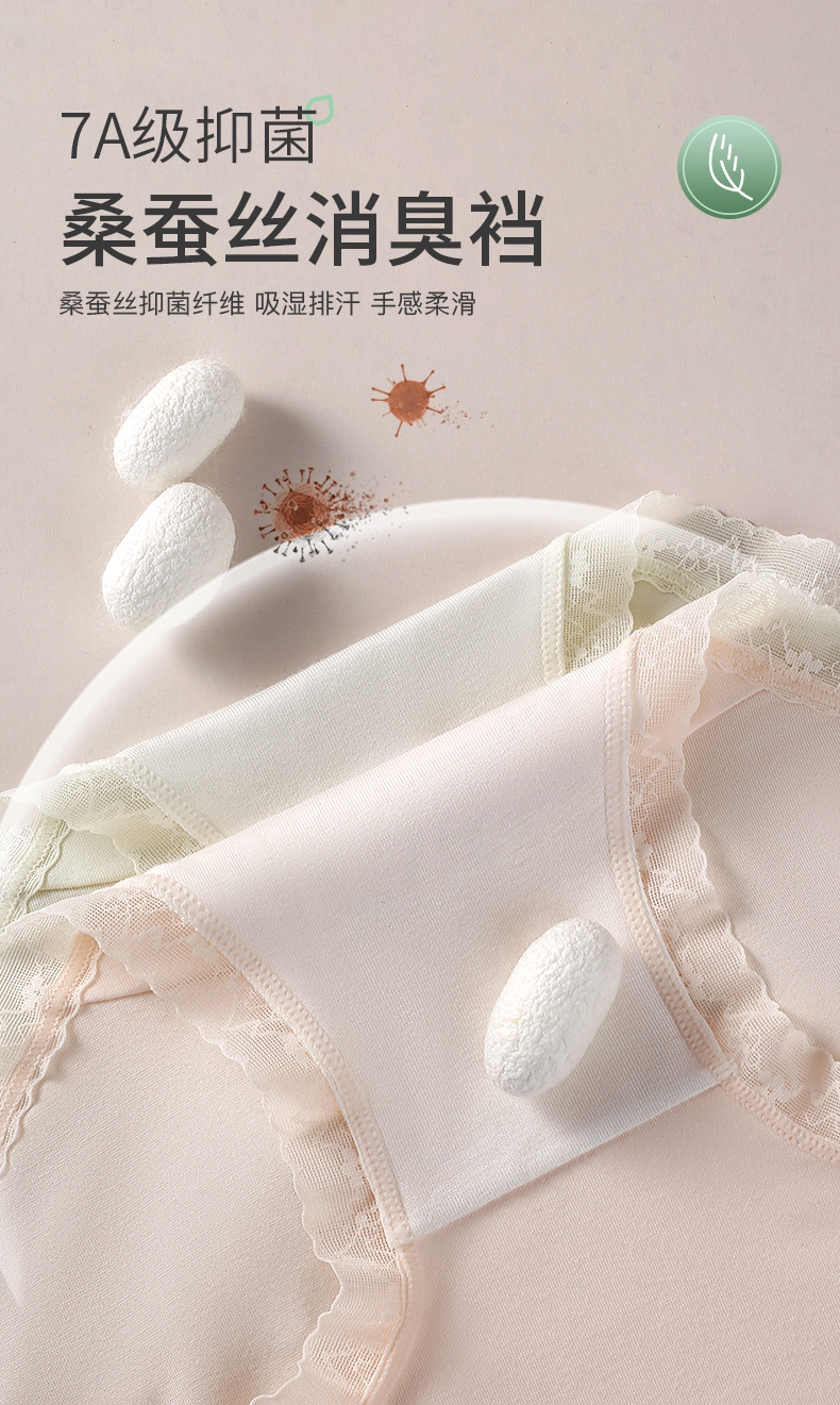 2、底裆:精选桑蚕丝消臭纤维面料,蚕丝富含人体所需18种氨基酸,添加海藻生物消臭因子,3秒快速分解异味!拒绝尴尬,清新一整天!