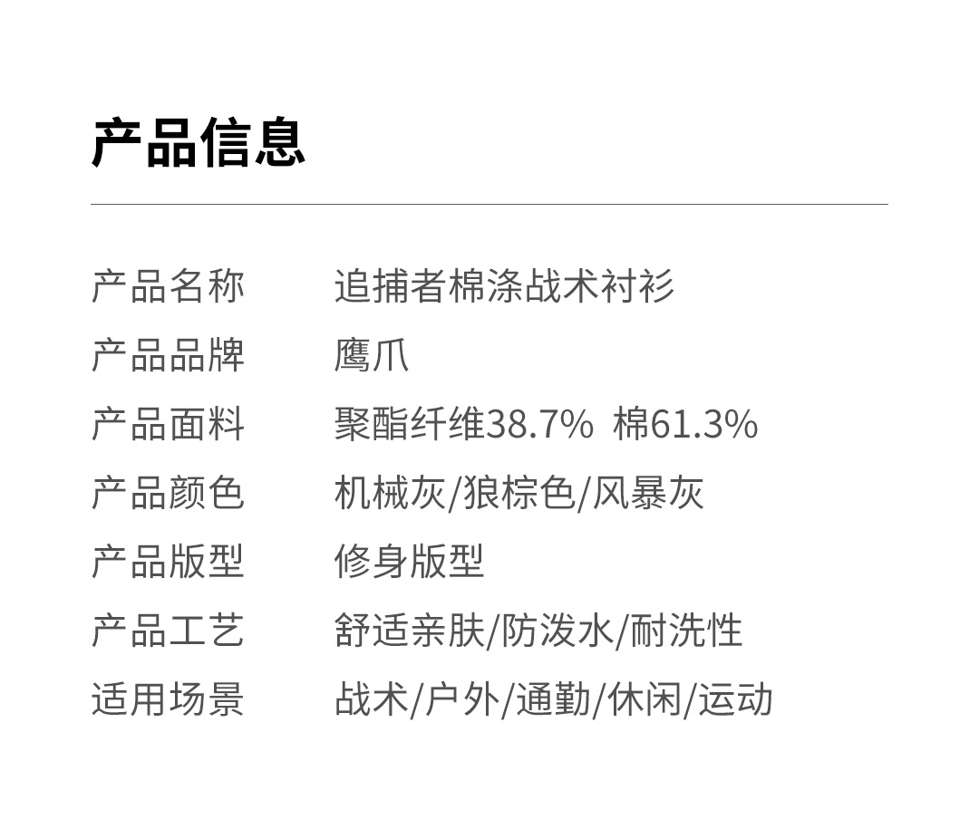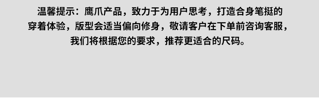 鹰爪,中国功能男装创领品牌,致力于服务中国3亿新中产阶级,着力打造全场景穿着体验创新平台,三十年产业深耕的积淀,以用户的痛点为己任,开创兼具军品与户外装备的功能动态穿着系统。