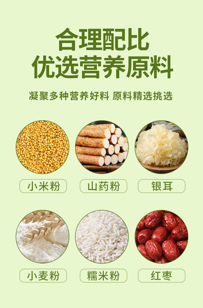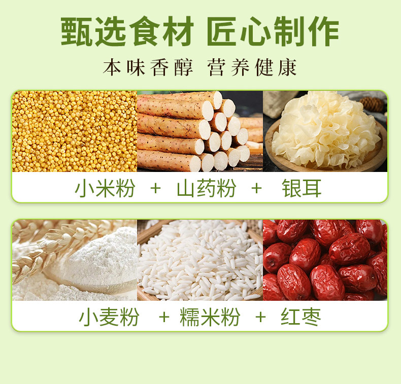 配料::小米粉添加量>20%、小麦粉、糯米粉、麦芽糖浆、海藻糖、!红枣、枸杞粉、食用植物油、饮用水、银耳粉、食用盐、山药粉、丙酸钙、山梨酸钾食用香精