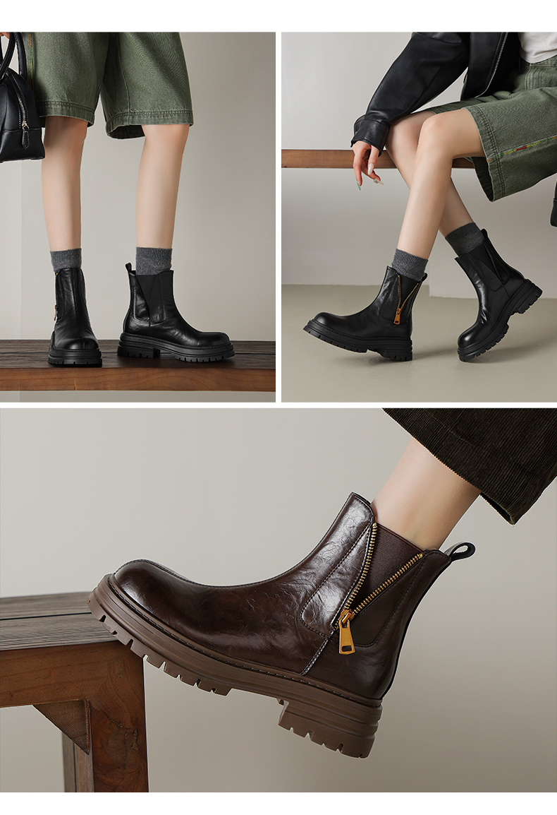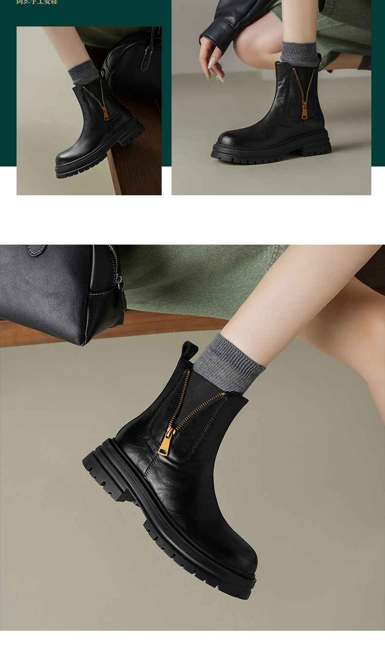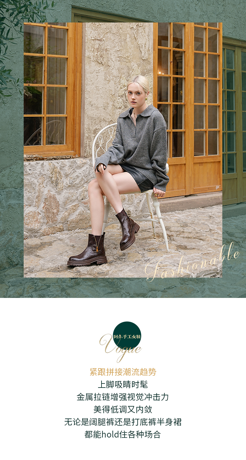 阿么手工女鞋英伦风侧拉链时尚短靴女厚底4.5CM真皮复古切尔西靴