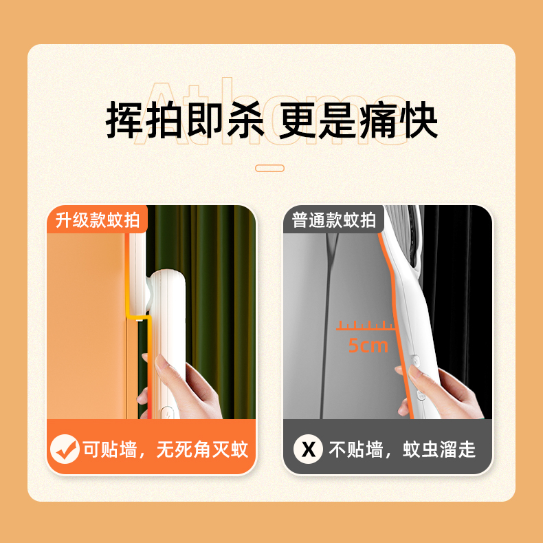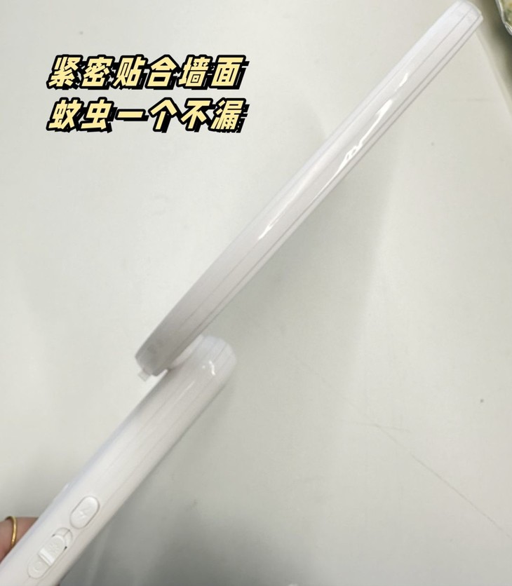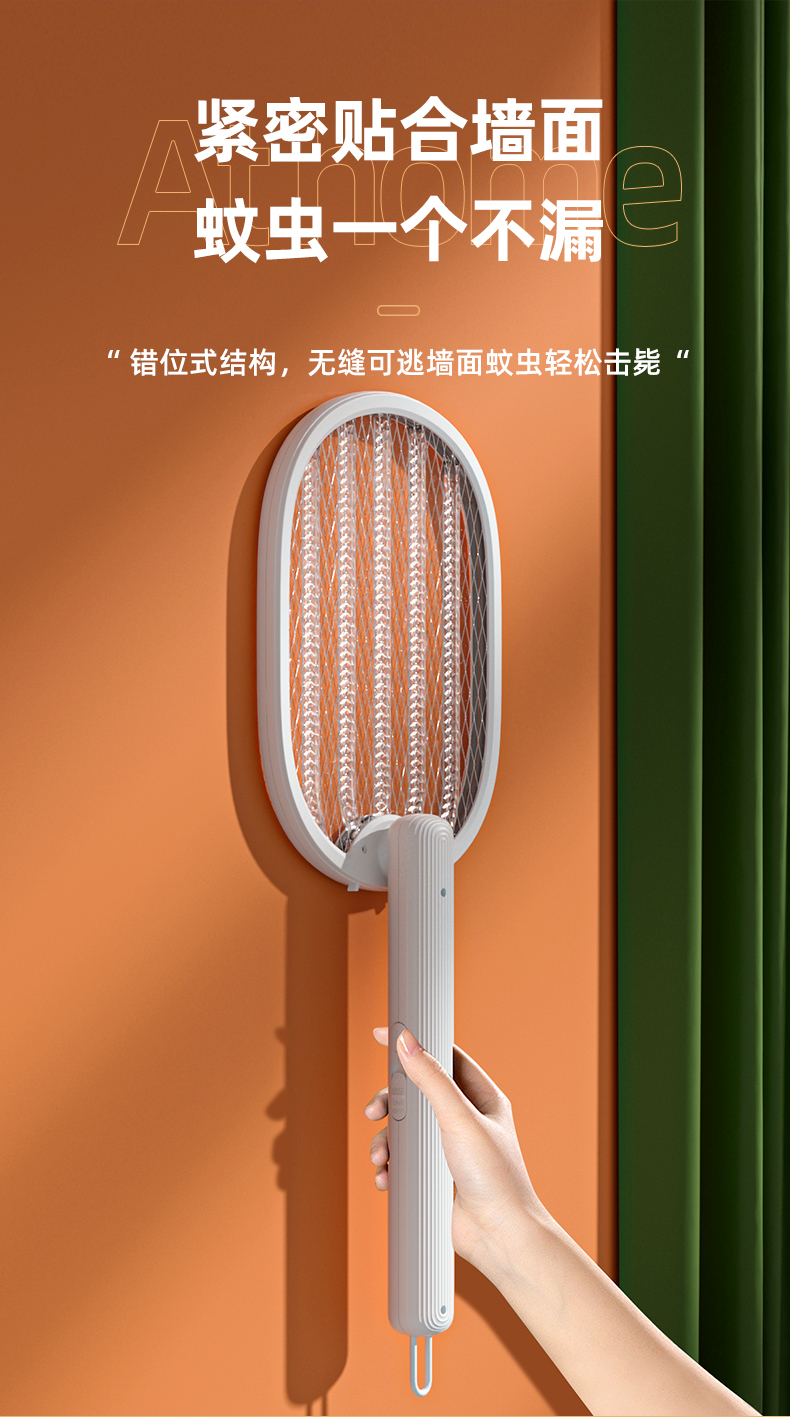 这款电蚊拍错位贴墙设计,网面和收柄错开设计在使用的时候可以更贴合墙壁,让蚊虫不再逃跑。