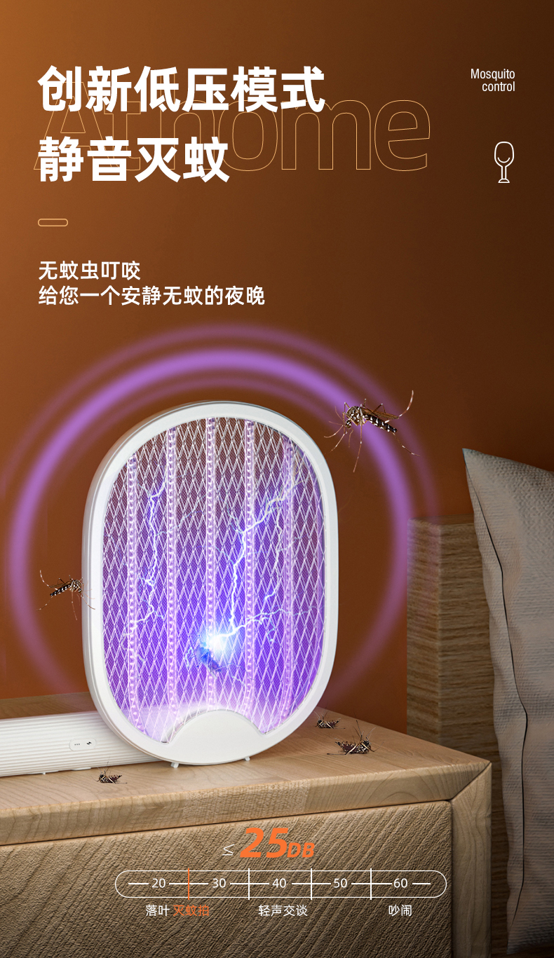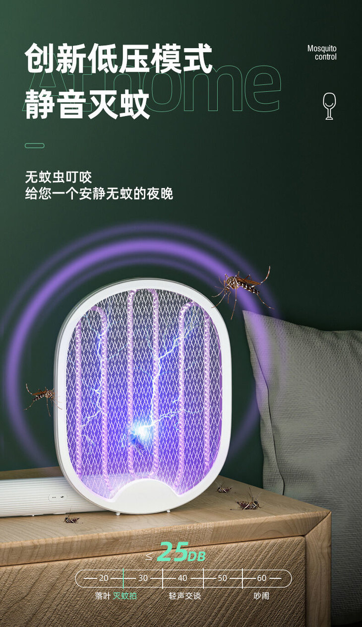 采用的新型低压静音技术,击灭蚊虫的声音小于25分贝,25分贝是什么概念呢就是树叶落叶的声音都有20分贝,25分贝能有多大声音呢。