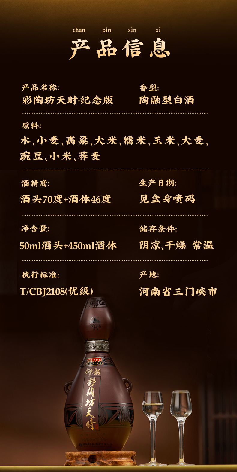仰韶彩陶坊天时 纪念版 白酒整箱6瓶礼盒装 46度450ml+70度50ml 送礼