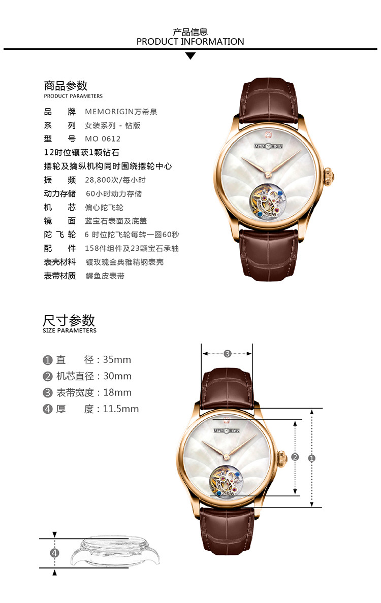 MEMORIGIN万希泉陀飞轮女士腕表真皮钻石表镂空女款机芯刻字手表