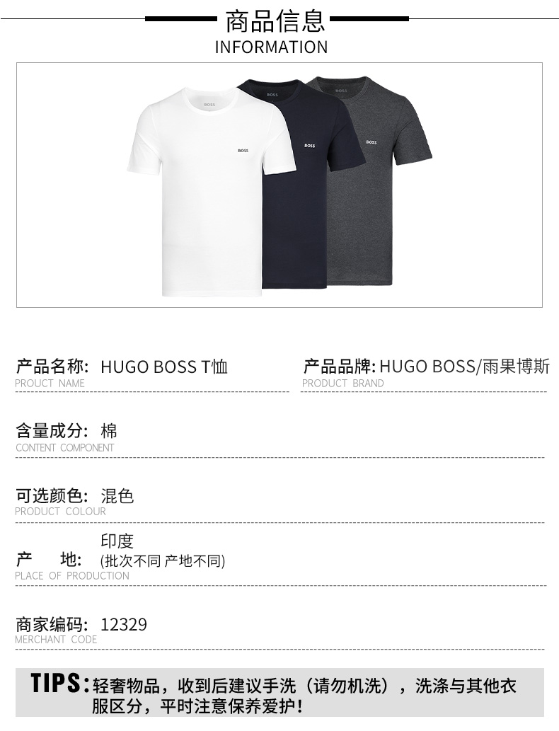 【超惠秒】BOSS 男士三件装刺绣logo全棉短袖 T恤12329