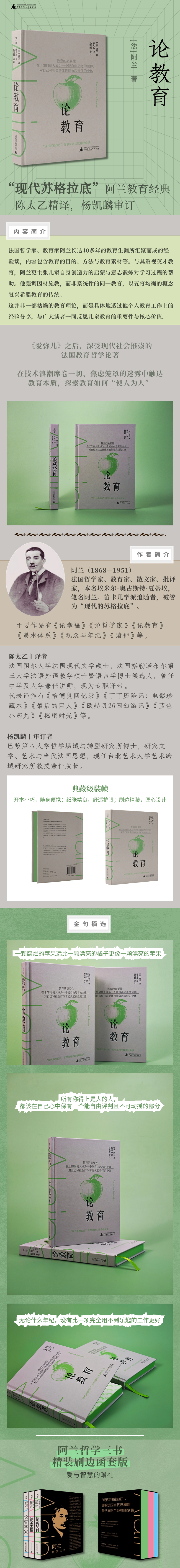 阿兰被誉为“现代的苏格拉底”,是影响了整个法国当代思潮的哲学家,他的随笔深入浅出,幽默中富含深意,问世数十年来不断再版,值得反复阅读。阿兰的《论教育》以哲学家视角切入常谈常新的教育话题,在技术浪潮席卷一切、焦虑笼罩的迷雾中触达教育本质,他的教育思想,如尊重儿童天性、反对过度干预、教育不等同于游戏等等,在当下依旧具有启发性。在他看来,教育的必要性就在于如何使人成为“人”,即成为一个能自由思考的主体,对自己和社会群体皆能负起责任的个体。值得一提的是,《论教育》不仅是一部剖析教育问题的著作,更是关于个体如何自我发展、完善人格以求实现人类社会进步的哲学启示录。阅读本书,不仅能收获关于儿童教育的启迪,更能以此为鉴,重新认识自我,汲取生而为人的智慧。