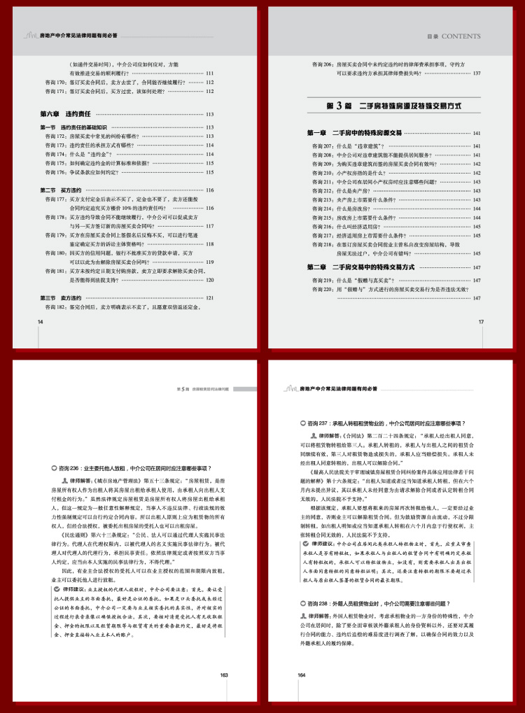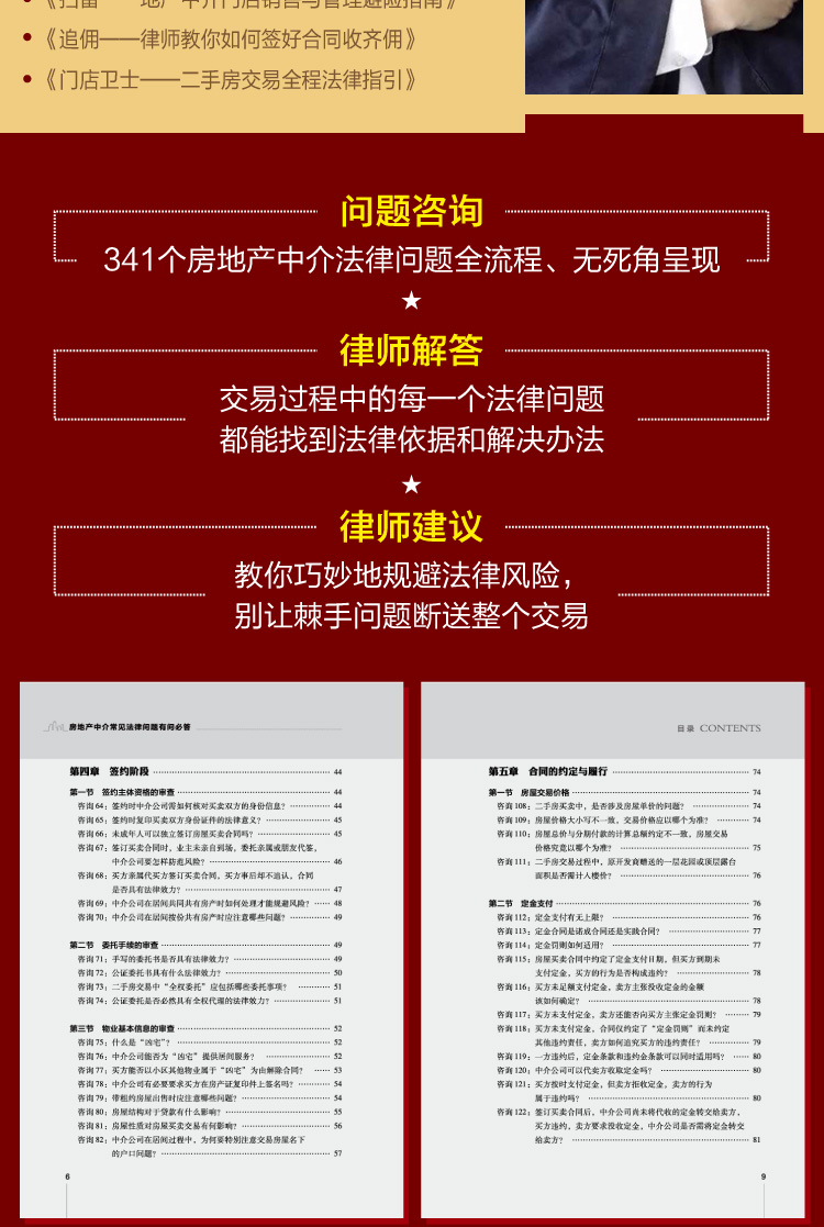 每一篇当中又按照交易流程详细梳理了300余个法律问题,每一个问题都源于真实案例——【问题解析】,具有极强的代表性,对所有问题予以详尽的法律分析——【律师解答】,并进一步给出应对的措施和方案——【律师建议】。房地产经纪人及交易当事人可以从中了解房屋买卖、租赁过程每个阶段可能遇到的法律问题,并更好地运用法律手段来保护自身的合法权益。