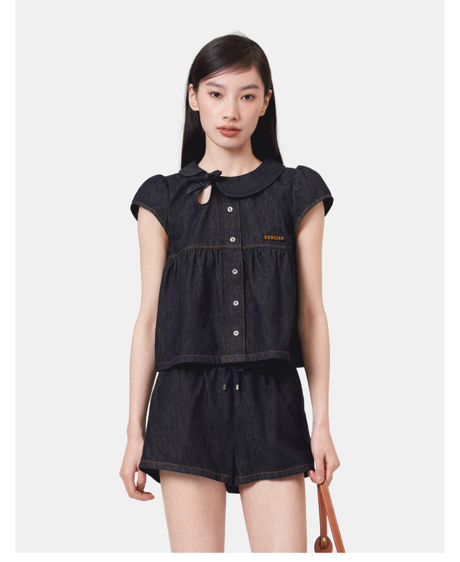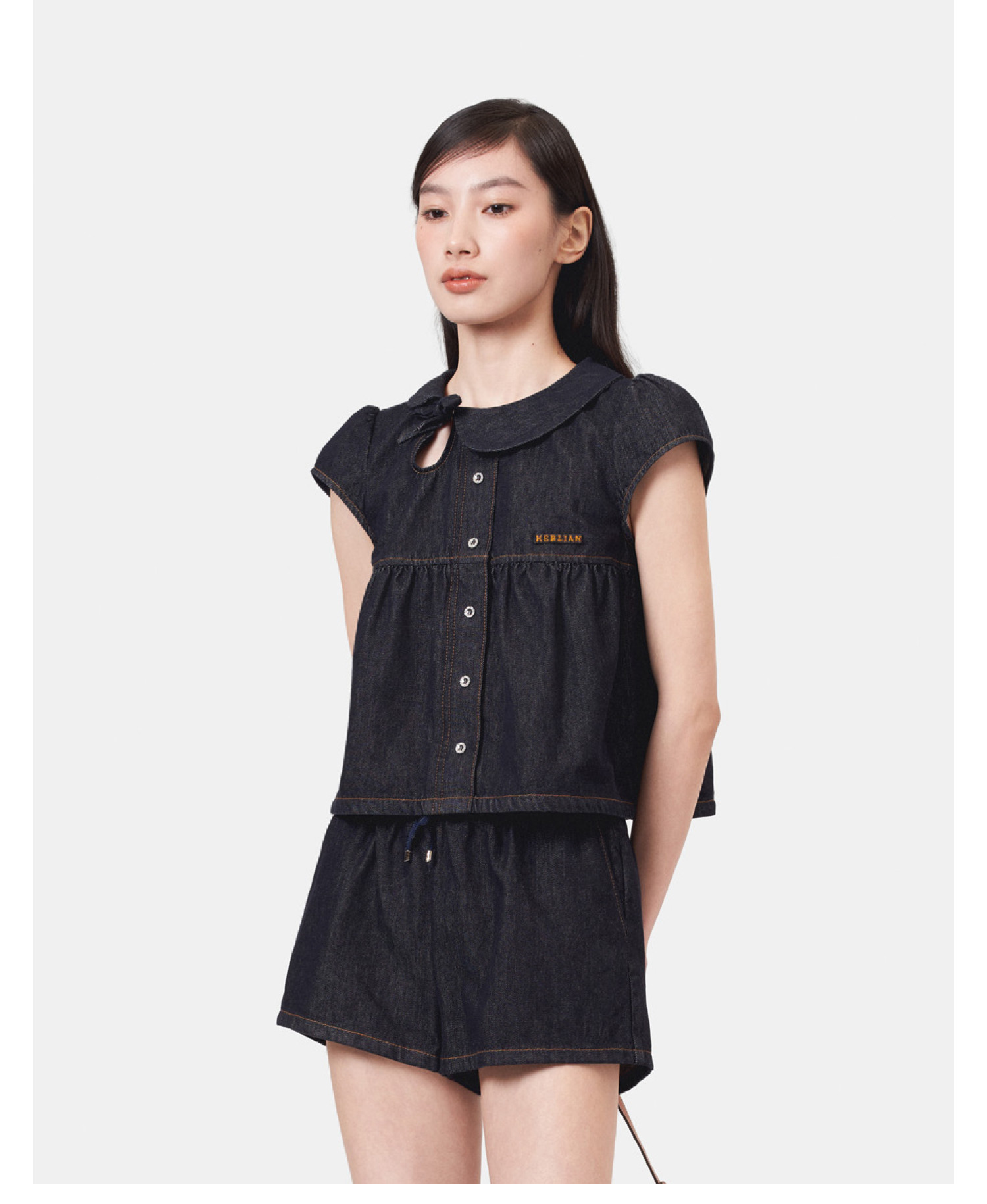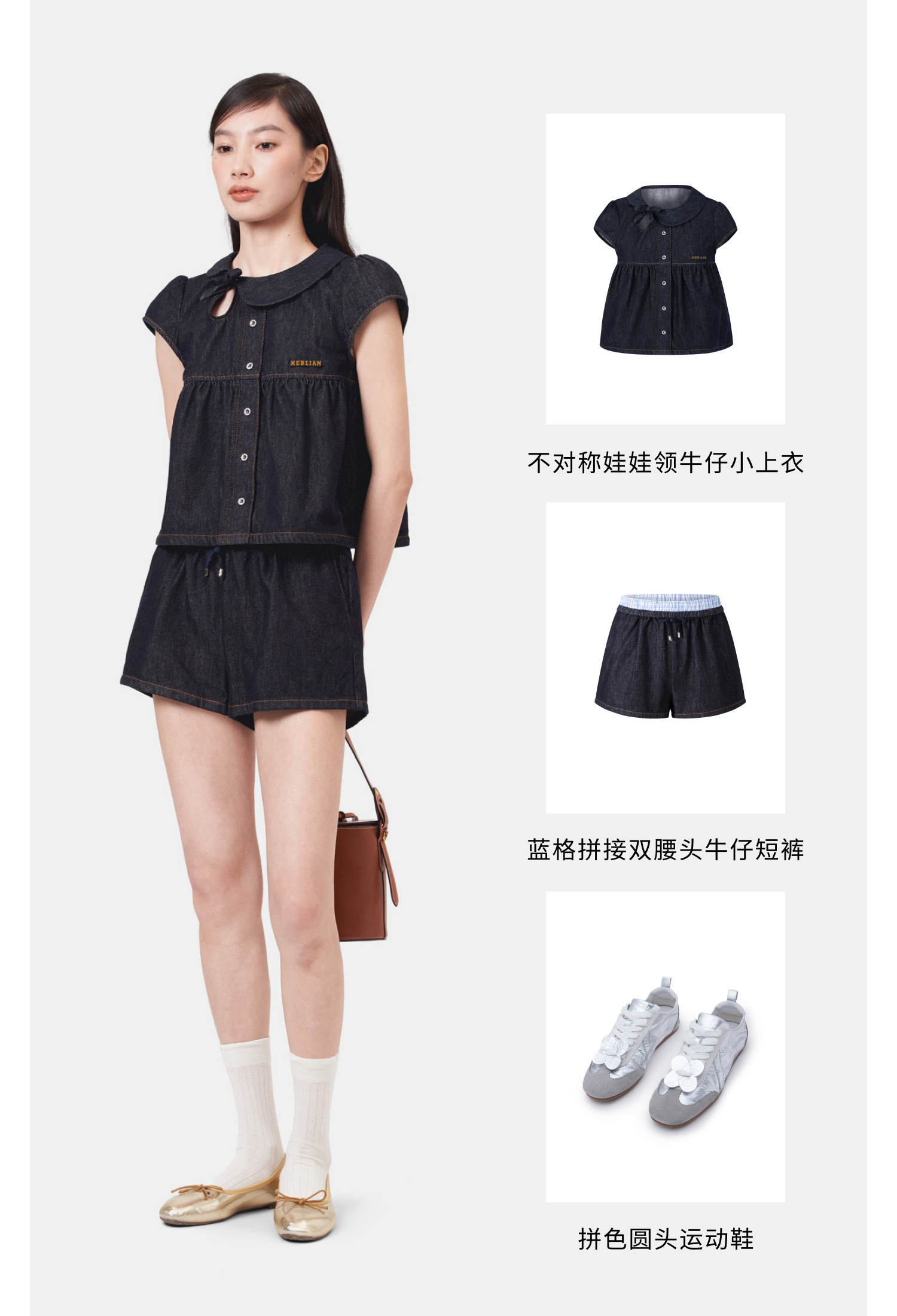 HERLIAN 2026年春夏新品不对称娃娃领牛仔小上衣蝴蝶结系带女短袖