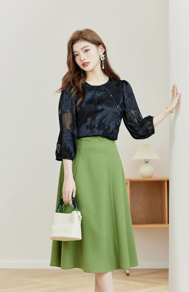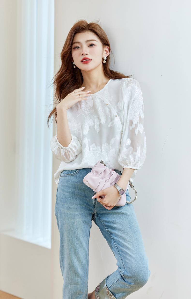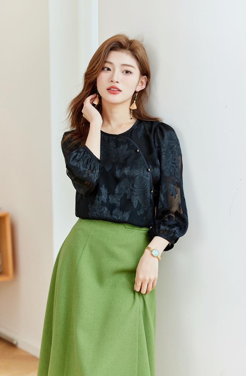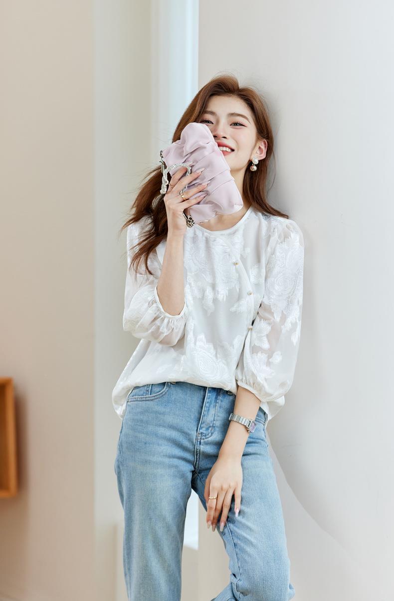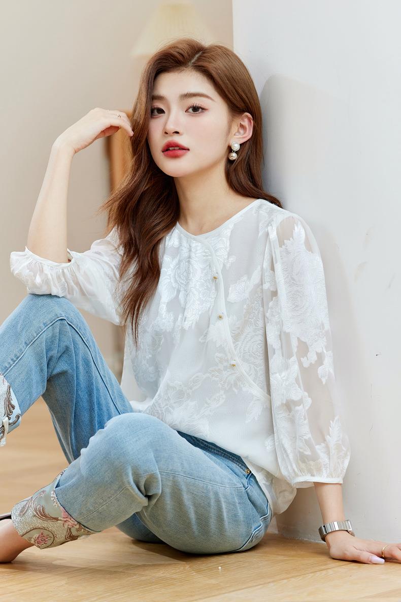 国风款圆领雪纺衫2024春装新款七分袖小衫刺绣女衬衣1820