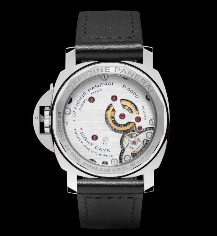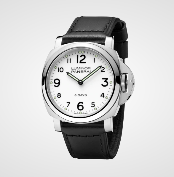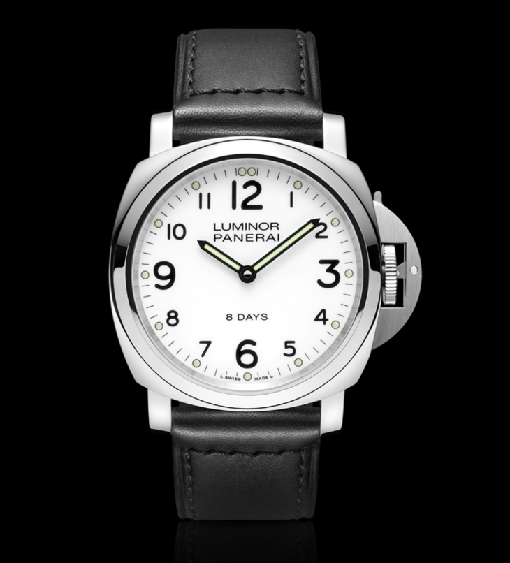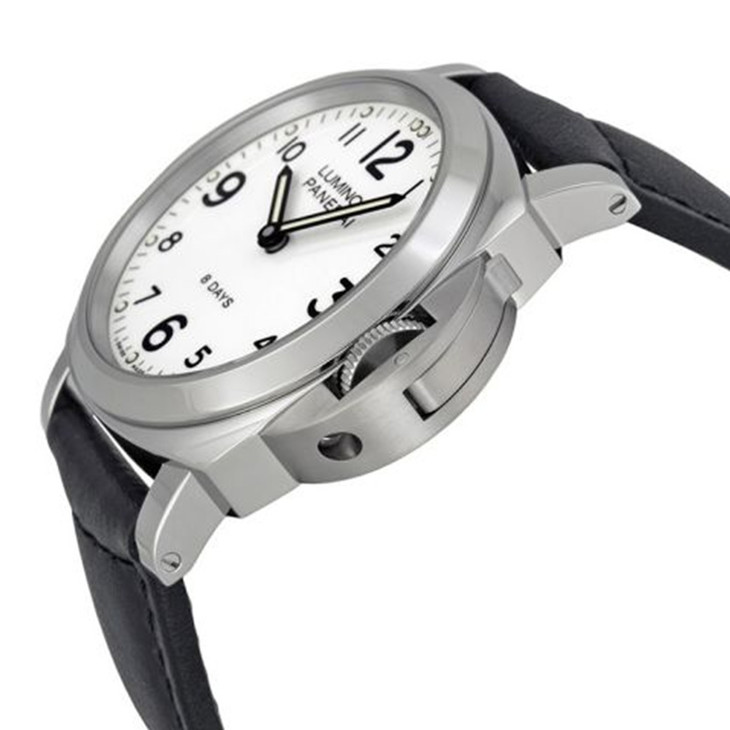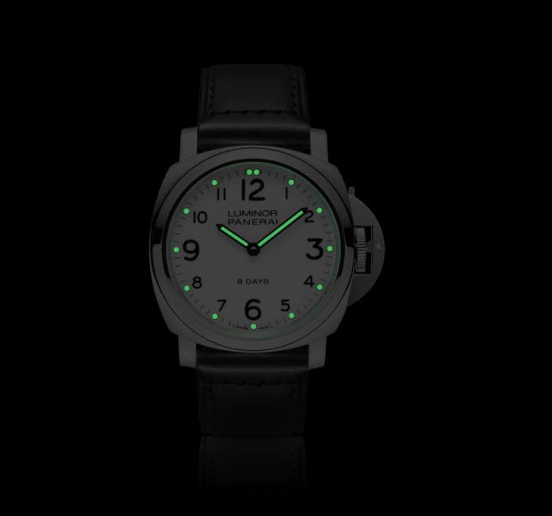 镜面材质 | 蓝宝石水晶玻璃 | 表盘 | AISI 316L拋光精钢表壳 白色表盘 阿拉伯数字夜光圆点时标 指针 8日动力储存 表冠护桥(沛纳海专利) 透底 |