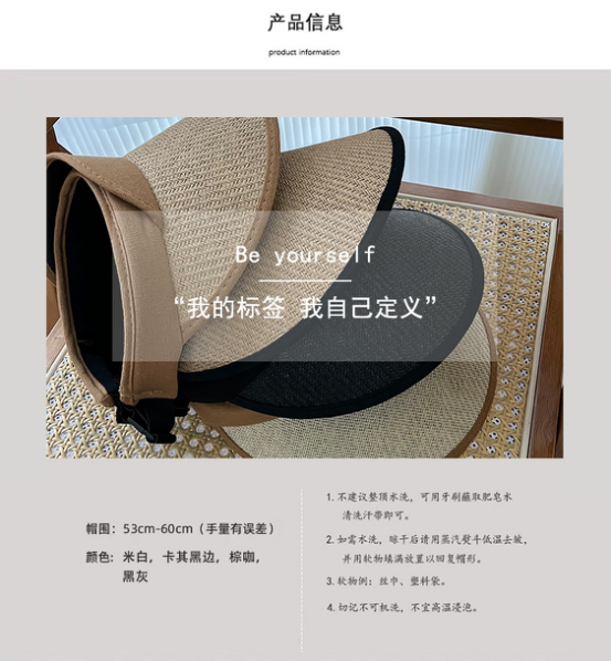 一张图片告诉你 为什么要买我们家的防晒帽 大家都知道草编防晒帽好看 但是很多家的草帽 非常轻 很透光 带上就像带了一个寂寞 而我们的防晒帽 我们的草帽是非常硬的 不是软草帽 所以稳定性要好于软顶 更防风 这款防晒帽 绝对是品质款 你们收到就懂得