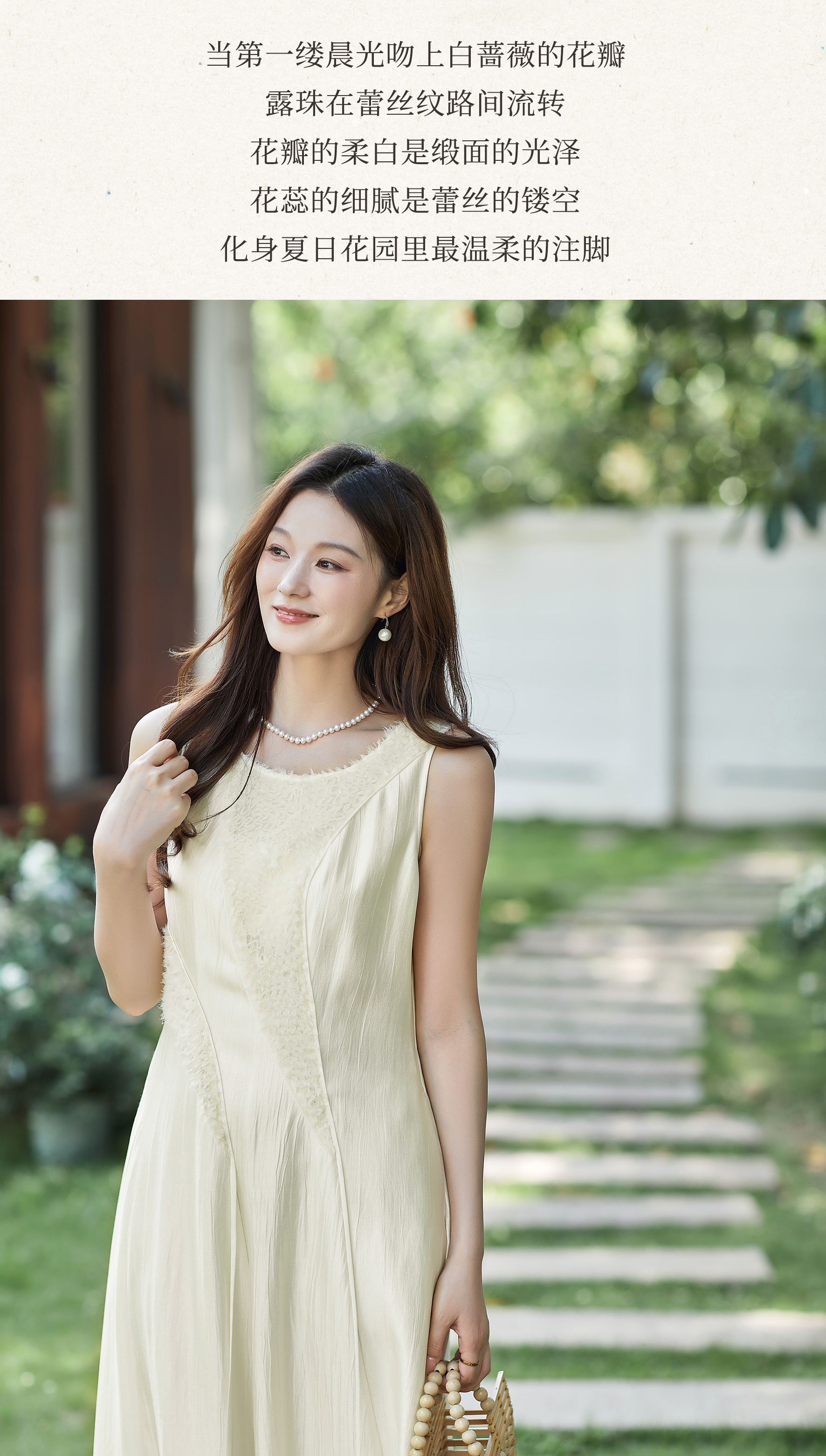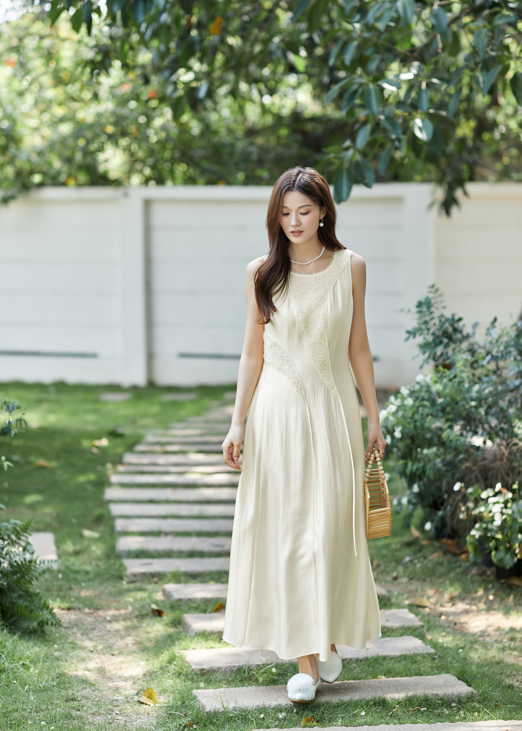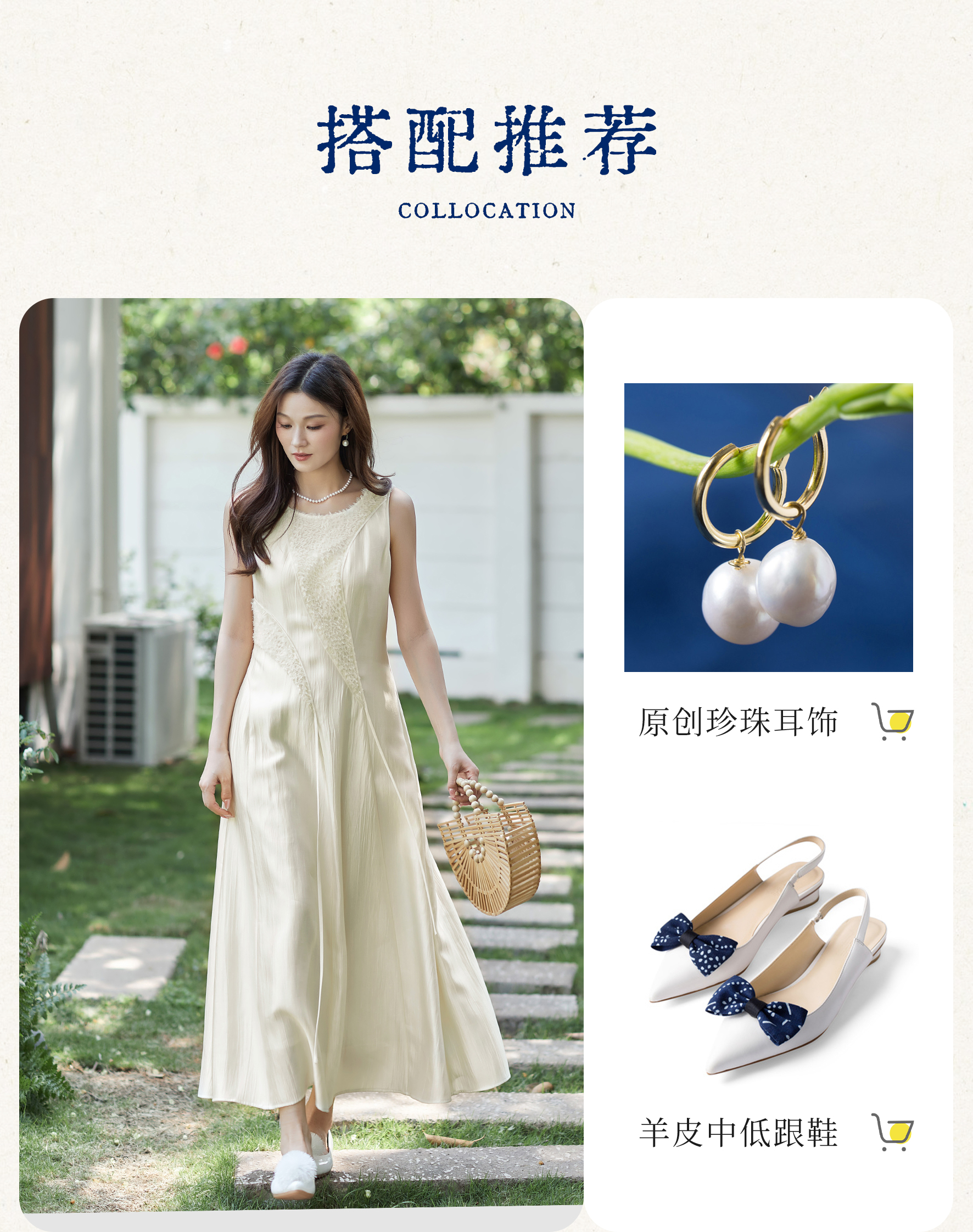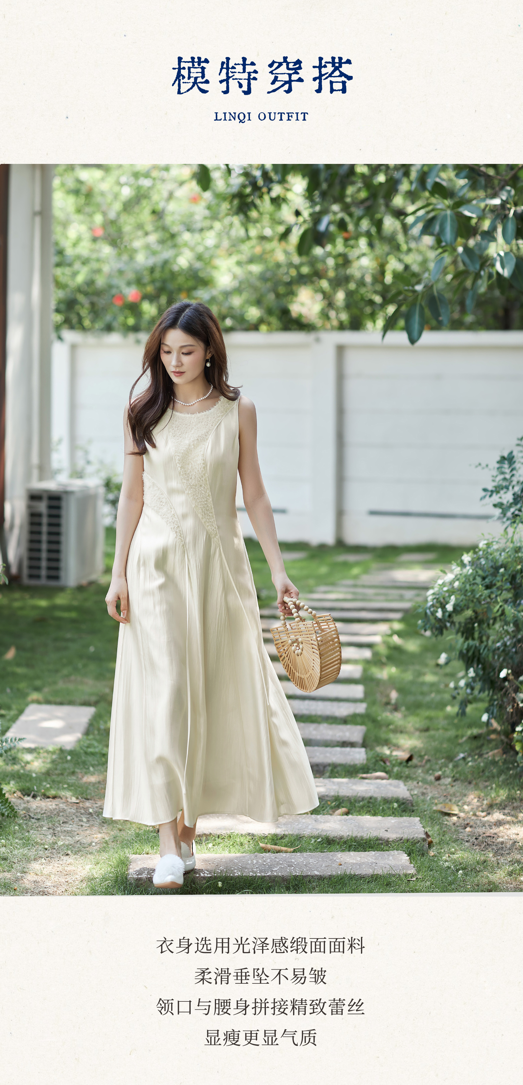 【林栖设计小店】【林栖推荐】新品夏法式复古蕾丝拼接缎面无袖连衣裙N1962236