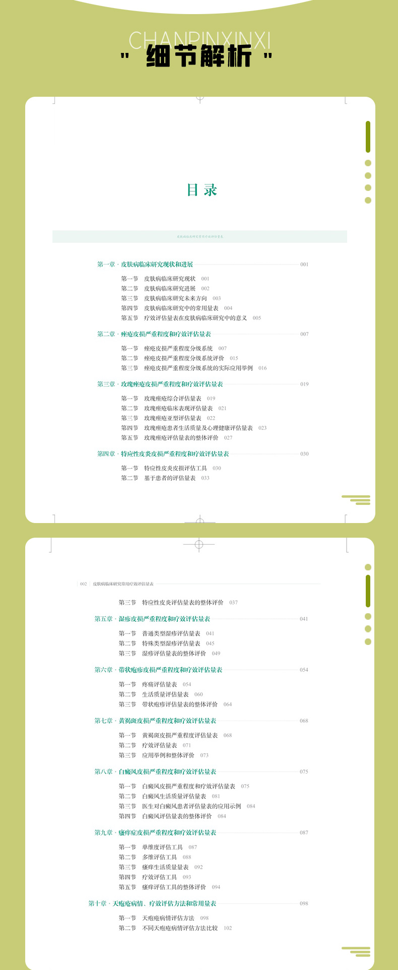本书立足皮肤病学临床研究前沿,针对当前皮肤病诊疗中患者皮损评估和疗效评价工具选择困难的问题,由同济大学医学院、上海中医药大学等权威专家团队联合创作,系统整合了皮肤病临床研究常用的评估量表和工具。本书涵盖了14种临床常见皮肤病(包括痤疮、银屑病、特应性皮炎等),从疾病严重程度、临床表现、生活质量及心理健康等多维度入手,全面梳理各类评价量表,并结合临床实践经验提出专业化的推荐使用建议。本书特色鲜明,注重实用性和可操作性,既可作为皮肤科医师日常诊疗的参考指南,又能为临床科研人员开展规范化研究提供支持,同时也可作为医学生和规培医师的专业工具书。作为一本理论与实践并重的专业图书,本书的出版将有效提升皮肤病临床研究的规范化和科学化水平,对促进皮肤病诊疗与科研的协同发展具有重要参考价值。