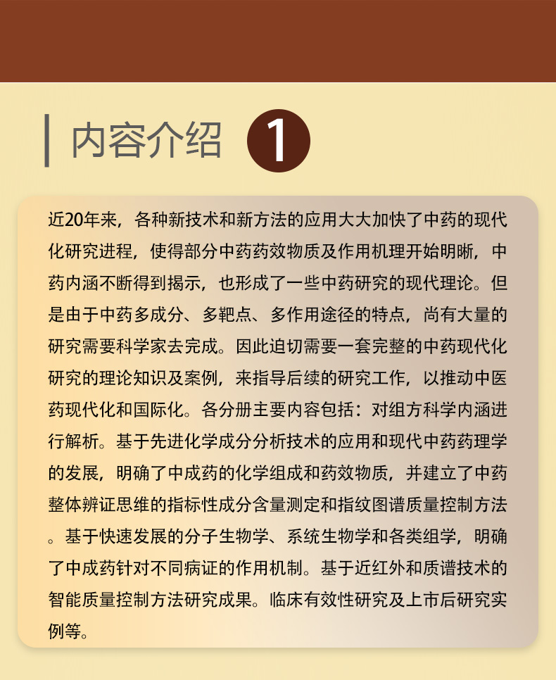 近20年来,各种新技术和新方法的应用大大加快了中药的现代化研究进程,使得部分中药药效物质及作用机理开始明晰,中药内涵不断得到揭示,也形成了一些中药研究的现代理论。但是由于中药多成分、多靶点、多作用途径的特点,尚有大量的研究需要科学家去完成。因此迫切需要一套完整的中药现代化研究的理论知识及案例,来指导后续的研究工作,以推动中医药现代化和国际化。各分册主要内容包括:对组方科学内涵进行解析。基于先进化学成分分析技术的应用和现代中药药理学的发展,明确了中成药的化学组成和药效物质,并建立了中药整体辨证思维的指标性成分含量测定和指纹图谱质量控制方法。基于快速发展的分子生物学、系统生物学和各类组学,明确了中成药针对不同病证的作用机制。基于近红外和质谱技术的智能质量控制方法研究成果。临床有效性研究及上市后研究实例等。