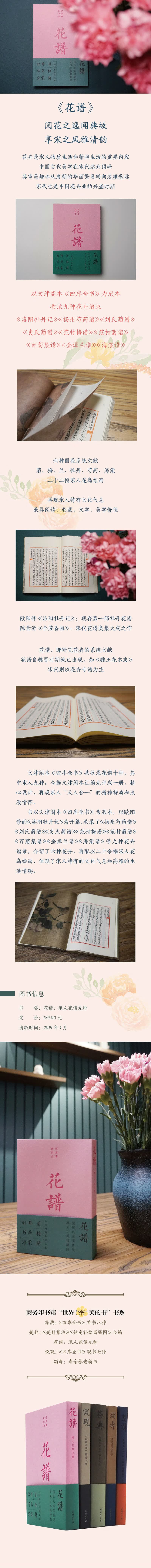 欧阳修等著的这本《花谱》以文津阁本《四库全书》为底本,收录了《洛阳牡丹记》《扬州芍药谱》《刘氏菊谱》《史氏菊谱》《范村梅谱》《范村菊谱》《百菊集谱》《金漳兰谱》《海棠谱》等九种花卉谱录。