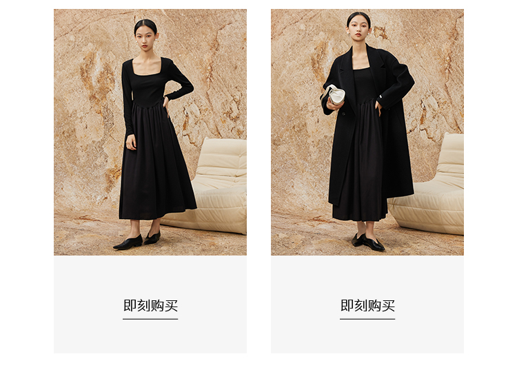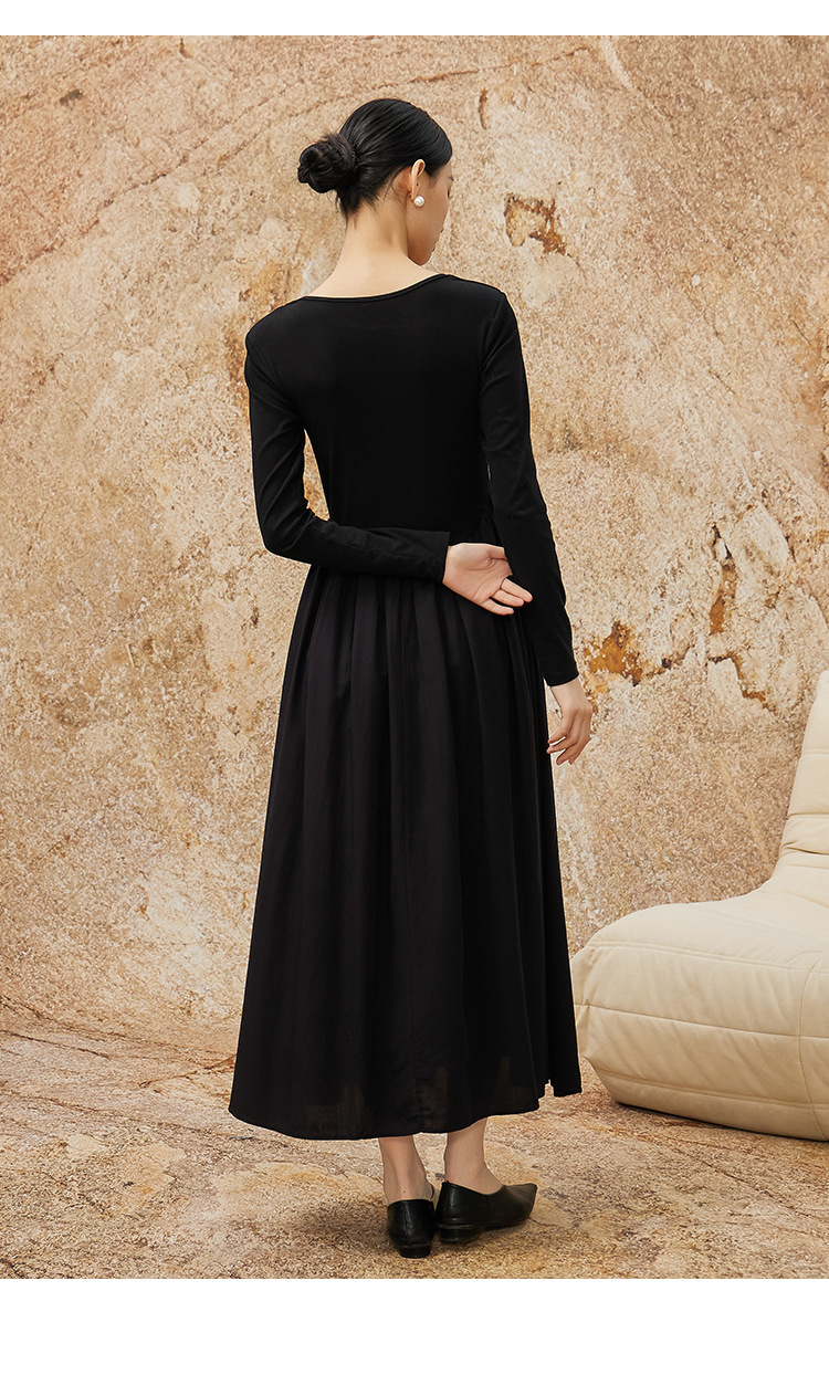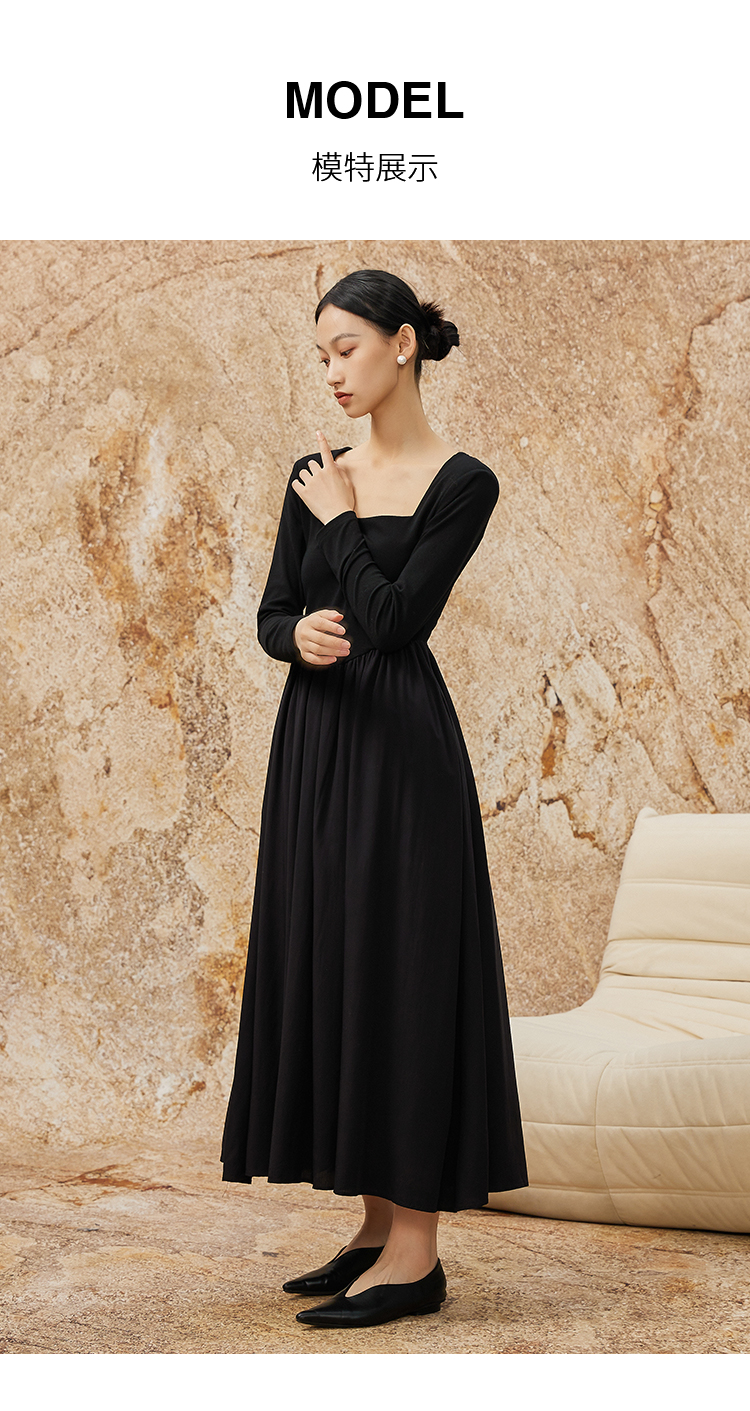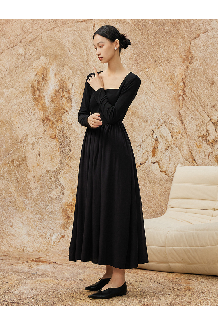 NUTS秋冬款气质修身方领显瘦高腰A字黑色长袖连衣裙女342102290
