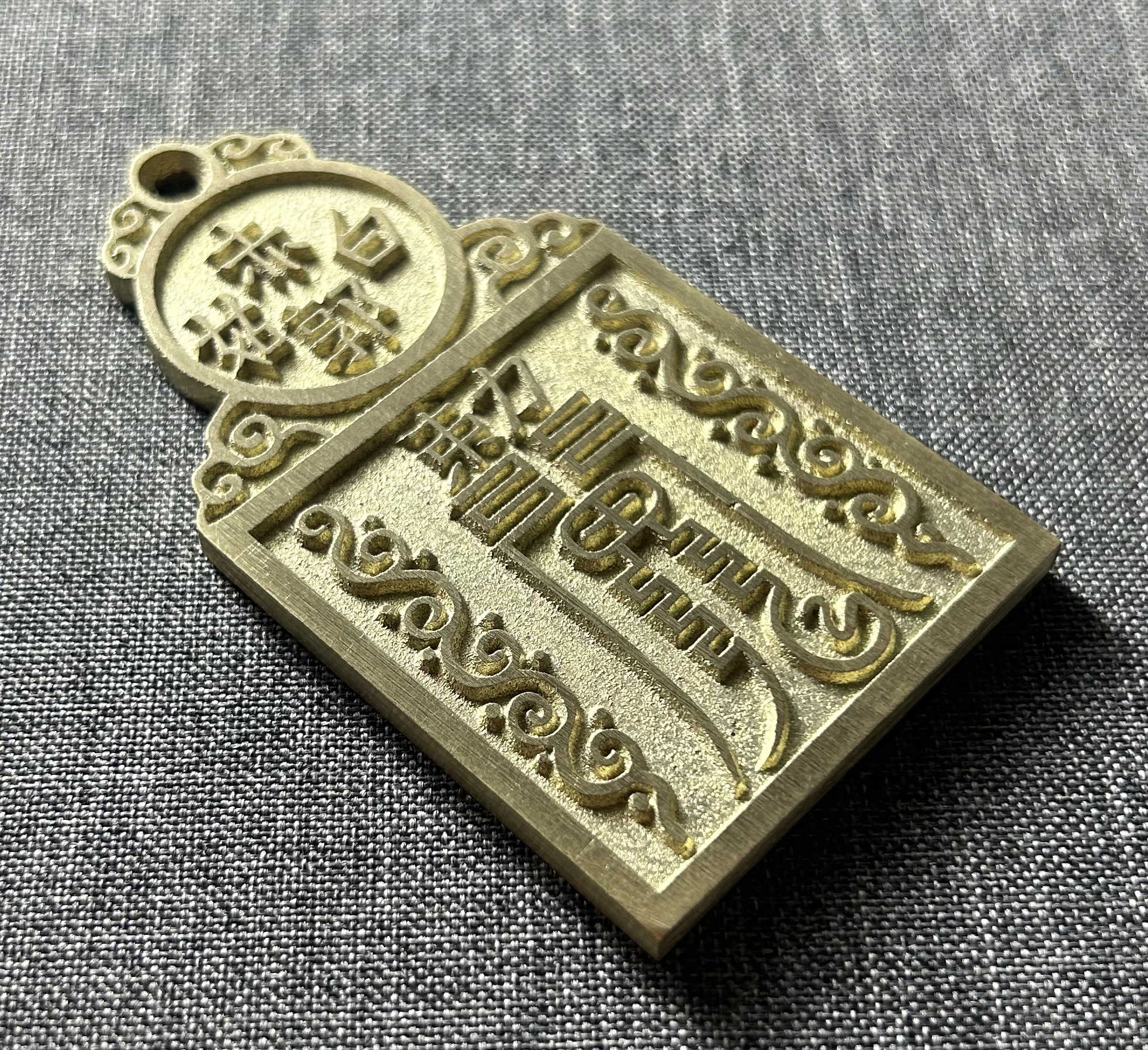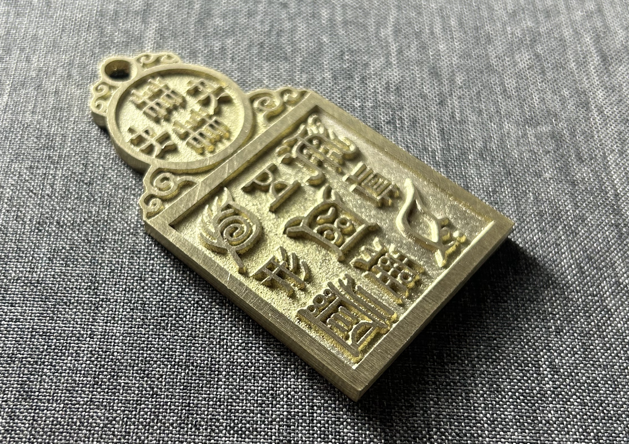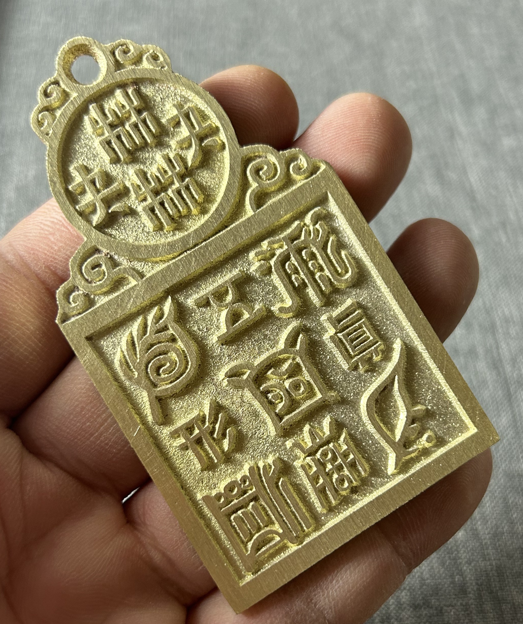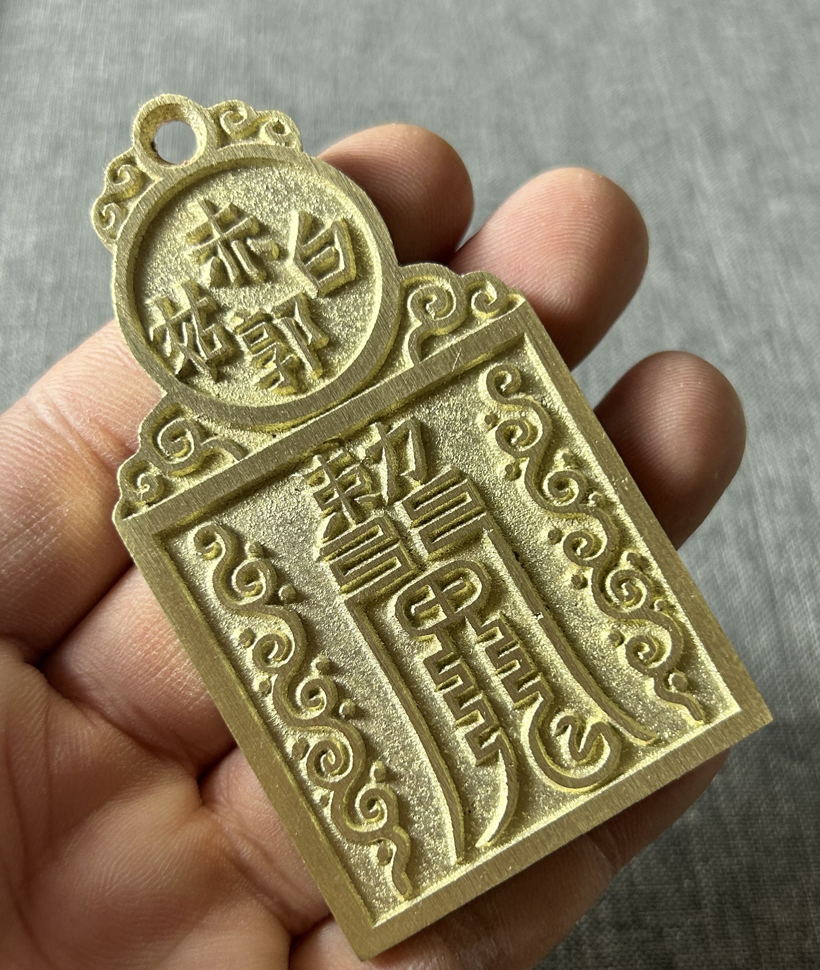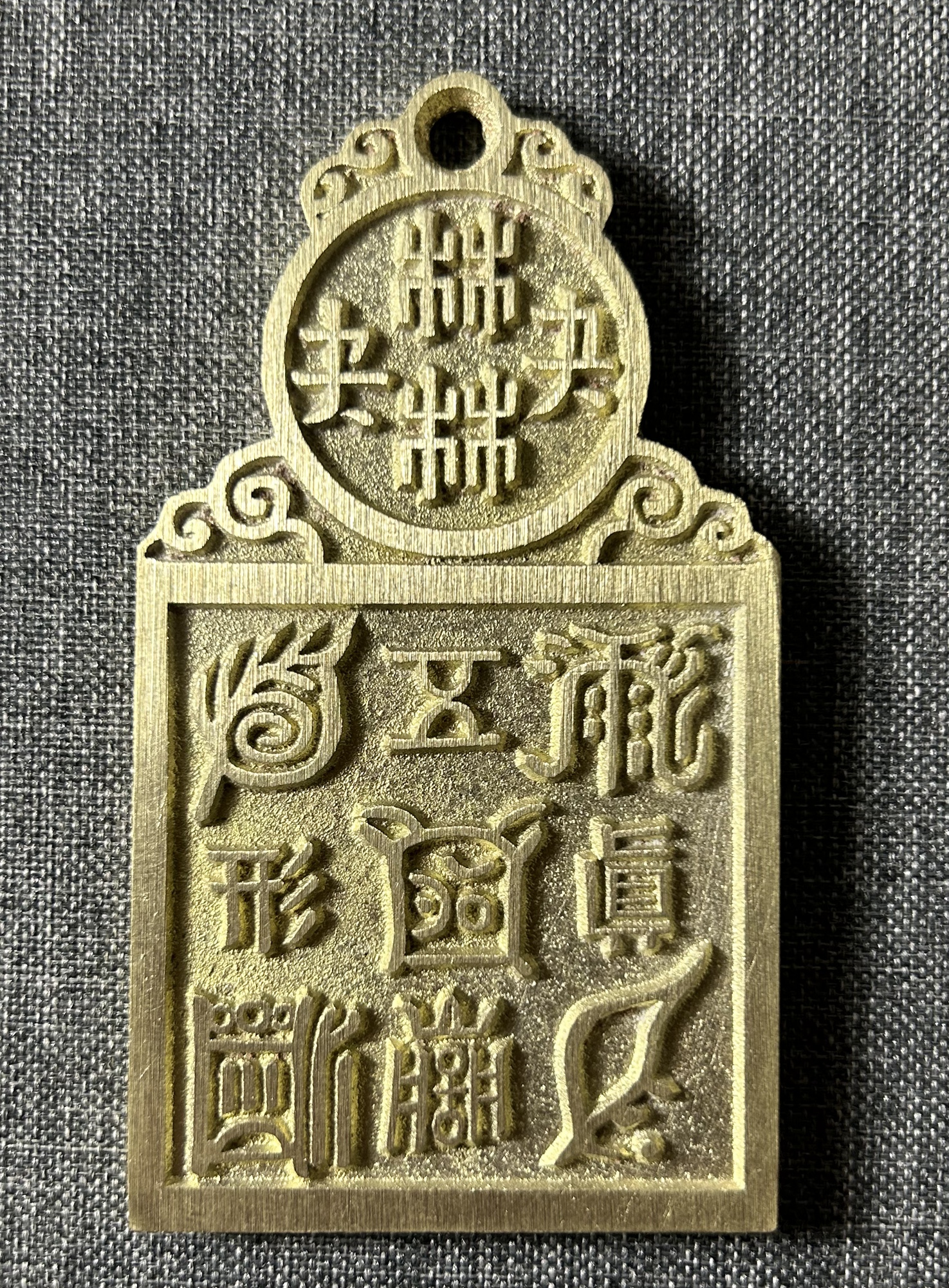 长约85.8毫米,直径约47.8毫米,厚约4.0毫米,重约85.7克(手工作品有少许误差,请知晓)。 五岳真形图,即用五个符号,分别代表五座大山。据《藏经》记载:“五岳之神,分掌世间人物,各有所属。如:泰山乃天地之孙,群灵之府,为五岳祖,主掌人间生死贵贱修短。衡岳主掌星象、分野、水族鱼龙。嵩岳主掌土地山川,牛羊食。华岳主掌金银铜铁,飞走蠢动。恒岳主掌江河淮济,四足负荷等事。”因此这五个符号,不仅见于书目抄绘,更见于诸器,如饰物、钱币、鼎器、砚台、石碑。目的是为了驱魔避邪,以求得居家安乐,永保祯祥