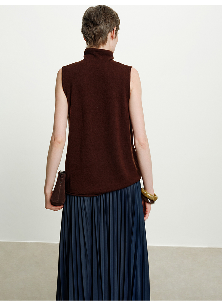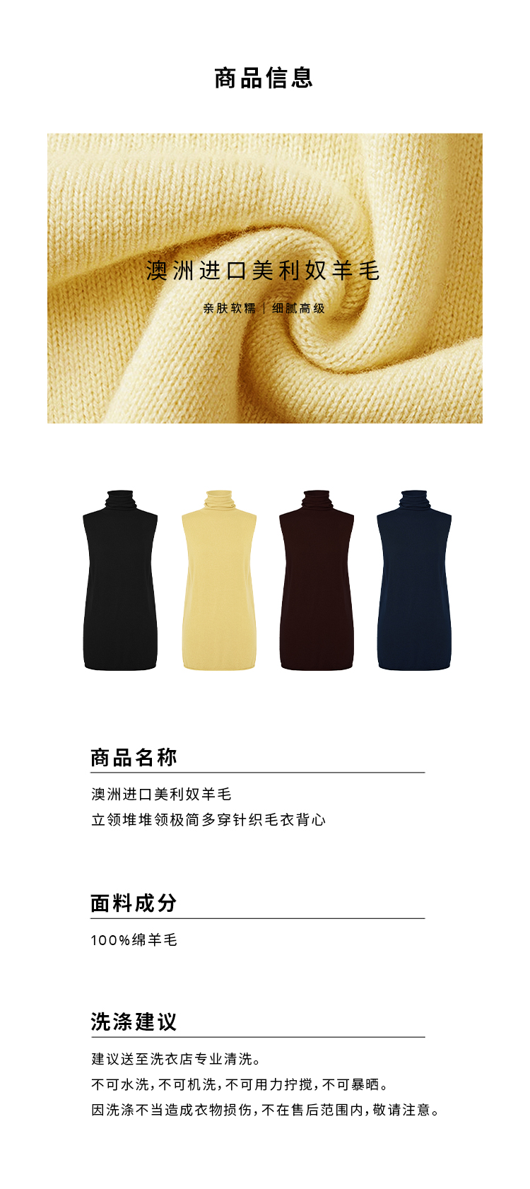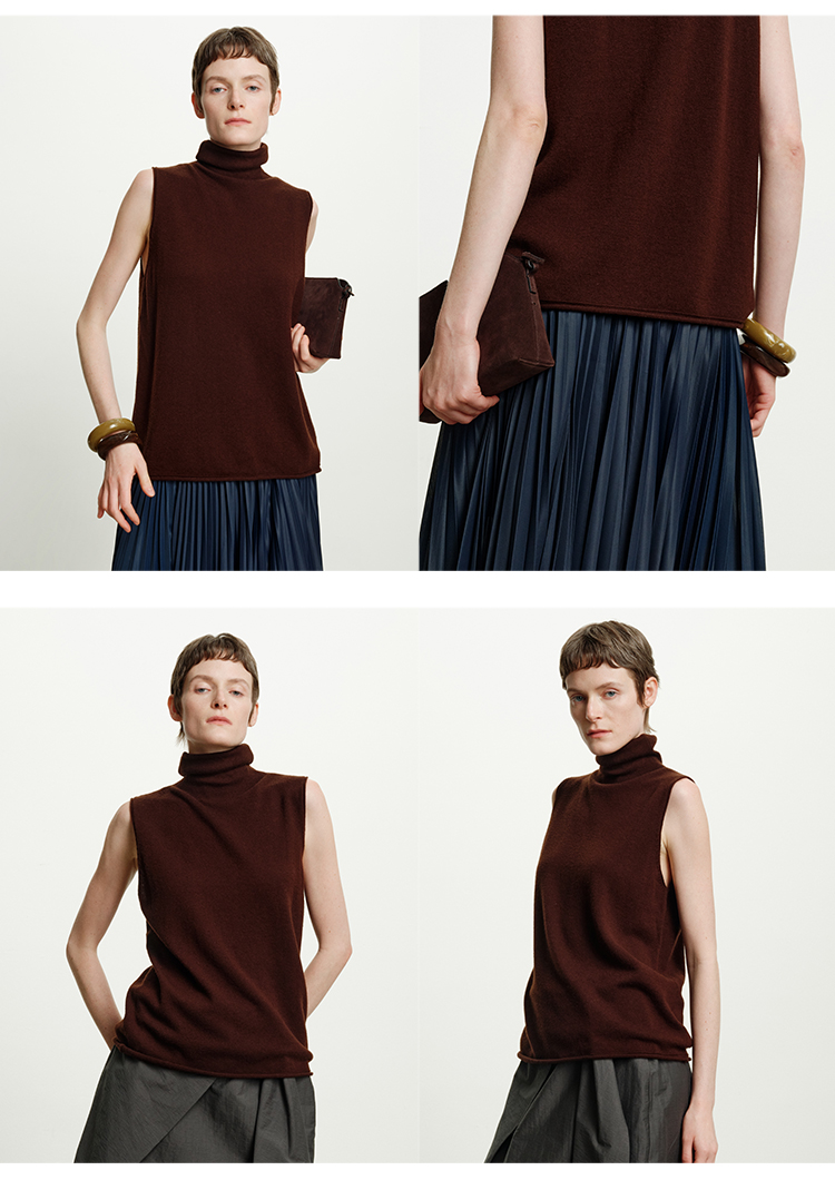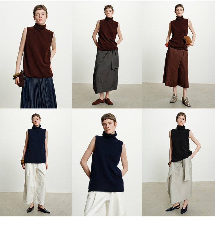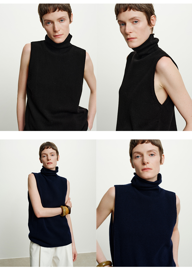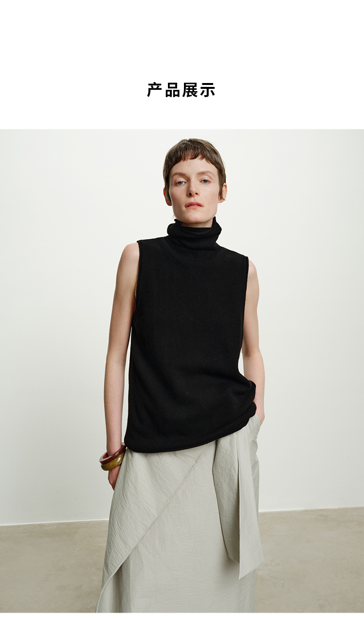 HIDEMI 澳洲进口美利奴羊毛立领堆堆领极简多穿针织毛衣背心 深藏蓝/巧克力色/黑色/奶油黄